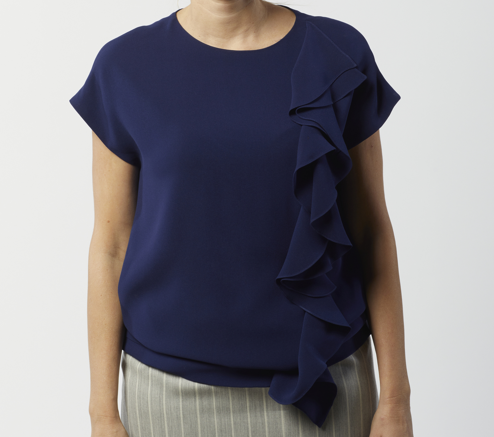 DIOR CHRISTIAN (1905 - 1957) Maglia con volant in seta blu scura. Seta. . Maglia in tessuto di seta blu scuro con elemento a volant sulla parte frontale, a destra, maniche corte, chiusura a zip sul retro, etichetta Christian Dior /Paris. Taglia M.