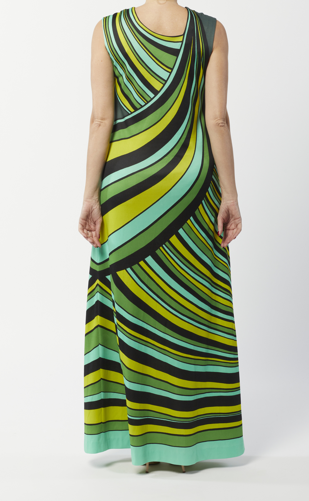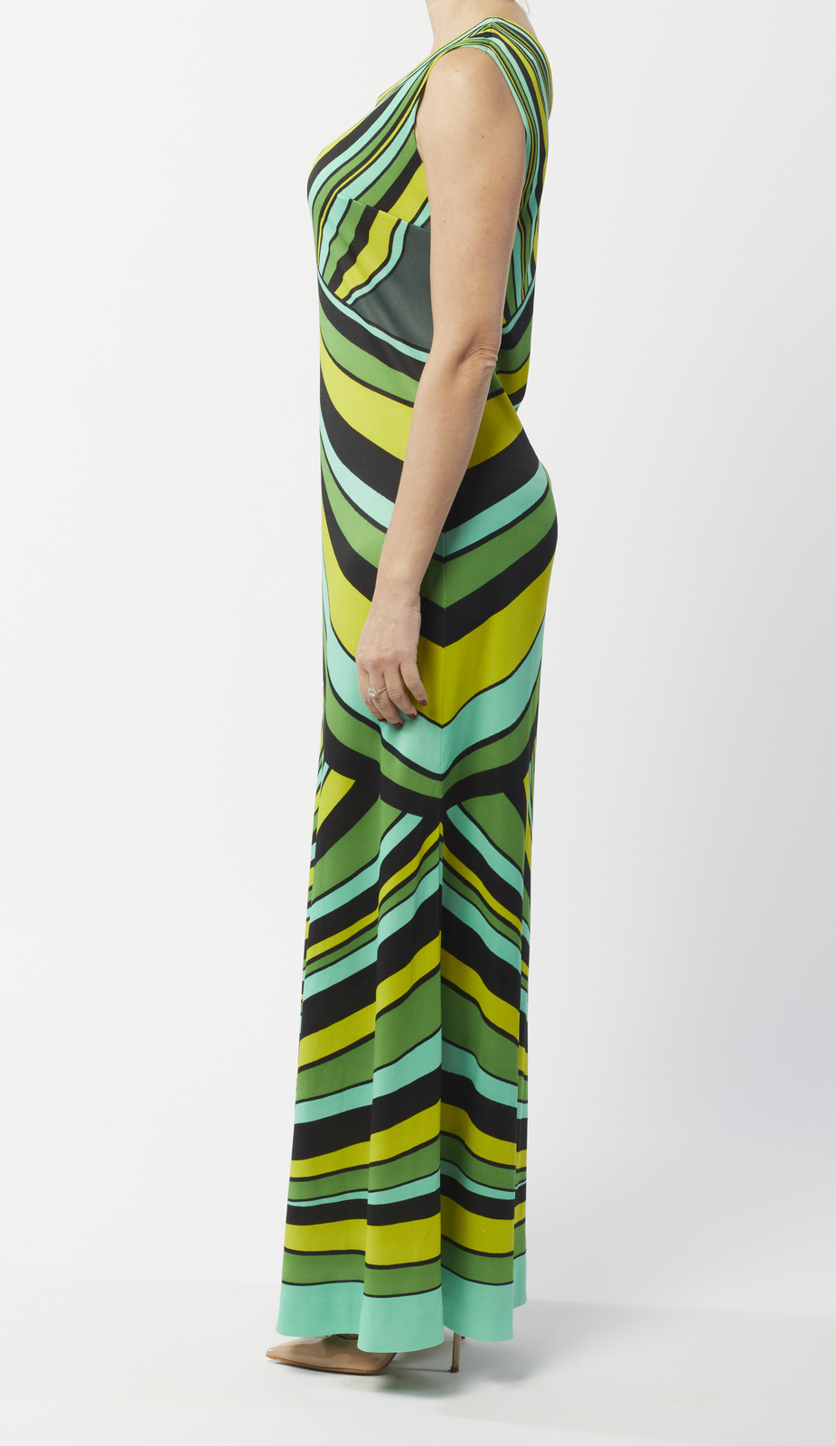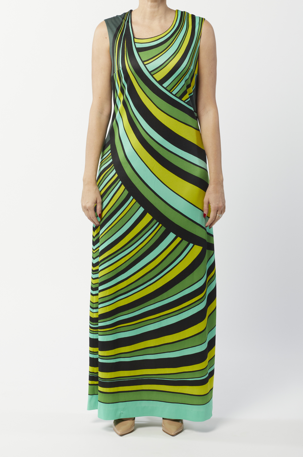 DI CAMERINO ROBERTA (1920 - 2010) Abito lungo a righe nei toni del verde. Jersey. . Abito lungo in jersey Roberta di Camerino, stampa a righe ondulate nei toni del verde, verde acqua, giallo, nero, scollo rotondo, senza maniche, etichetta presente.
