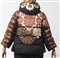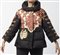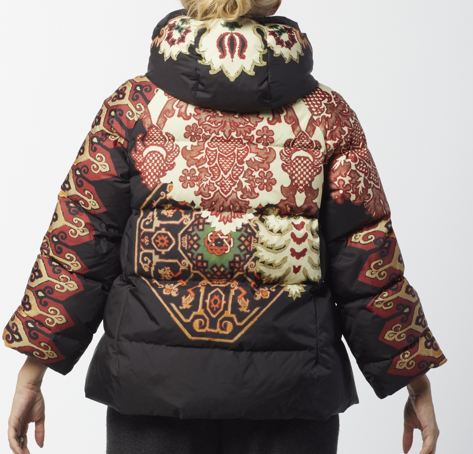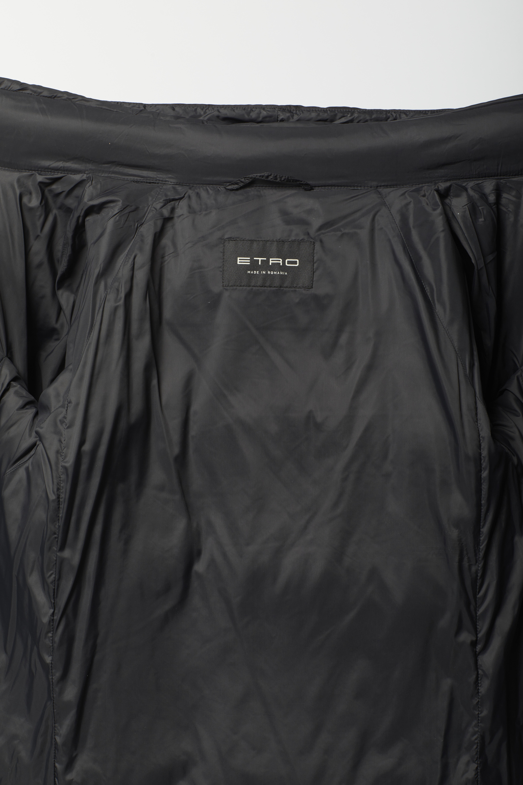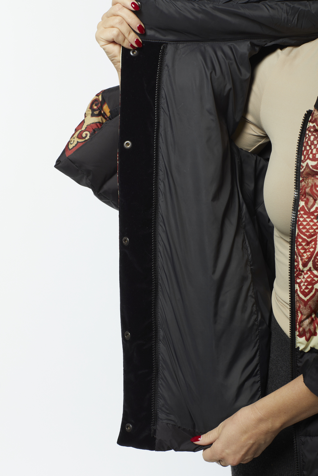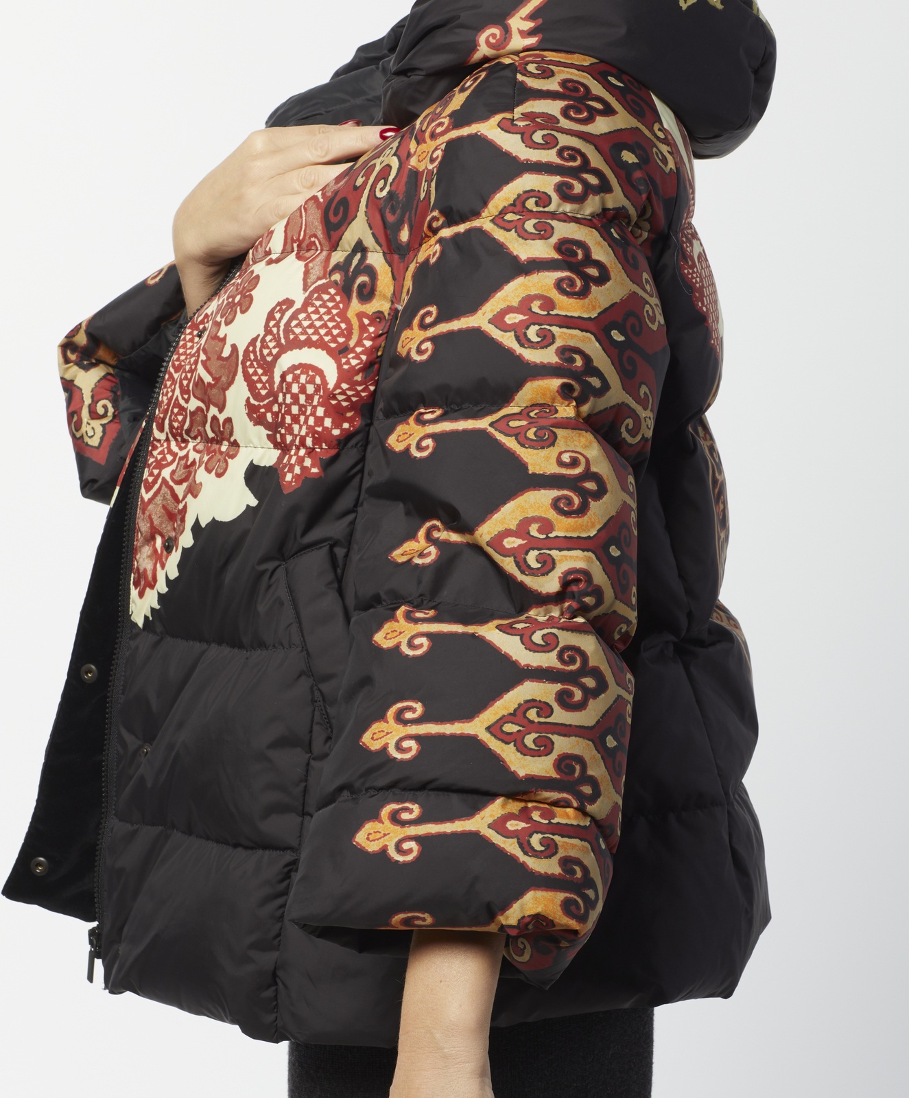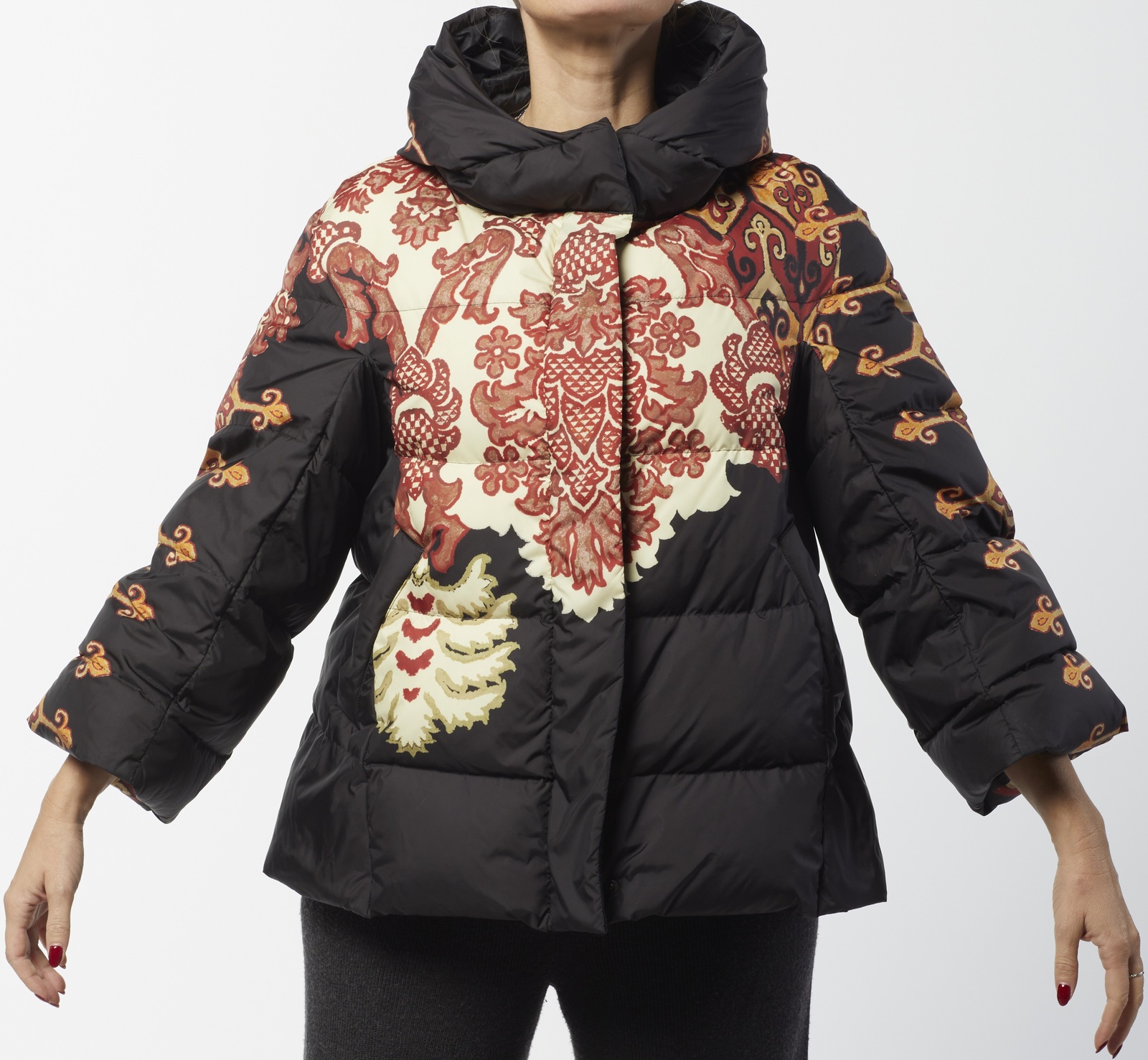 ETRO Piumino multicolor su fondo nero. Poliestere. . Piumino Etro vintage con fantasia multicolore sul fronte e sul retro, lungo entrambe le maniche, nei toni del mattone, bianco e giallo oro inspirata alla fantasia a melograno rinascimentale, chiusura a zip e bottoni, collo ad anello, etichetta Etro. Taglia M 44It.