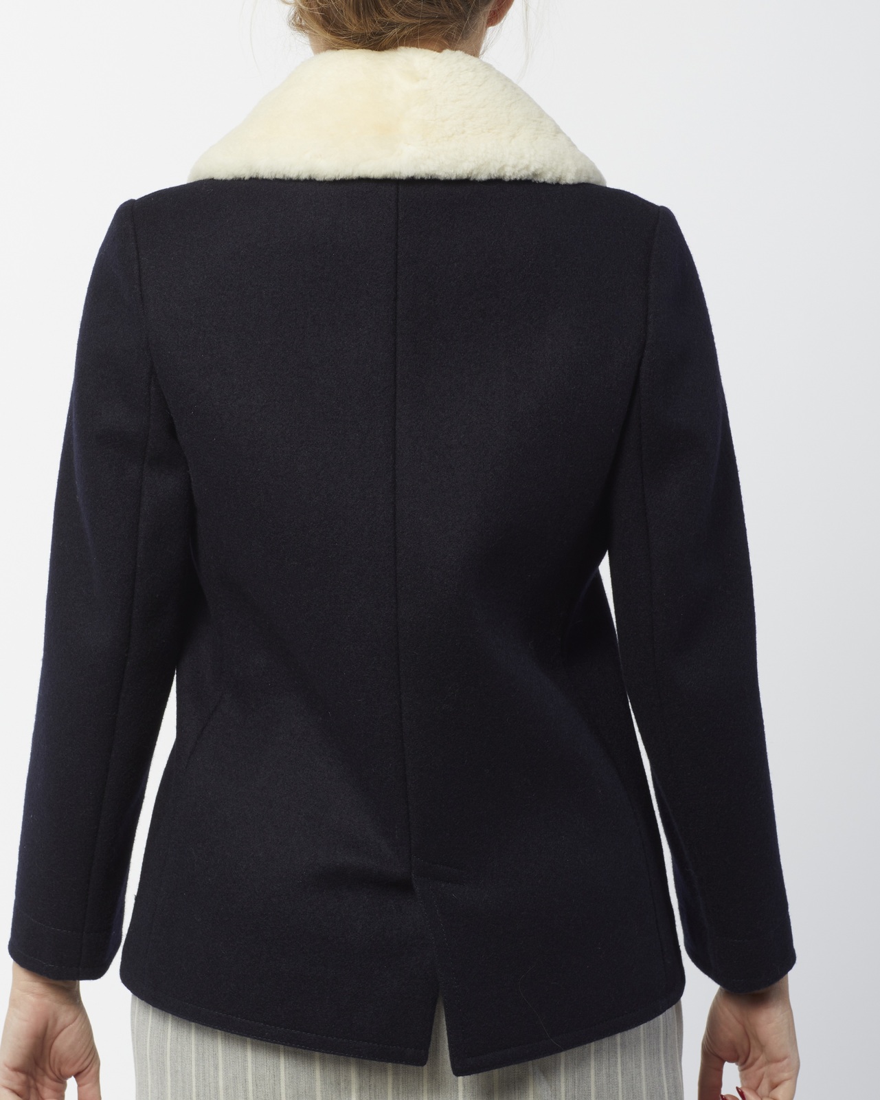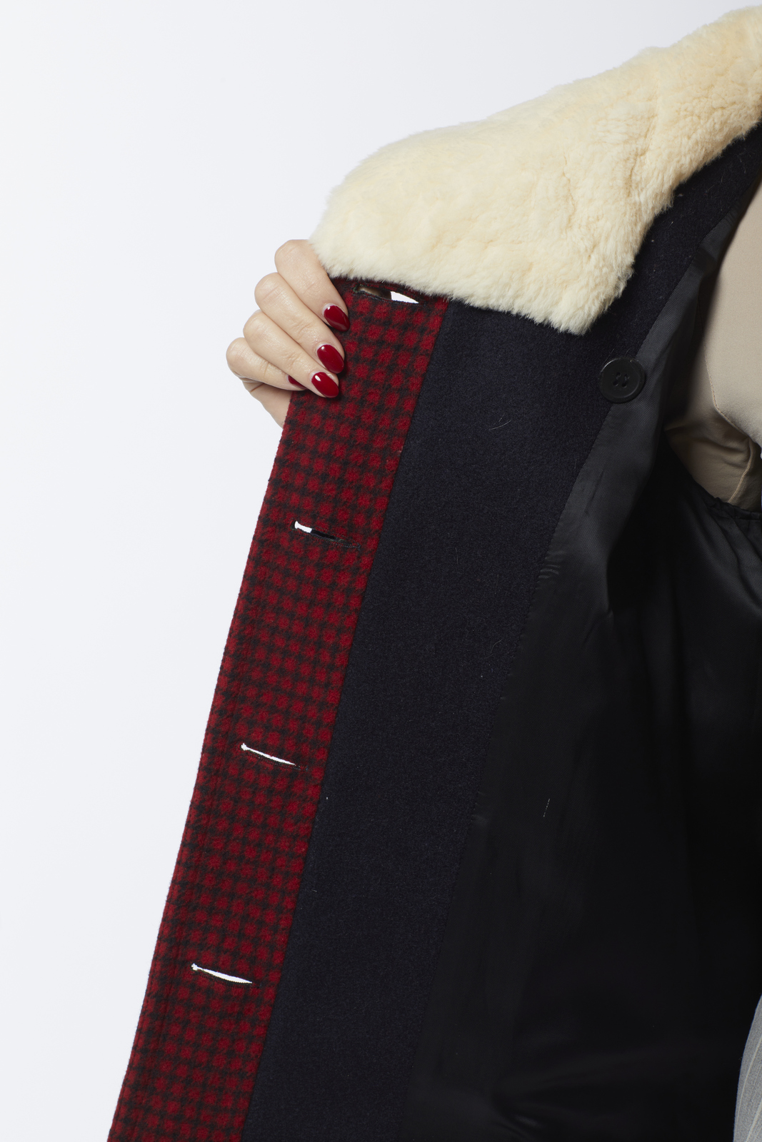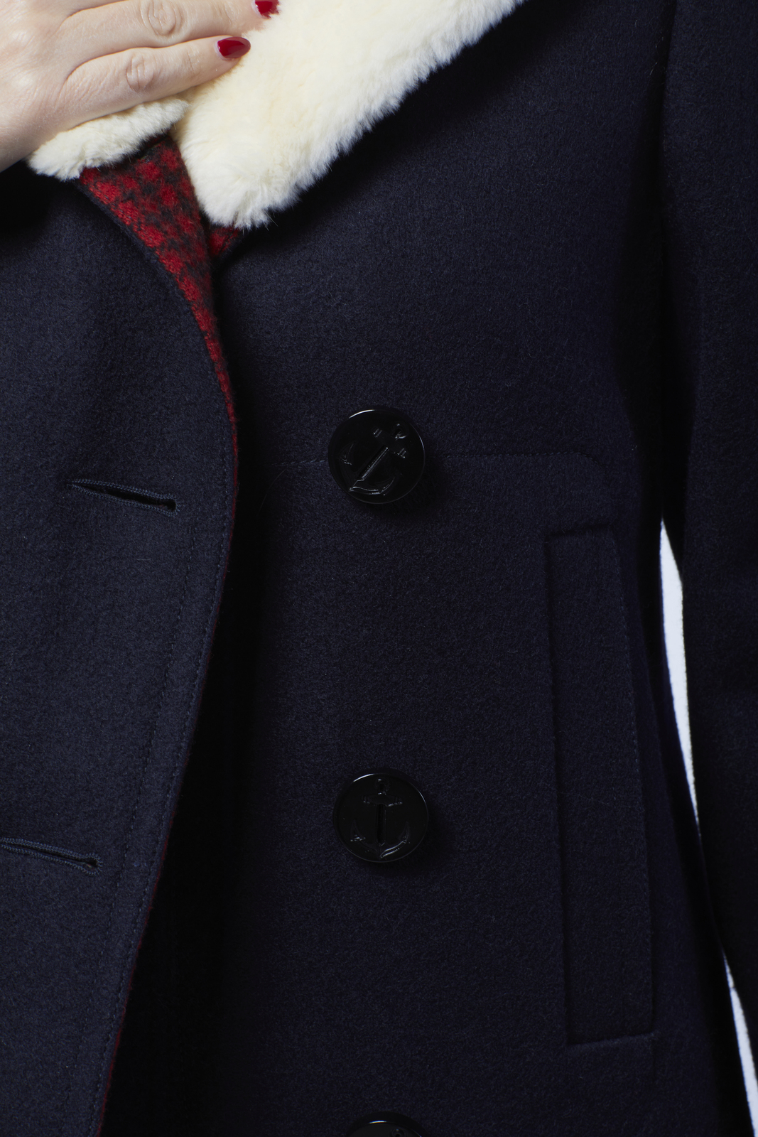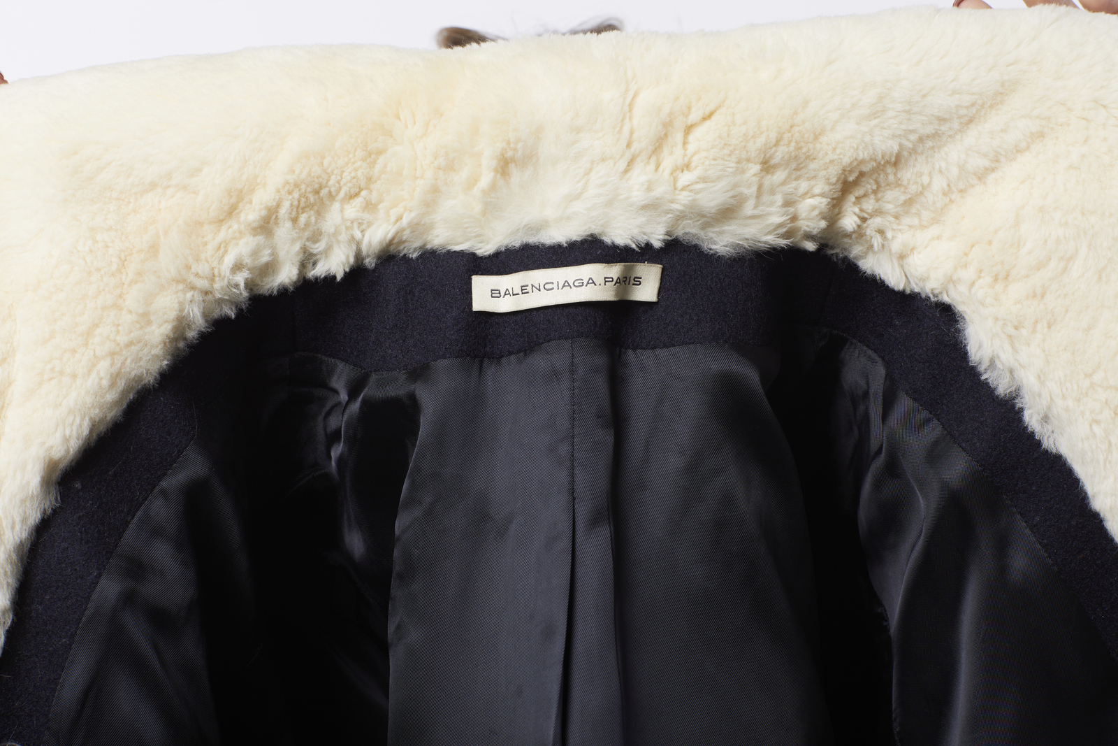 BALENCIAGA Cappotto corto in lana e collo in pelliccia beige. lana. . Cappottino doppio petto Balenciaga vintage in lana nera, 6 bottoni decorati da incisione con motivo di ancora marina, collo in pelliccia bianca a contrasto, profilo interno in lana a motivo a quadri neri e rossi, etichetta Balenciaga Paris. Taglia IT38.
