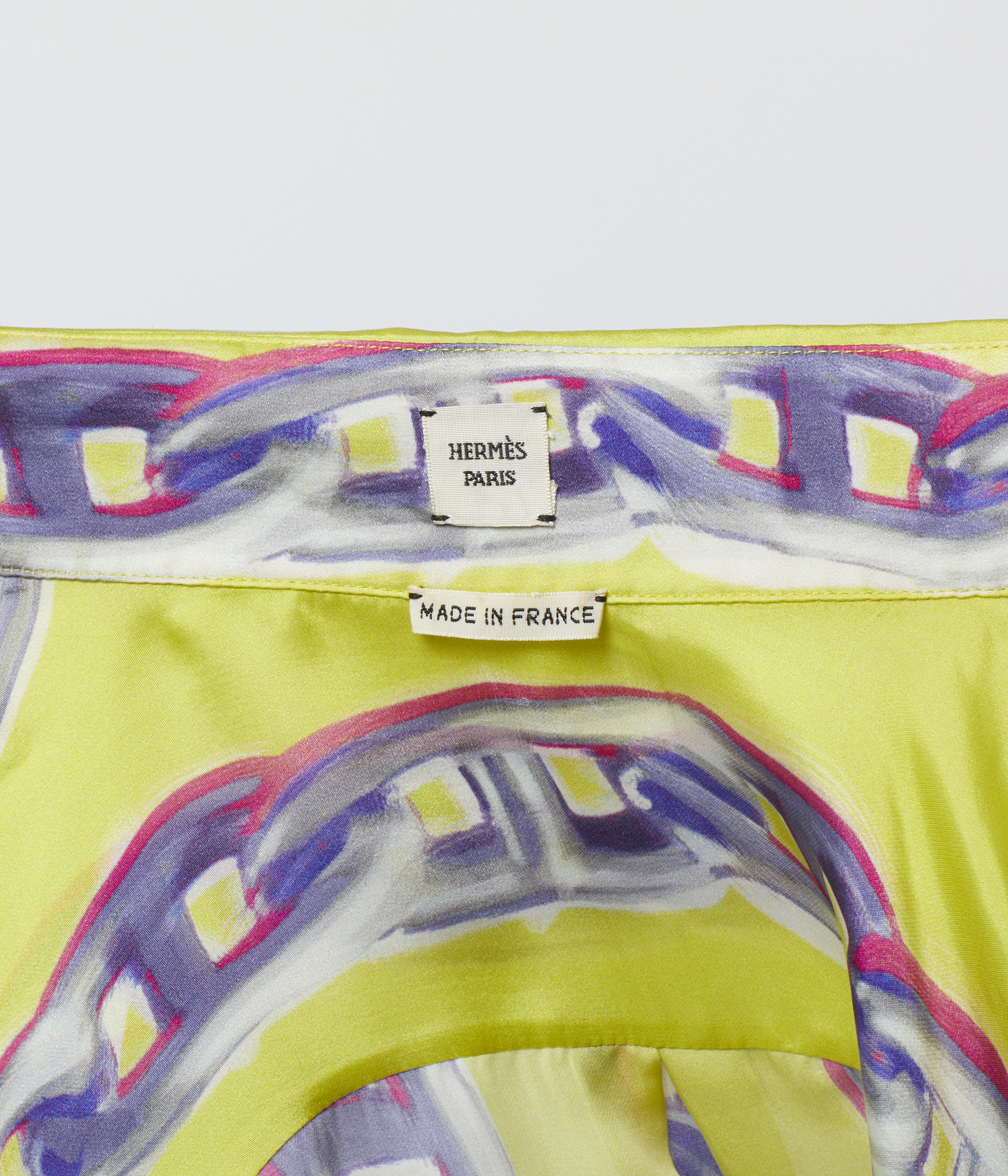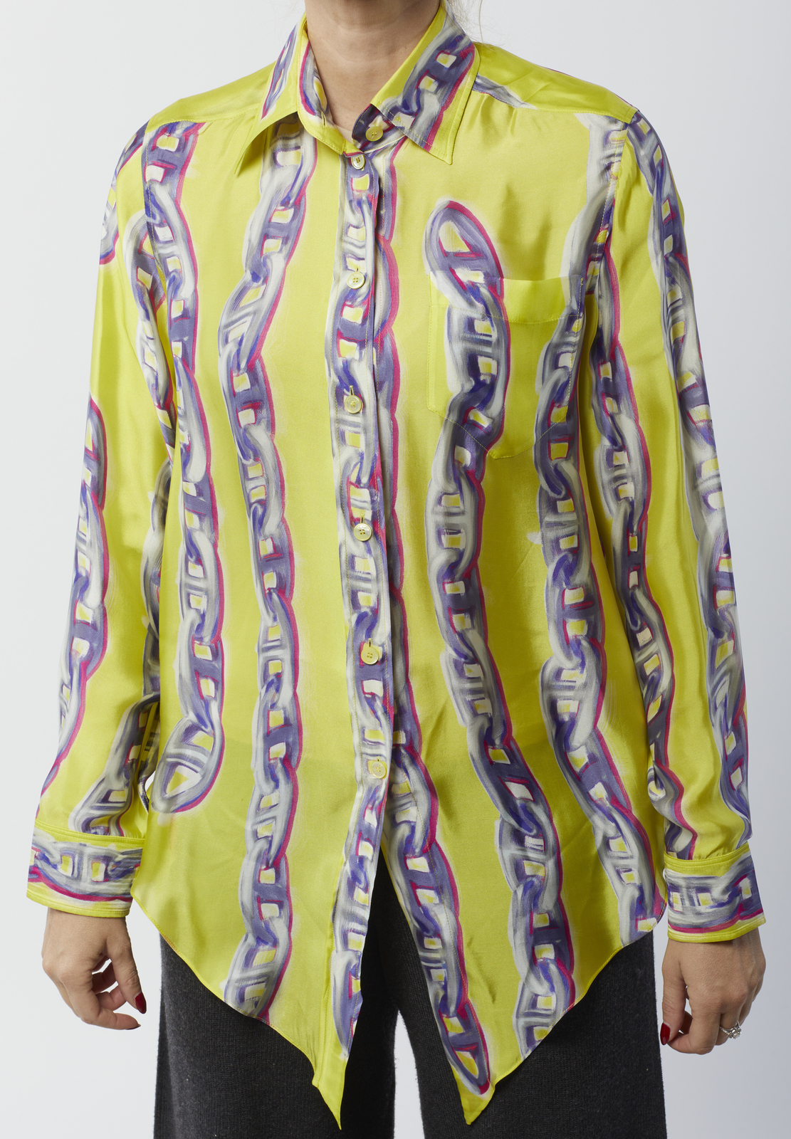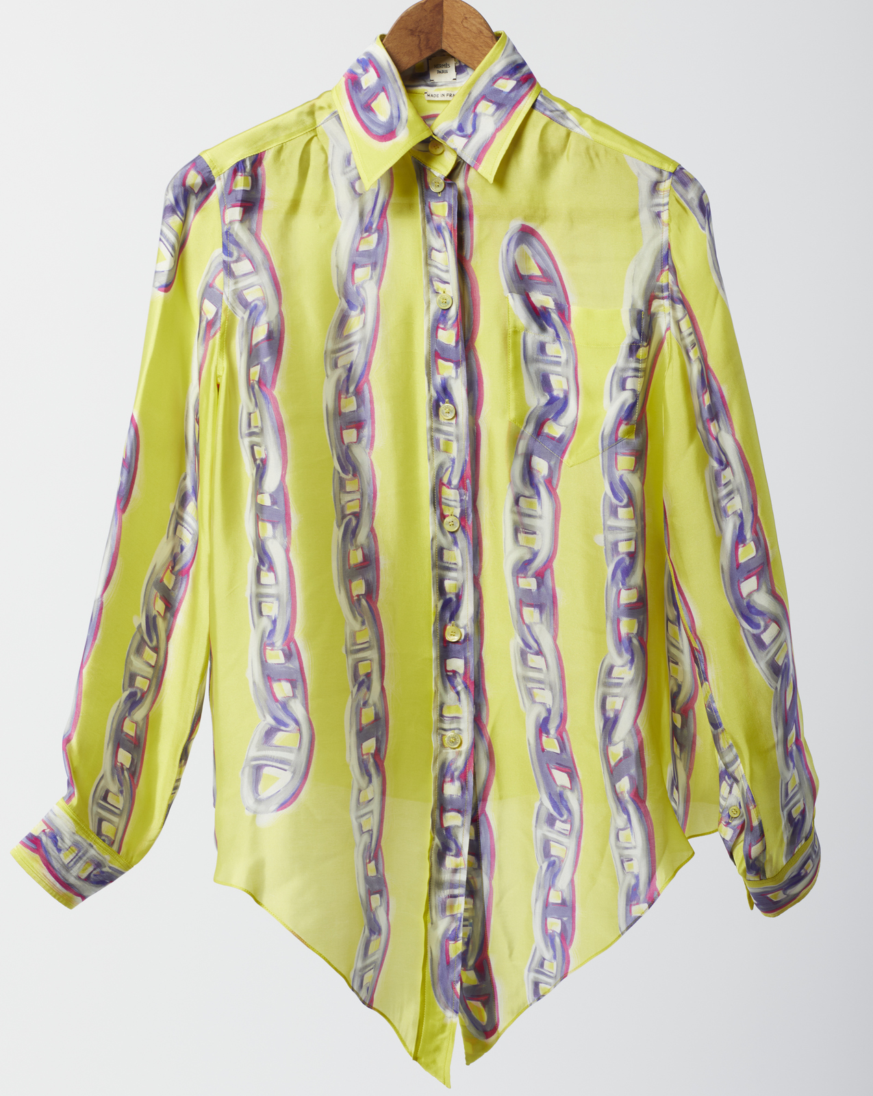 HERMES Camicia in seta stampata gialla. Seta. . Camicia in seta gialla stampata con motivo Chaines d'Ancre, a maniche lunghe, etichetta Hermès/ Paris, Made in France. Size 38 FR, IT 42.
