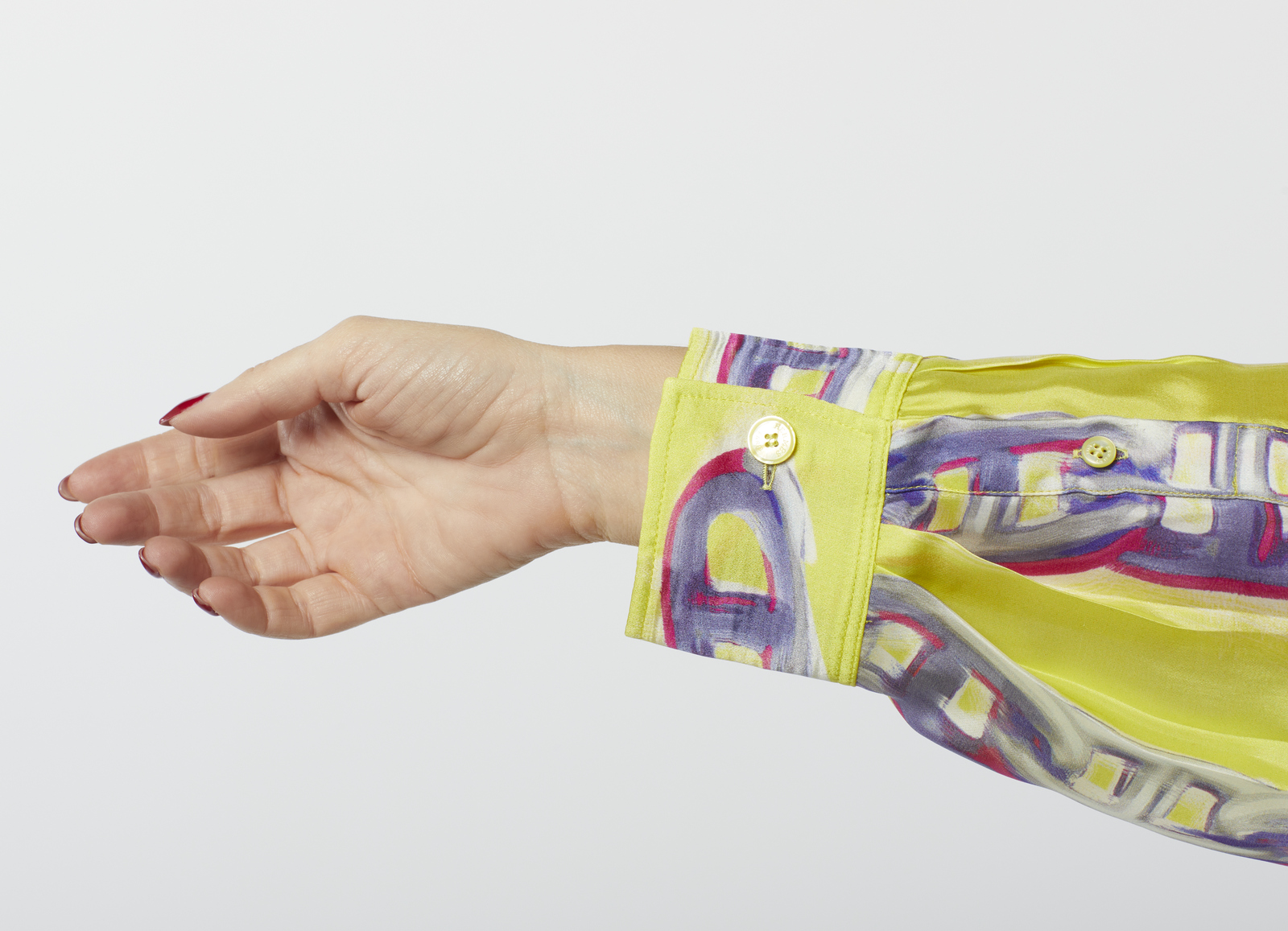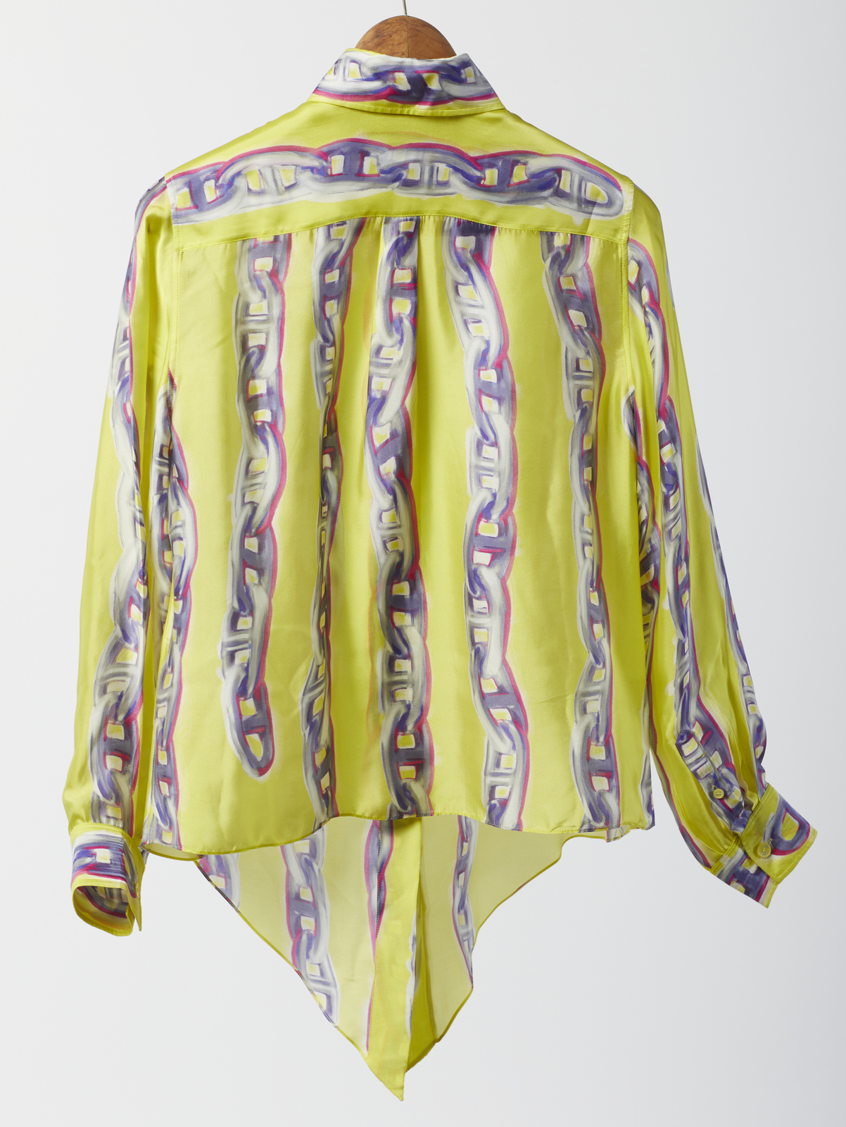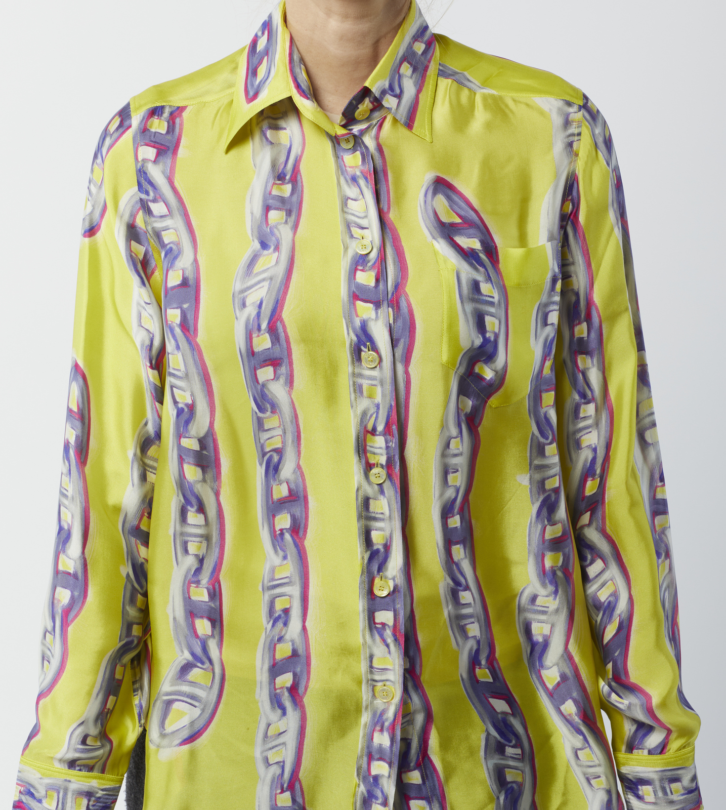 HERMES Camicia in seta stampata gialla. Seta. . Camicia in seta gialla stampata con motivo Chaines d'Ancre, a maniche lunghe, etichetta Hermès/ Paris, Made in France. Size 38 FR, IT 42.