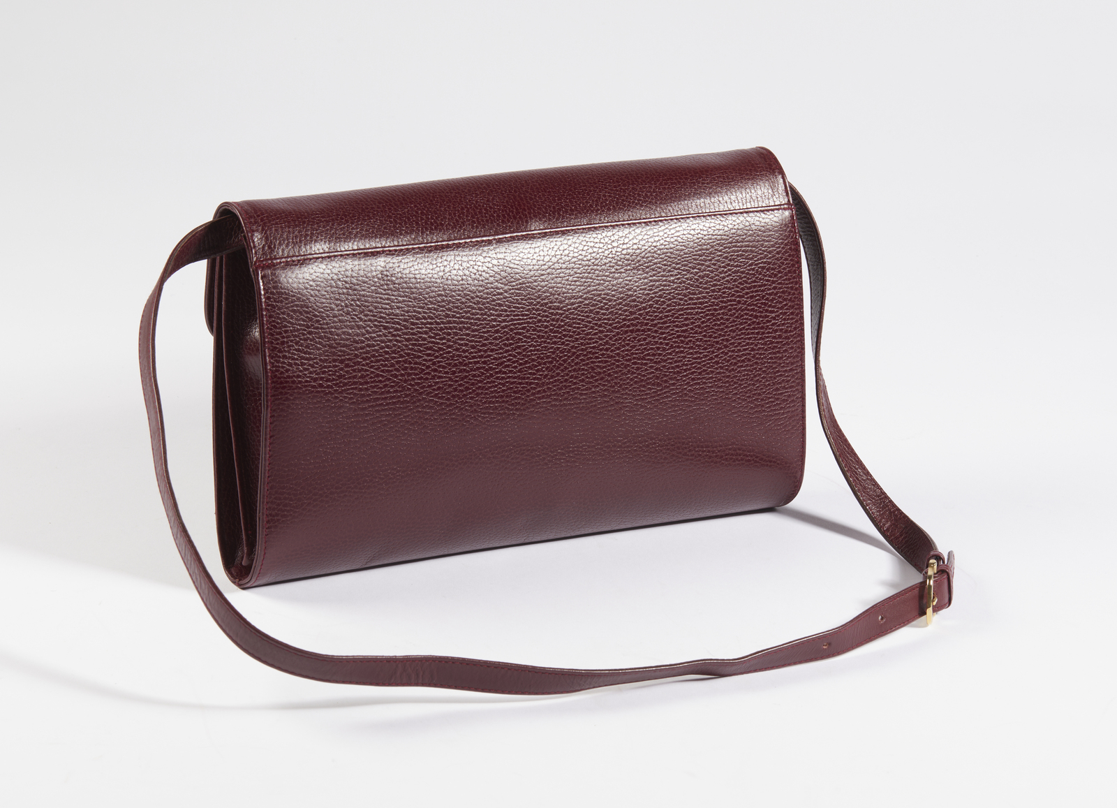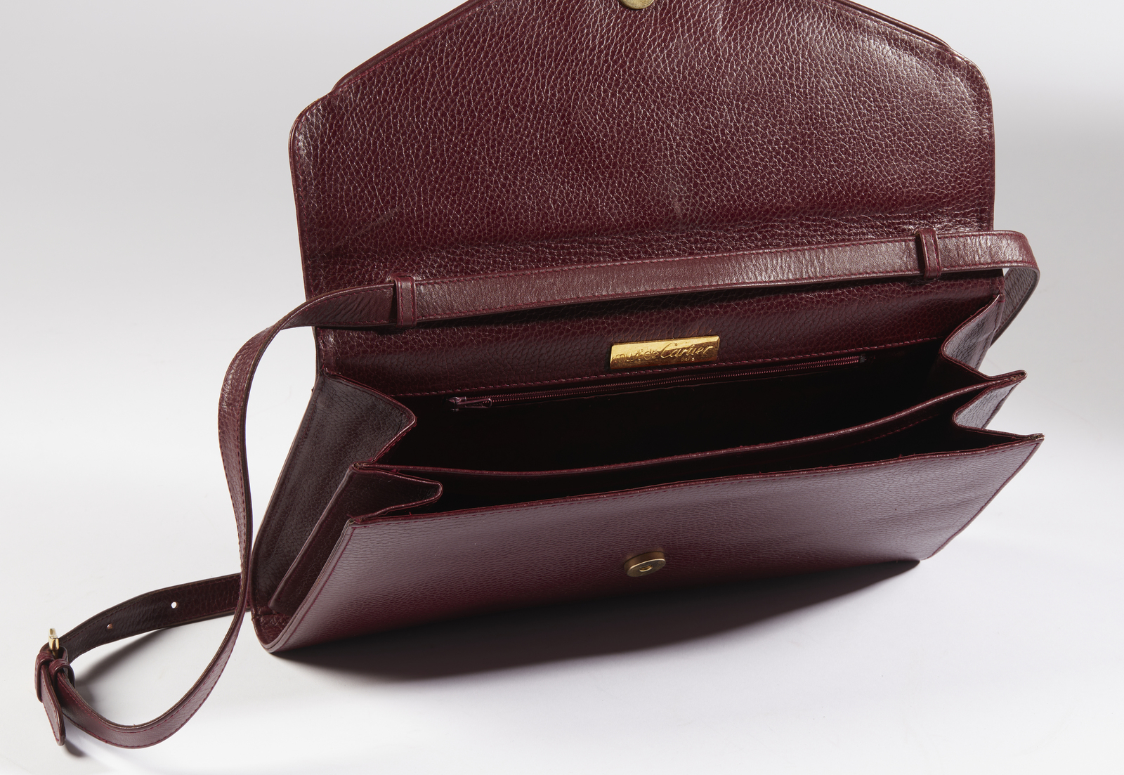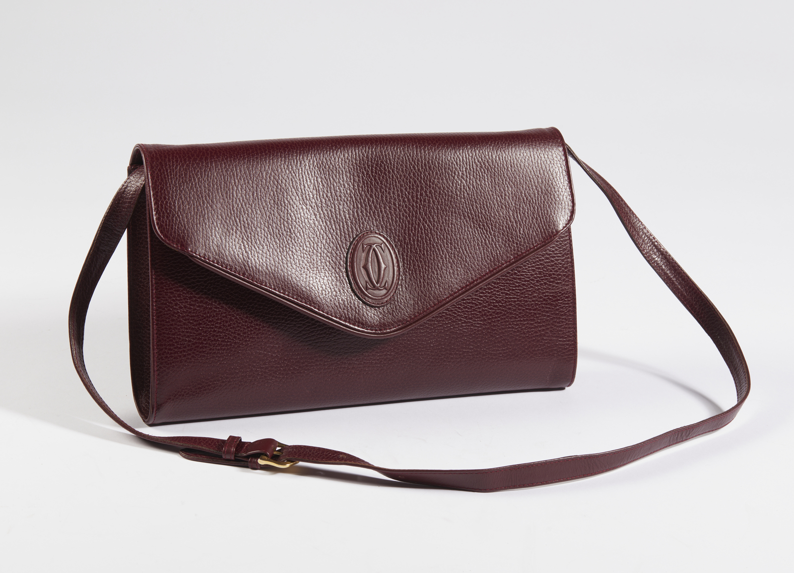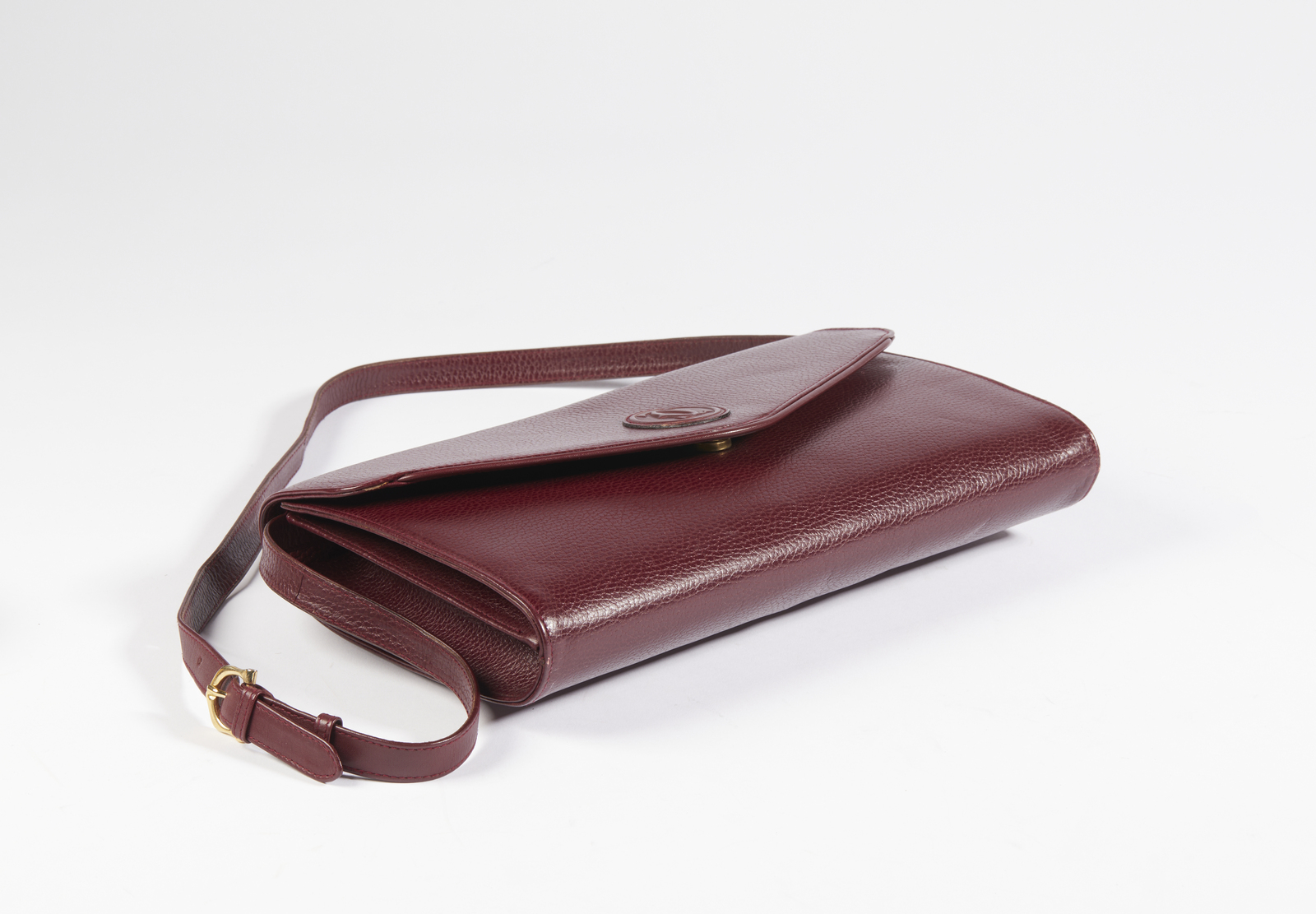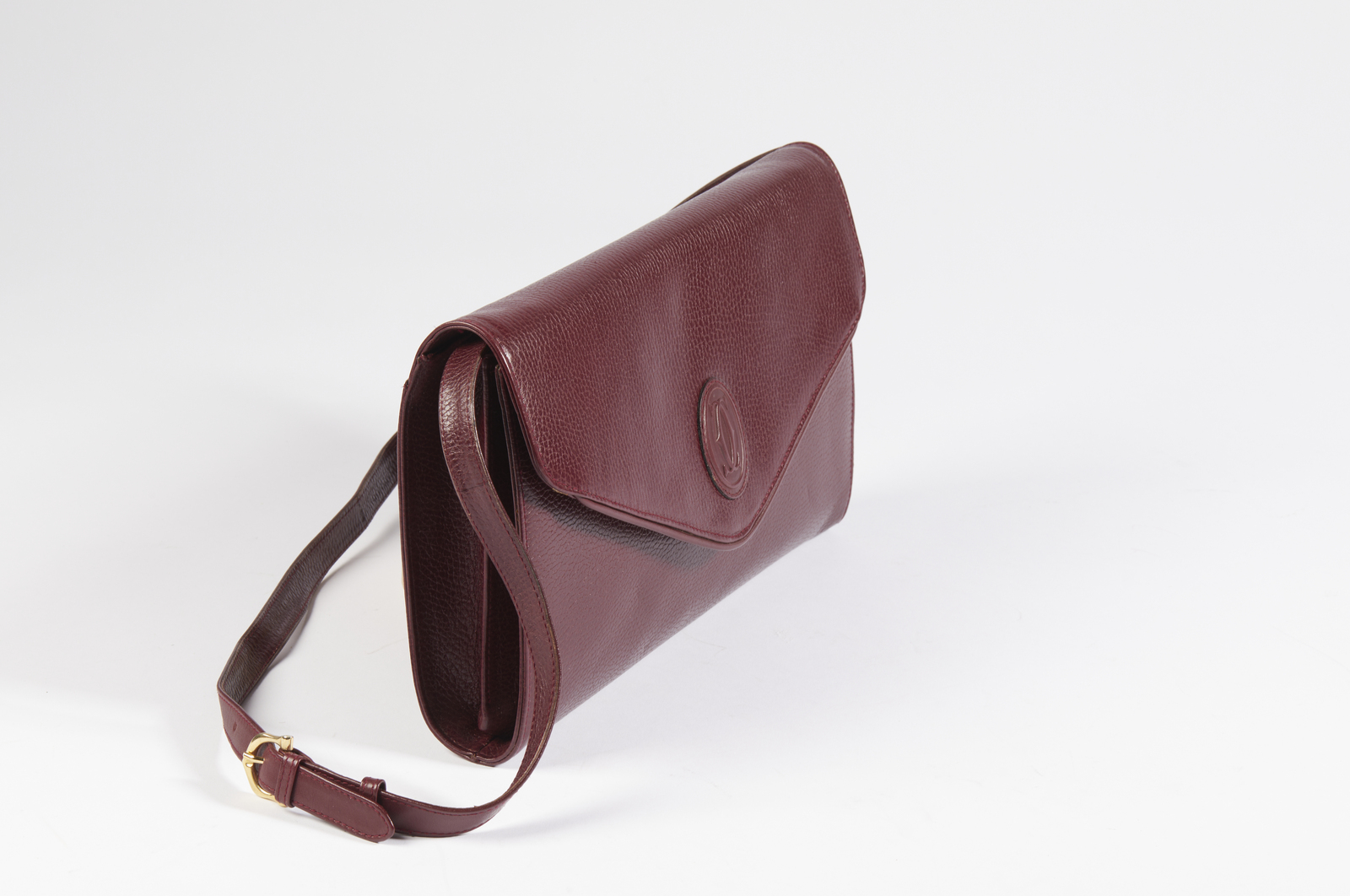 CARTIER Borsa in pelle bordeaux. Pelle. Cm 32,50 x 20,50. Borsa con tracollina removibile Must de Cartier vintage, in pelle martellata bordeaux, logo Cartier impresso al fronte, interni in tessuto logo Cartier, una taschina interna chiusa da zip ed una taschina aperta, logo su hardware dorato Must de Cartier.