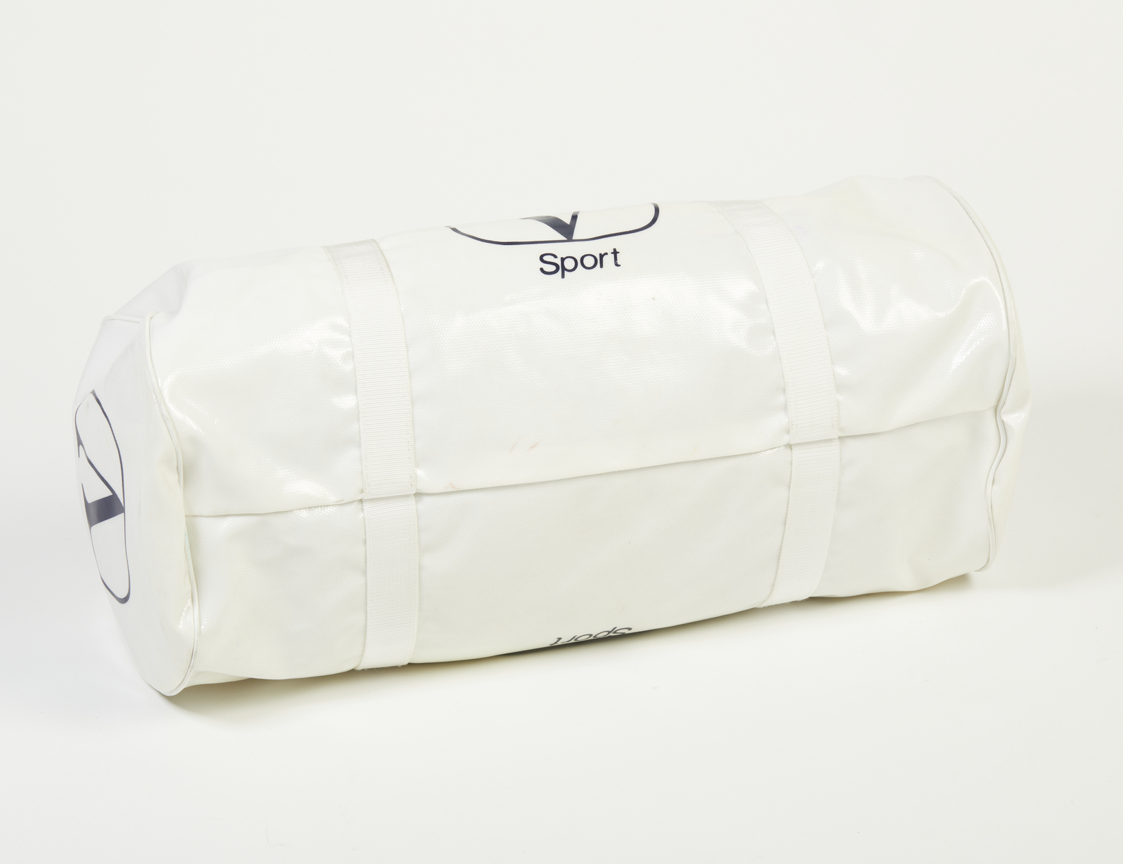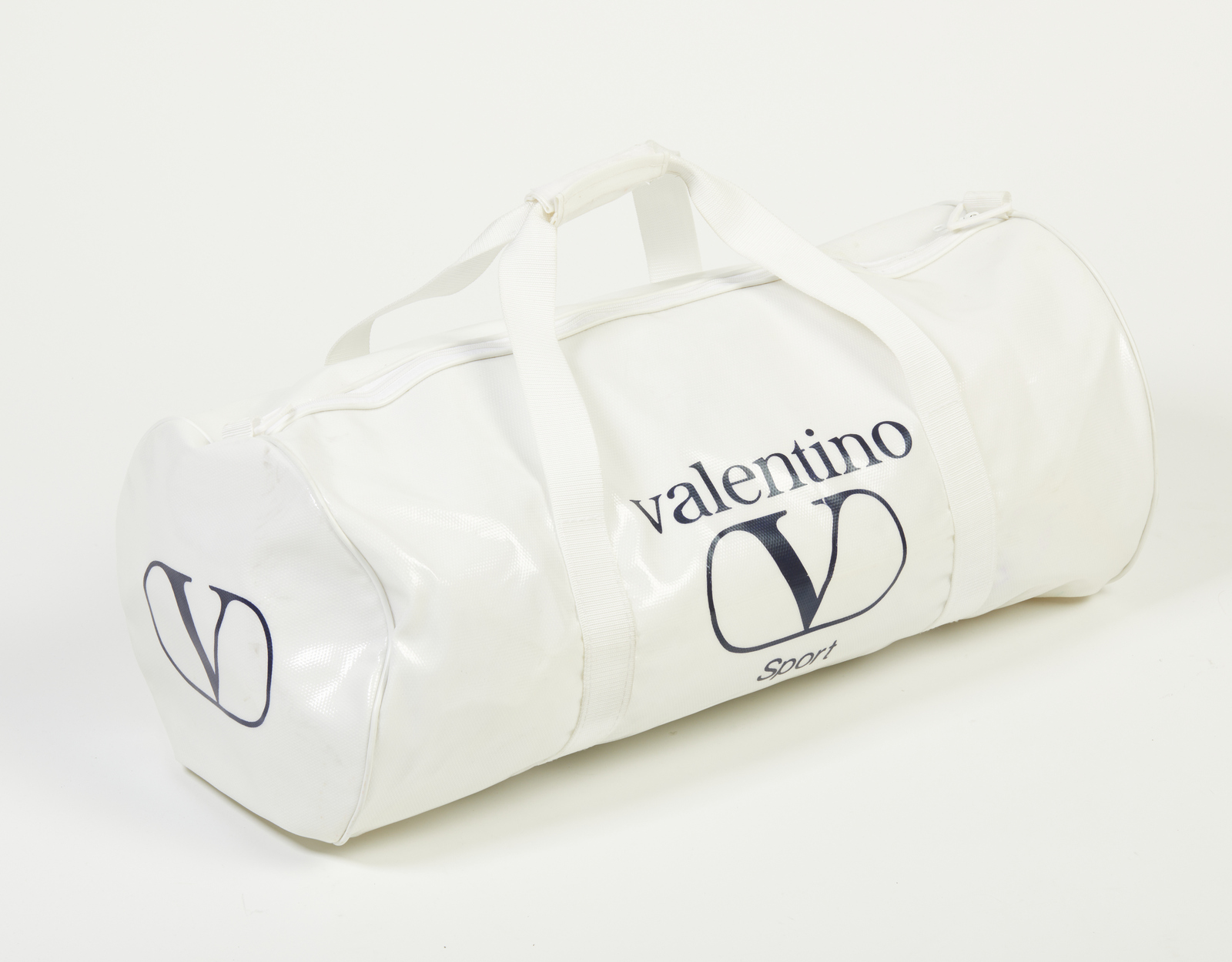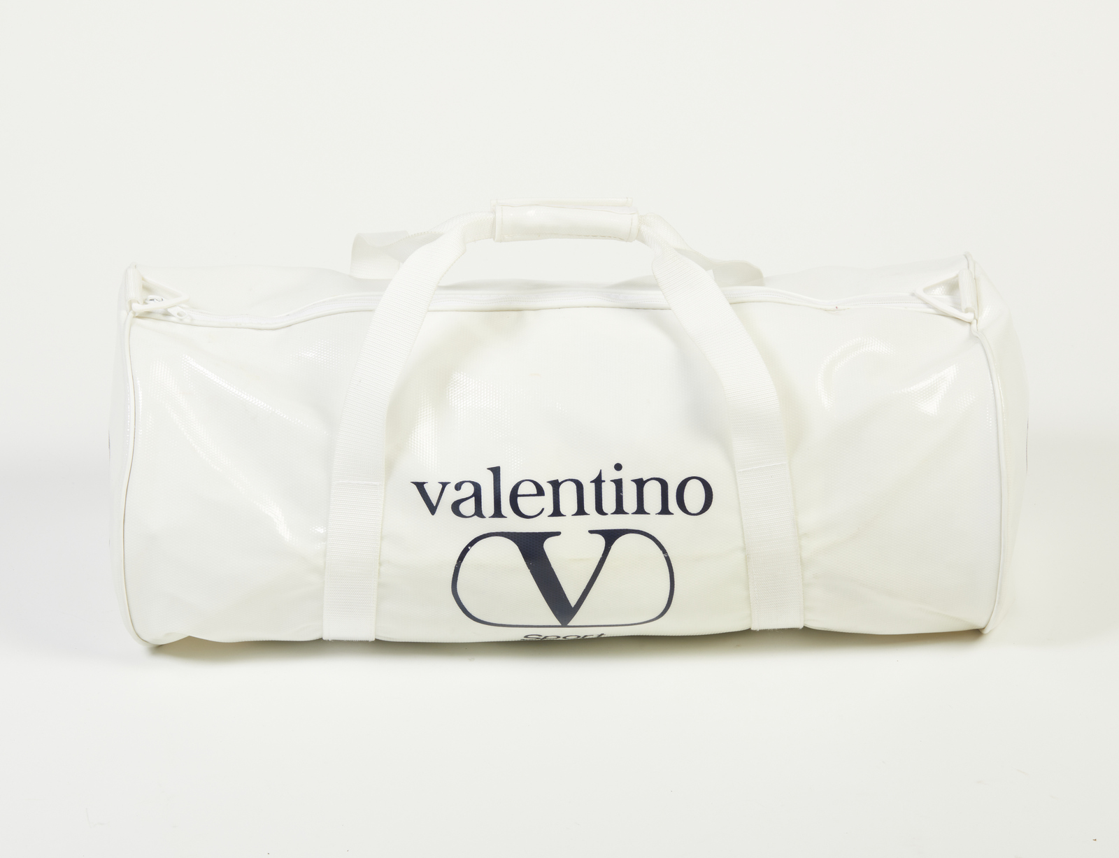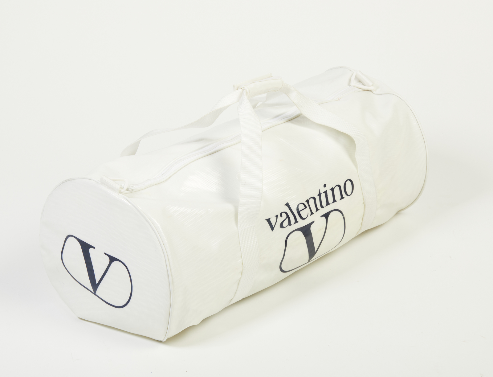 VALENTINO Borsa sport bianca in tela cerata. 2000. Tela cerata.. Cm 68,00 x 30,00 x 46,00. Ottime condizioni. Limited edition. Tasca interna. Grande Logo Valentino sul fronte ( Firma Valentino Sport e logo) ed ai lati ( logo con iconica V), in colore nero a contrasto. Anni 2000.