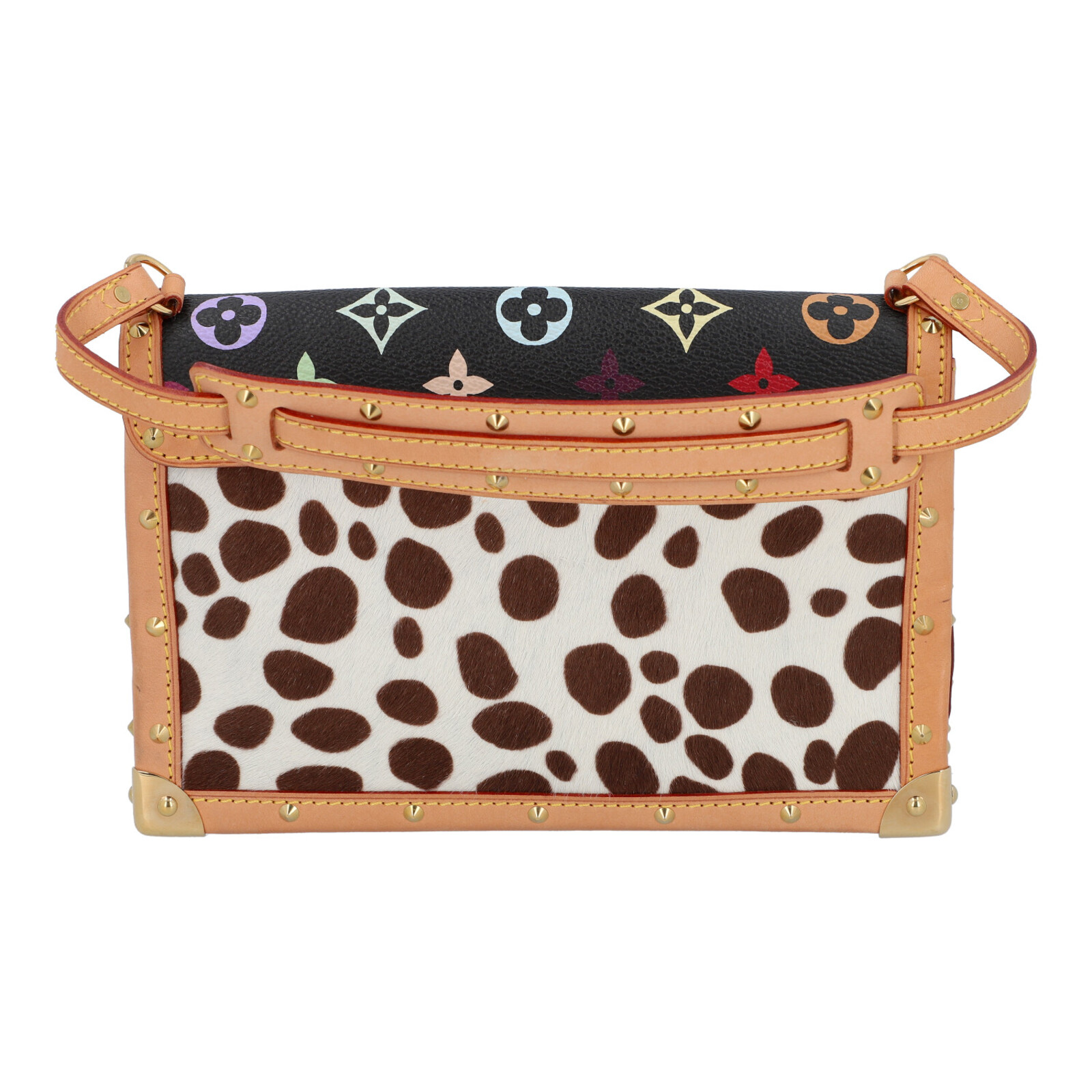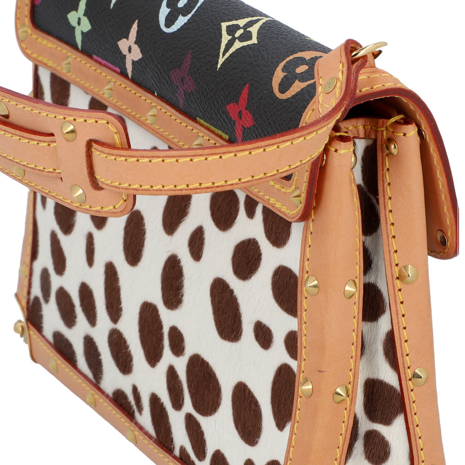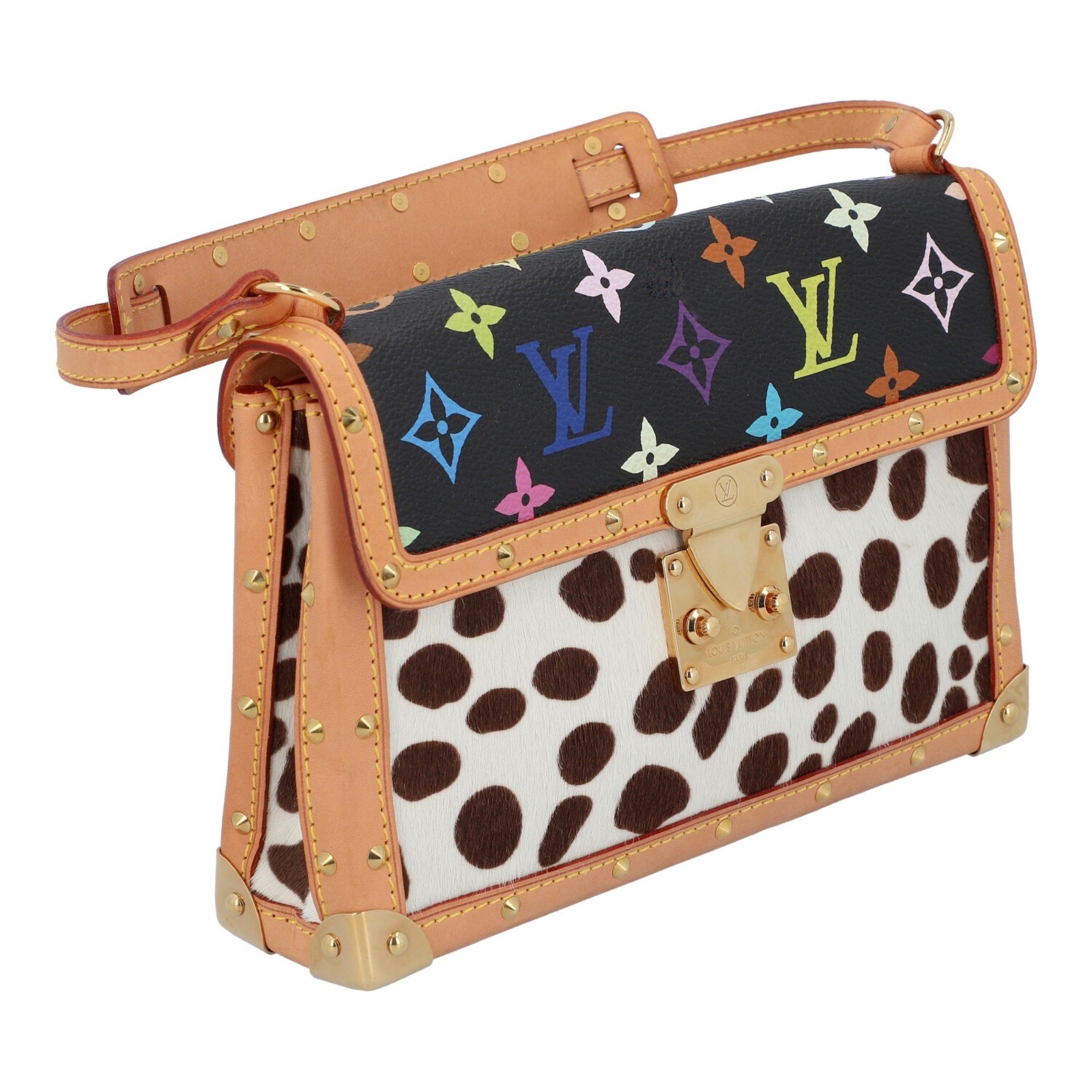 VUITTON LOUIS Borsa MINI DALMATIAN - TAKASHI MURAKAMI. 2003. Cavallino e pelle. Cm 22,50 x 14,50 x 5,50. Borsa Mini Dalmatian collaborazione con Takashi Murakami- Louis Vuitton. Monogram multicolor fondo nero in cavallino maculato bianco e nero e vacchetta naturale. Interno in alcantara rossa. Codice: TH0093 anno 2003, edizione limitata. Made in France. RARA. Condizioni eccellenti.