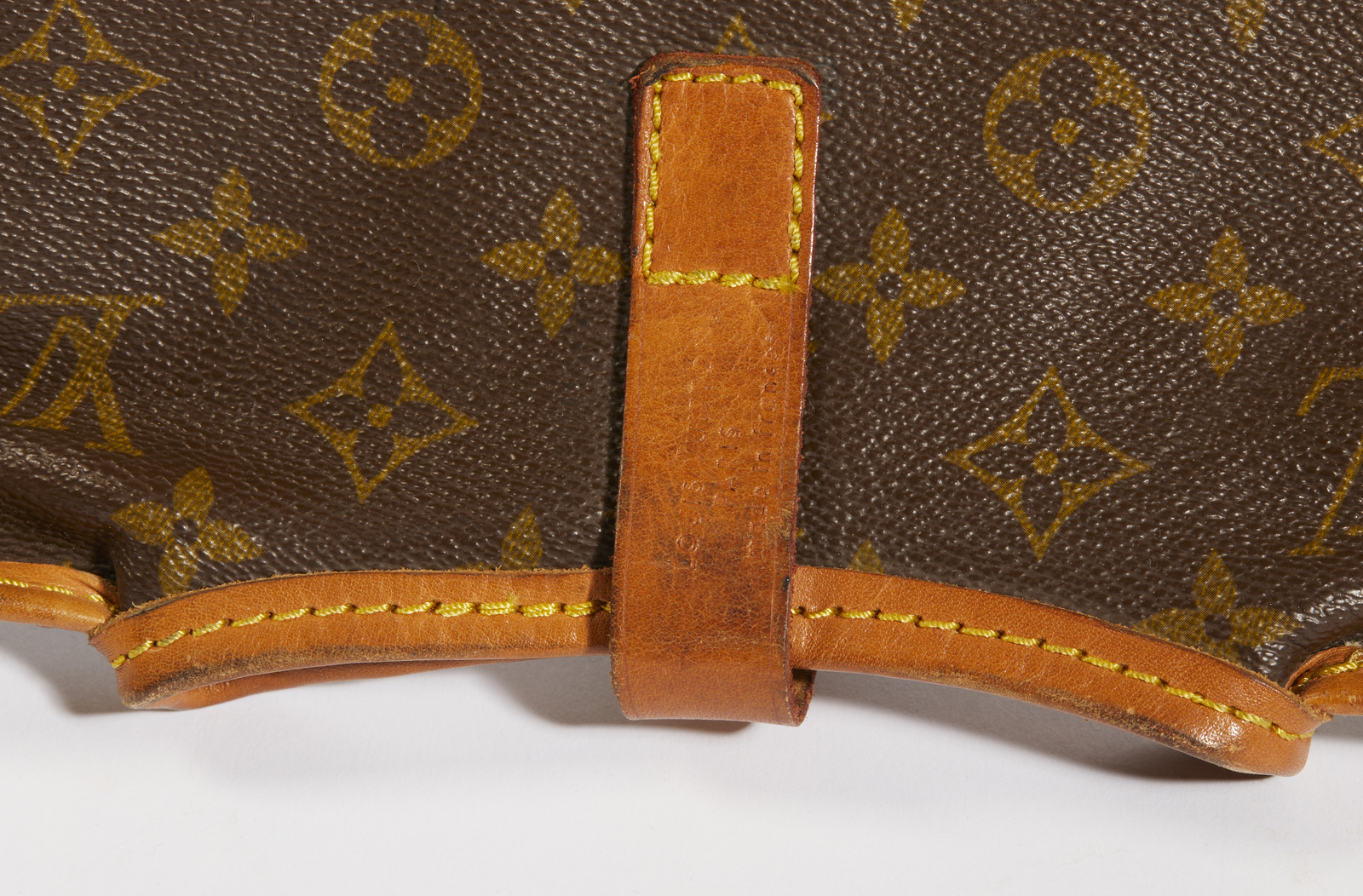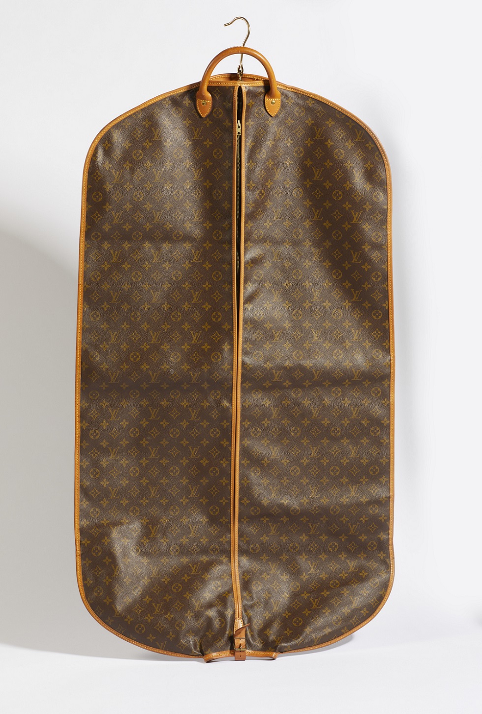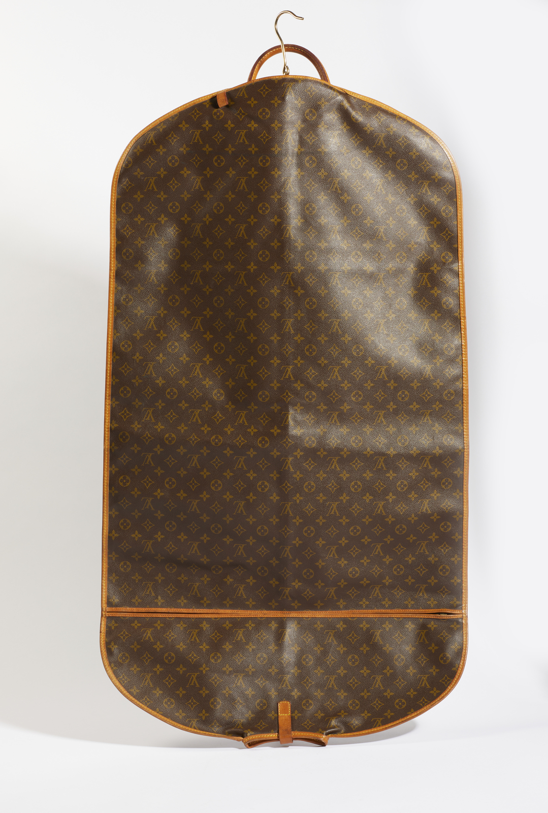 VUITTON LOUIS Porta abiti in canvas monogram. Canvas. Cm 63,00 x 114,00 x 1,00. Porta abiti in canvas monogram e dettagli in vacchetta a contrasto, firma Louis Vuitton Paris Made in France impressa, Patina e lievissimi segni d'usura.