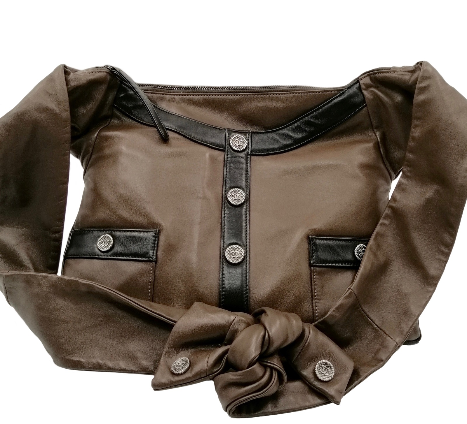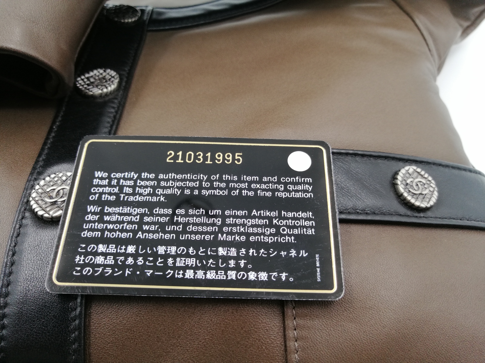 CHANEL Girl Bag pm (petit model). 2015. Pelle di agnello. Cm 34,00 x 26,00 x 5,00. Girl Bag pm (petit model) Chanel vintage, che richiama il caratteristico giacchino Chanel con profili a contrasto. Pelle in agnello color tortora, passamanerie nere, bottoni argentati, chiusura a zip. Codice: 21031995 con card inclusa. Etichetta interna Chanel/ Made in France. Collezione Spring 2015. Condizioni eccellenti pari a nuovo.