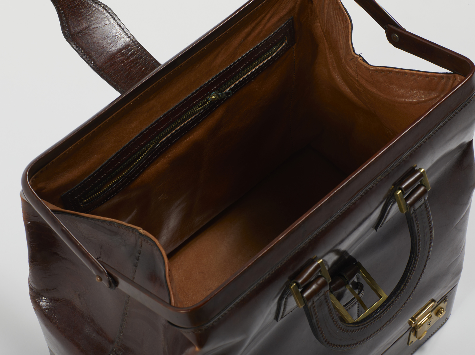 AUTORE NON IDENTIFICATO Borsa di cuoio. Pelle. Cm 48,00 x 41,00 x 27,00. Valigia in pelle color cuoio a mano con scompartimento alla base, hardware dorato, interni in pelle, taschina interna con zip.