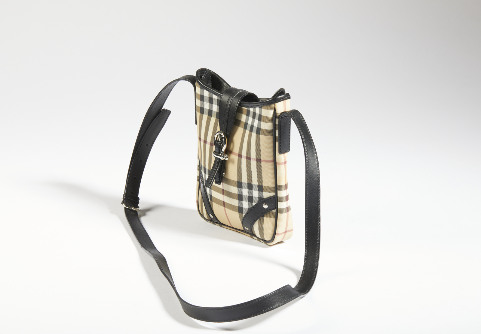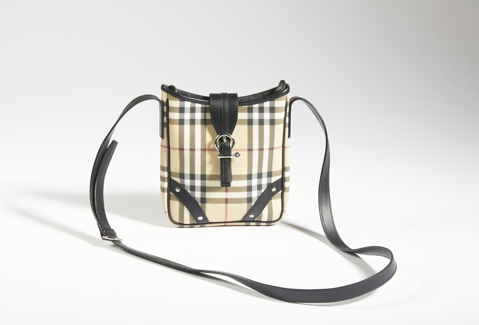 BURBERRY Tracolla in canvas tartan check. Canvas. Cm 18,00 x 20,00 x 3,00. Borsetta a tracolla Burberry vintage nell'iconica canvas stampa tartan check, hardware argentato, dettagli passante con chiusura a calamita sul lato frontale e della tracolla in pelle nera, interni in cotone nero, etichetta Burberry/London presente. Condizioni praticamente eccellenti.