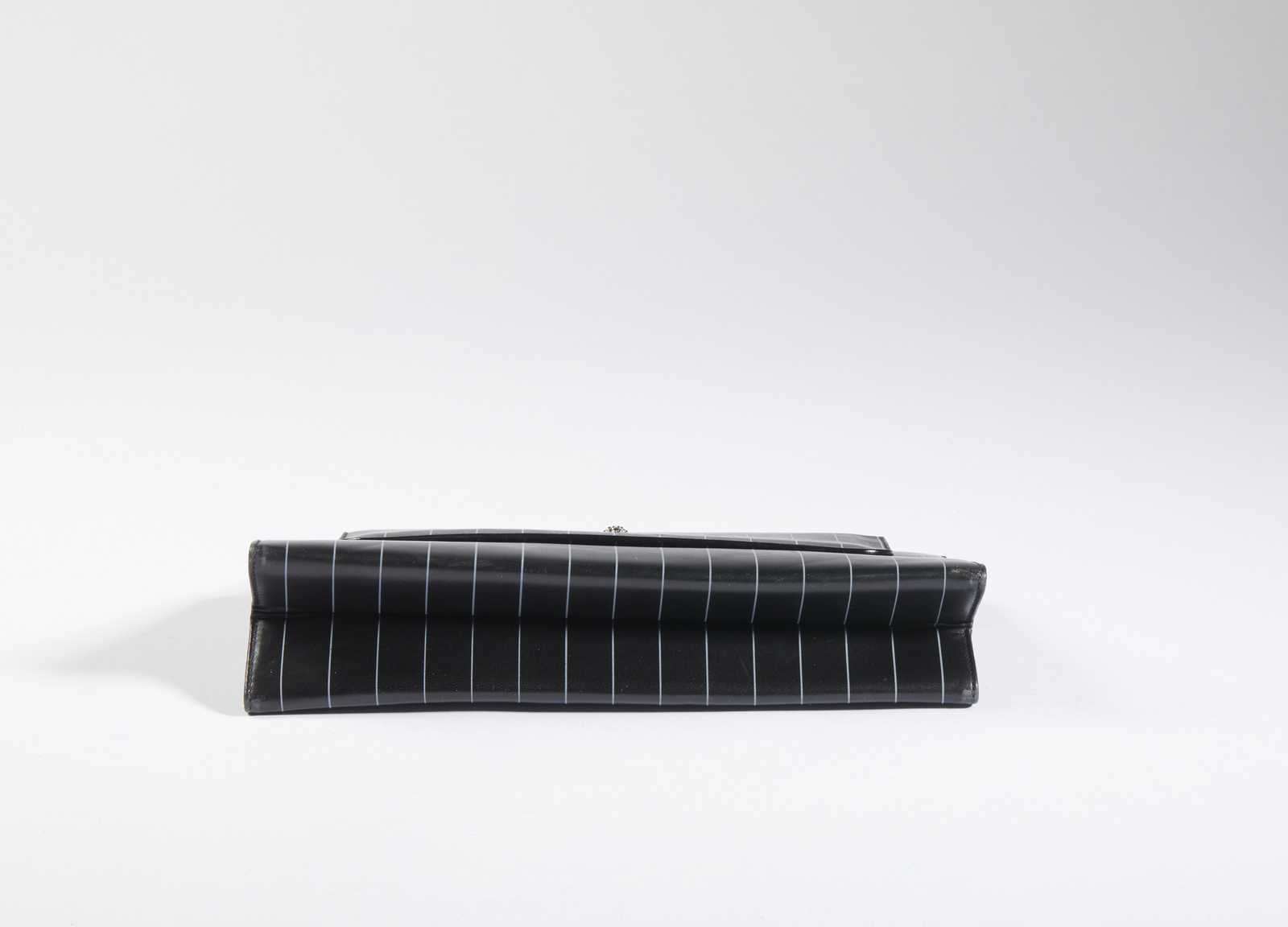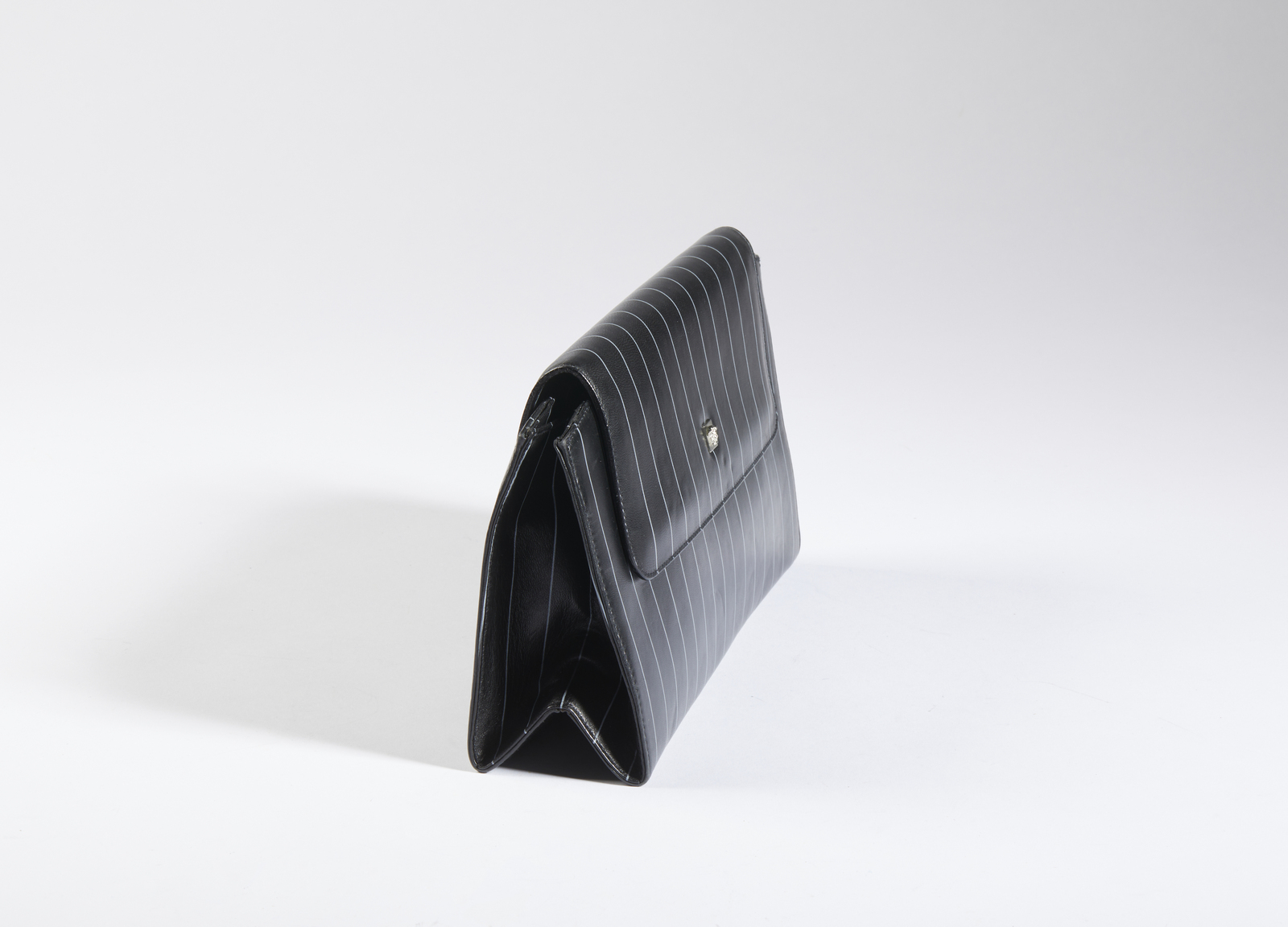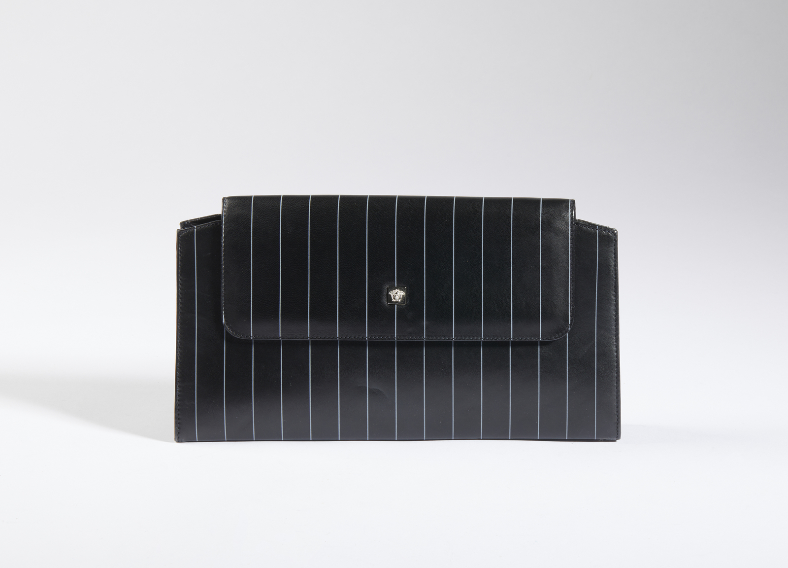 VERSACE GIANNI (1946 - 1997) - Clutch in pelle color blu di Prussia a righine celesti.