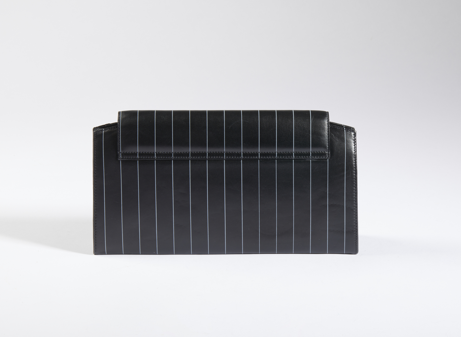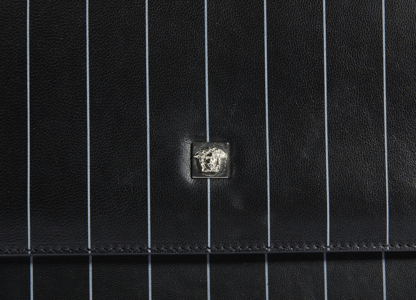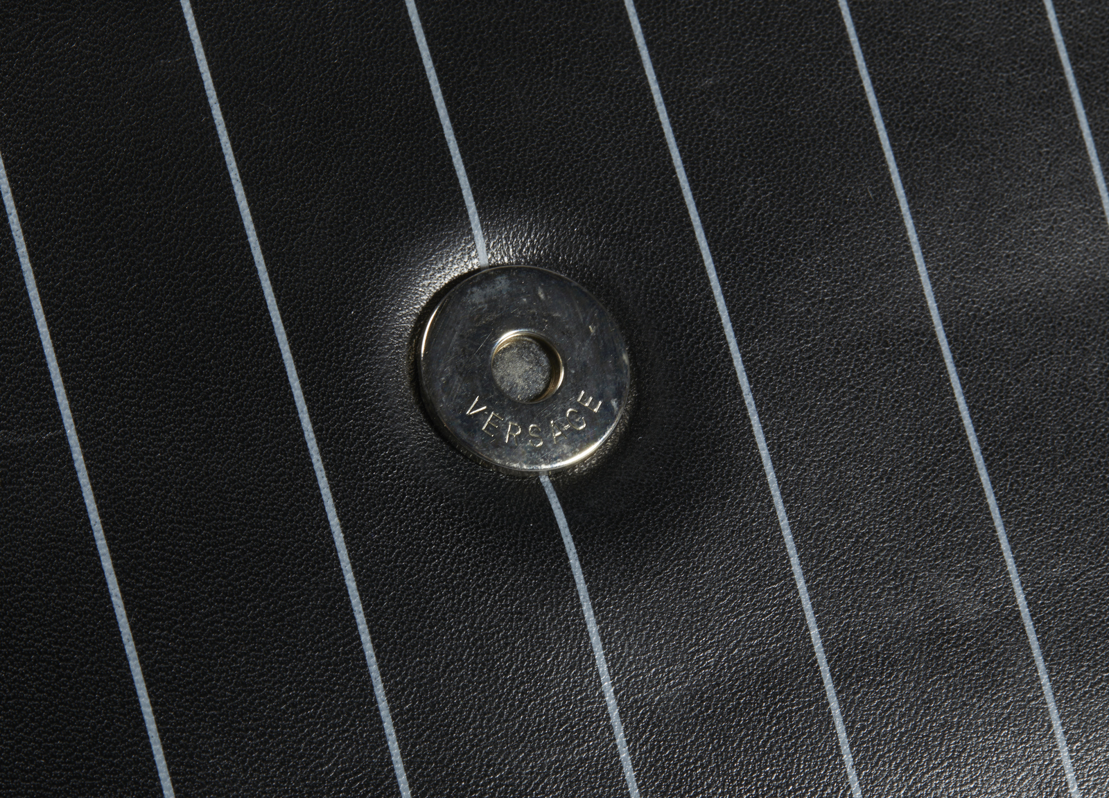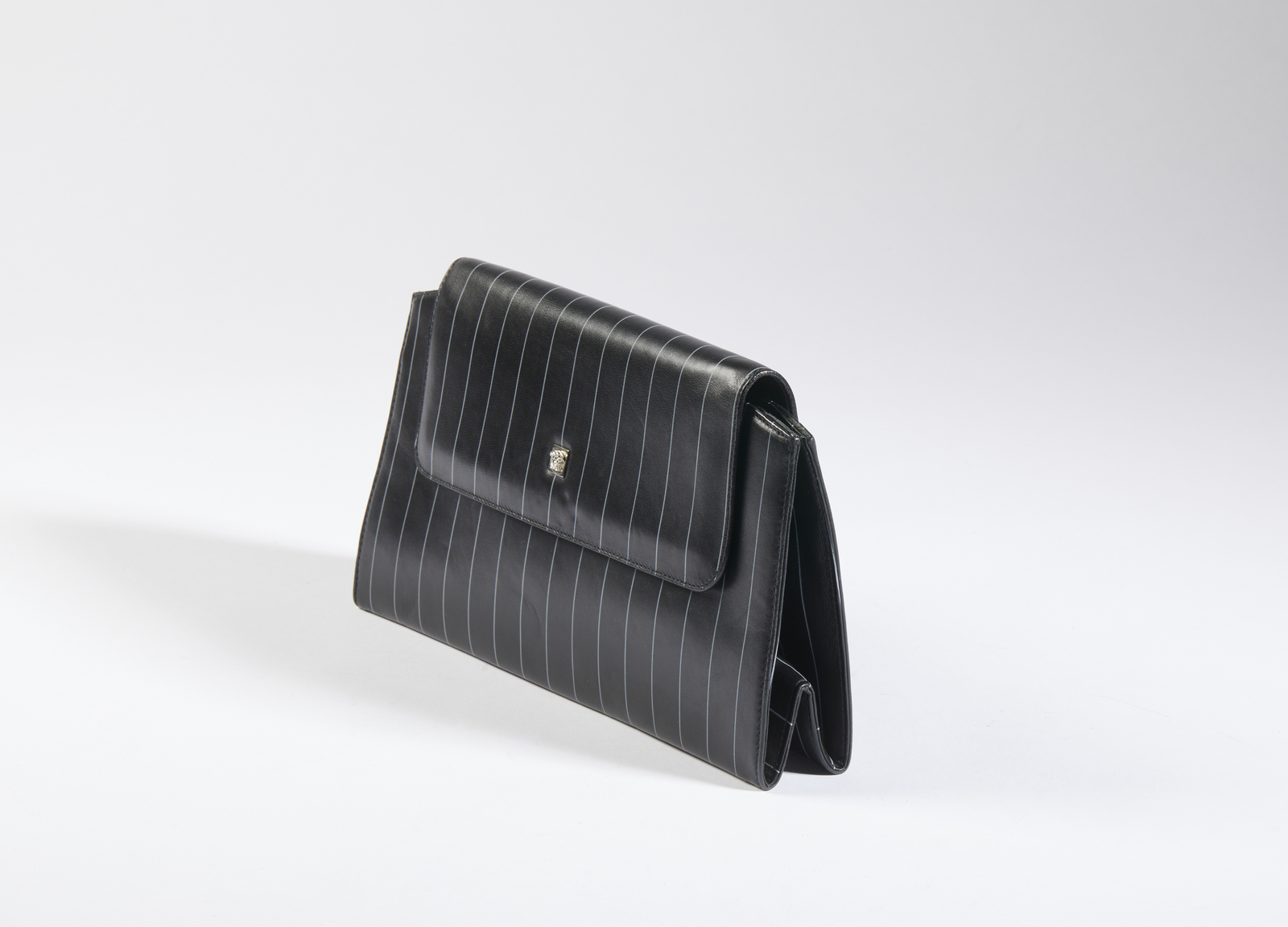 VERSACE GIANNI (1946 - 1997) - Clutch in pelle color blu di Prussia a righine celesti.