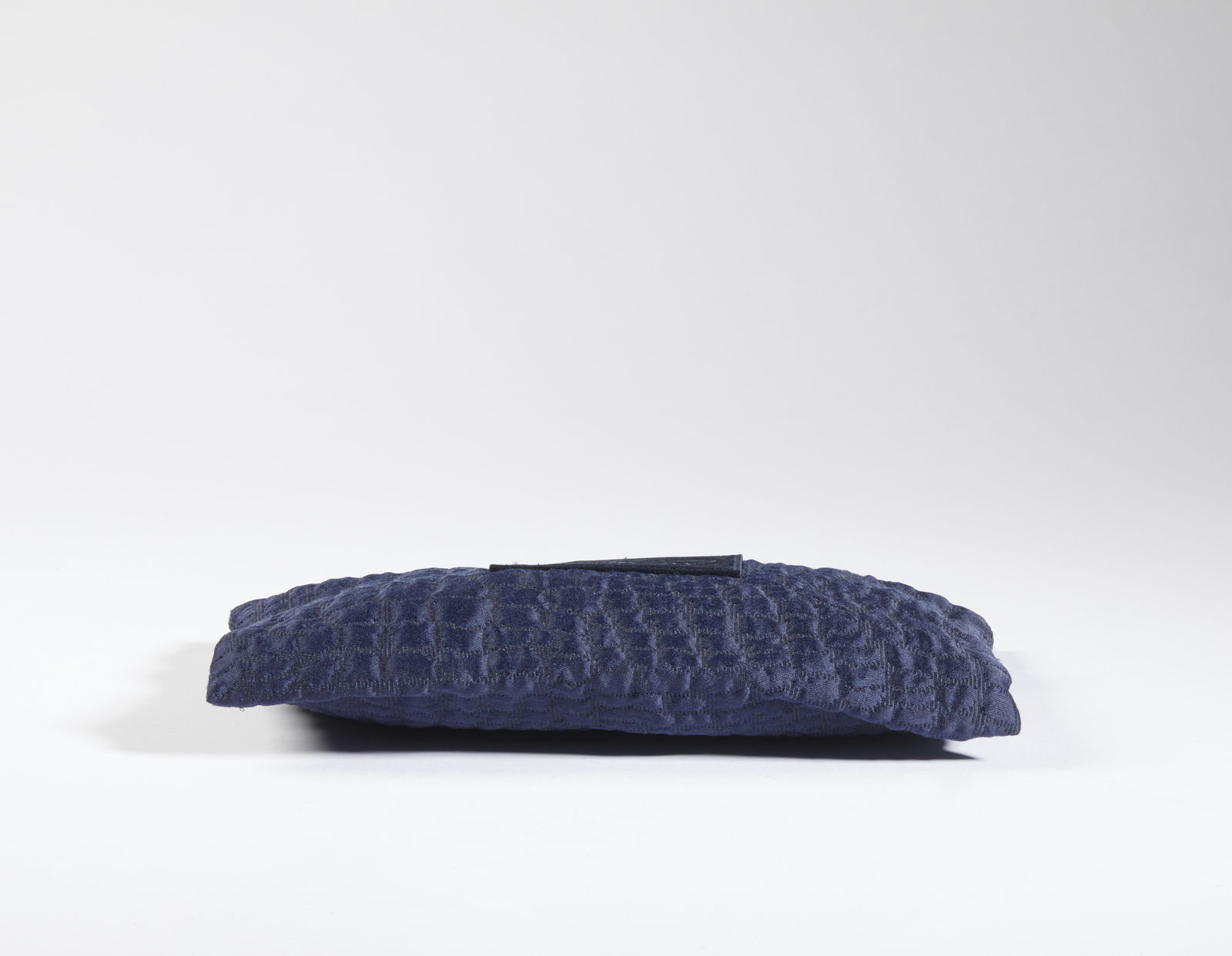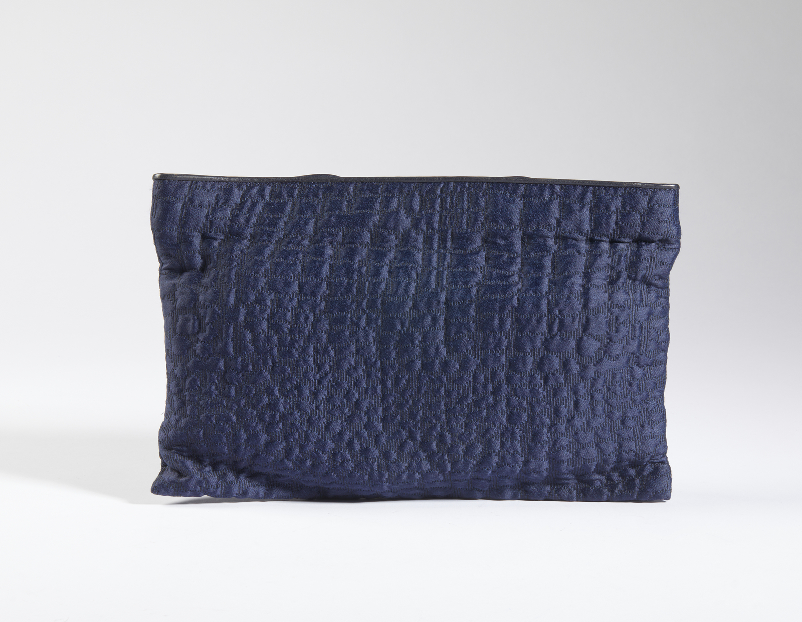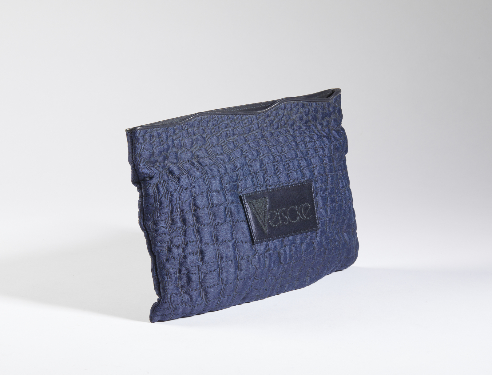VERSACE GIANNI (1946 - 1997) Pochette - trousse in tessuto blu carta da zucchero. Tessuto. Cm 36,00 x 26,00 x 6,00. Pochette- trousse in tessuto matelassé blu carta da zucchero. Ottime condizioni. Dustbag presente.
