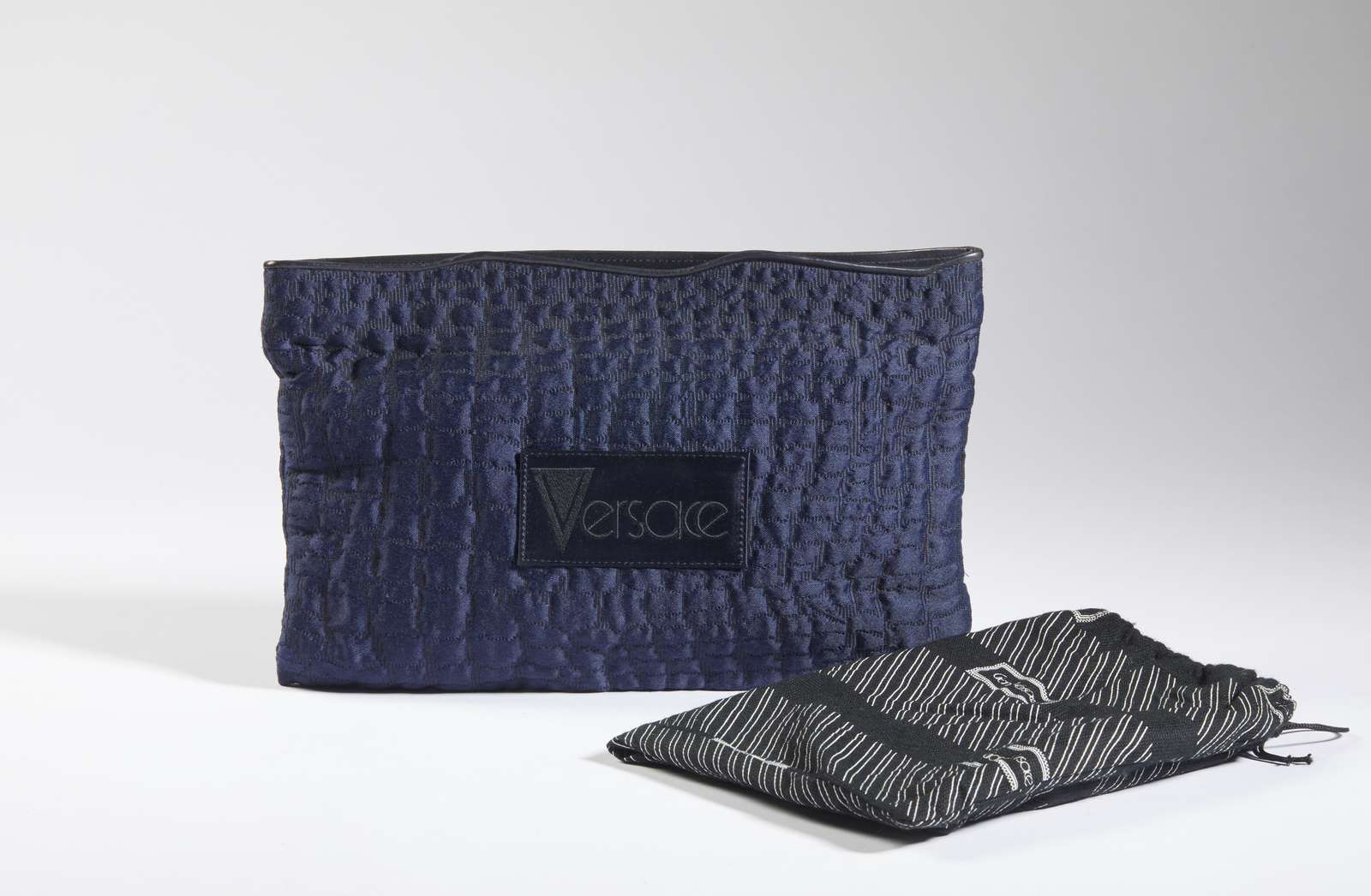 VERSACE GIANNI (1946 - 1997) - Pochette - trousse in tessuto blu carta da zucchero.
