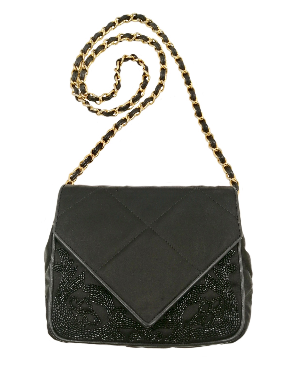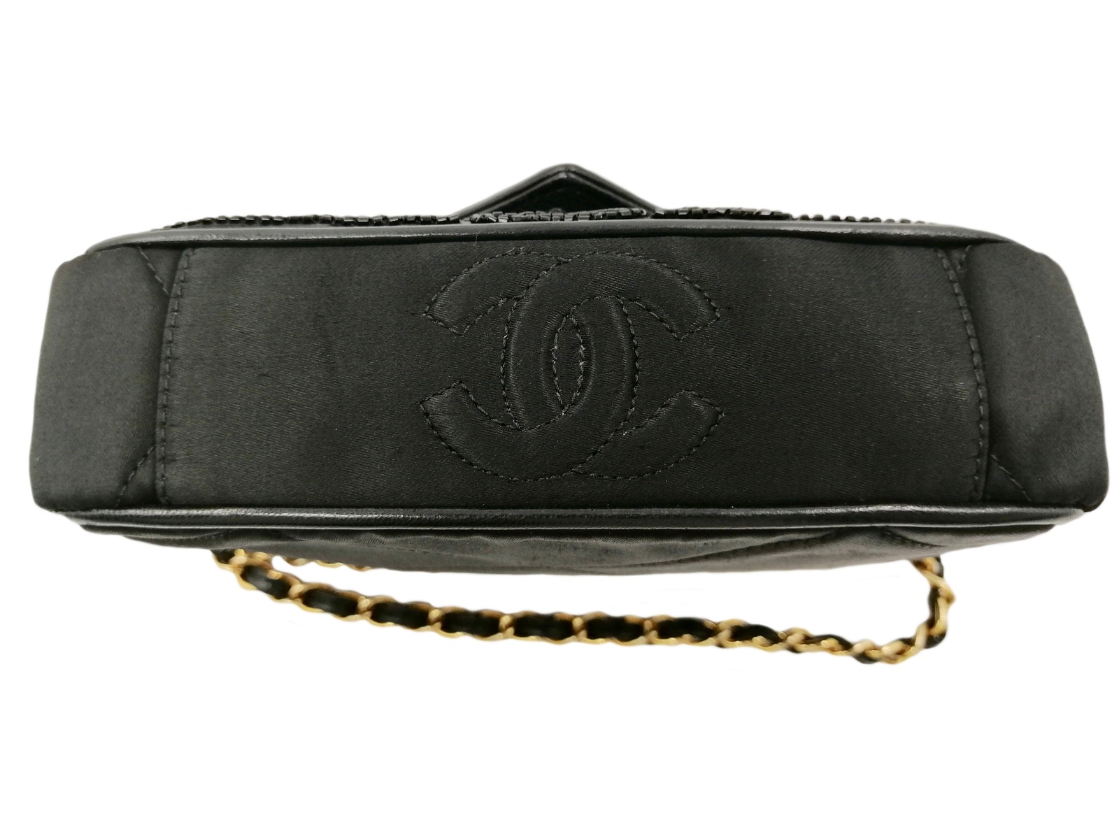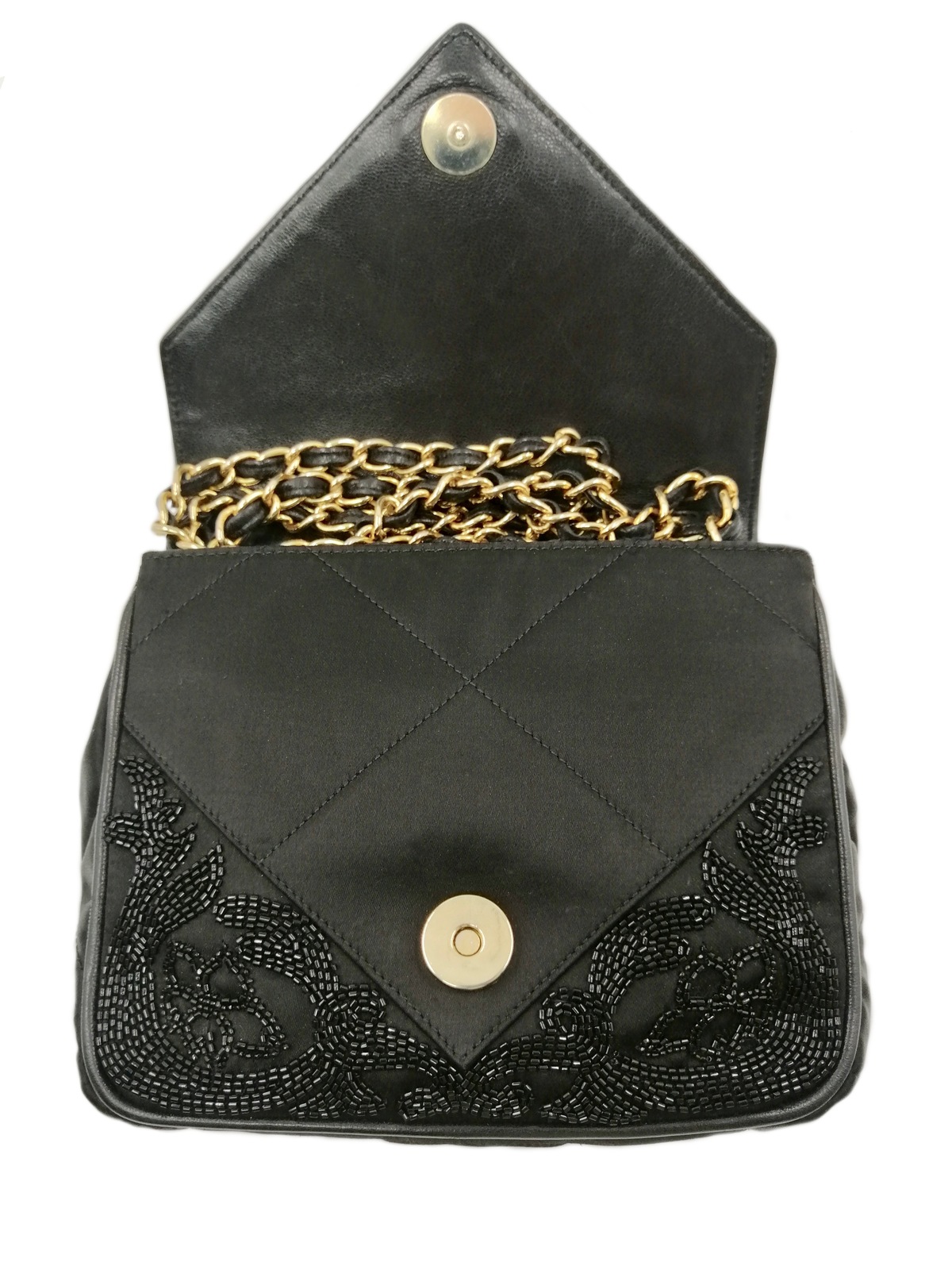 CHANEL Borsa da sera in satin nero. 1989. Satin.. Cm 17,00 x 14,00 x 4,50. Borsetta da seta Chanel vintage in satin nero matelassé con ricami perline jais neri, rifinita in pelle nera, tracollina catena dorata con pelle nera, battente triangolare con chiusura a bottone magnetico, interno in pelle rossa. Codice: 1096851- Made in Italy. Anno 1989 - 1991. Rara - Condizioni eccellenti.