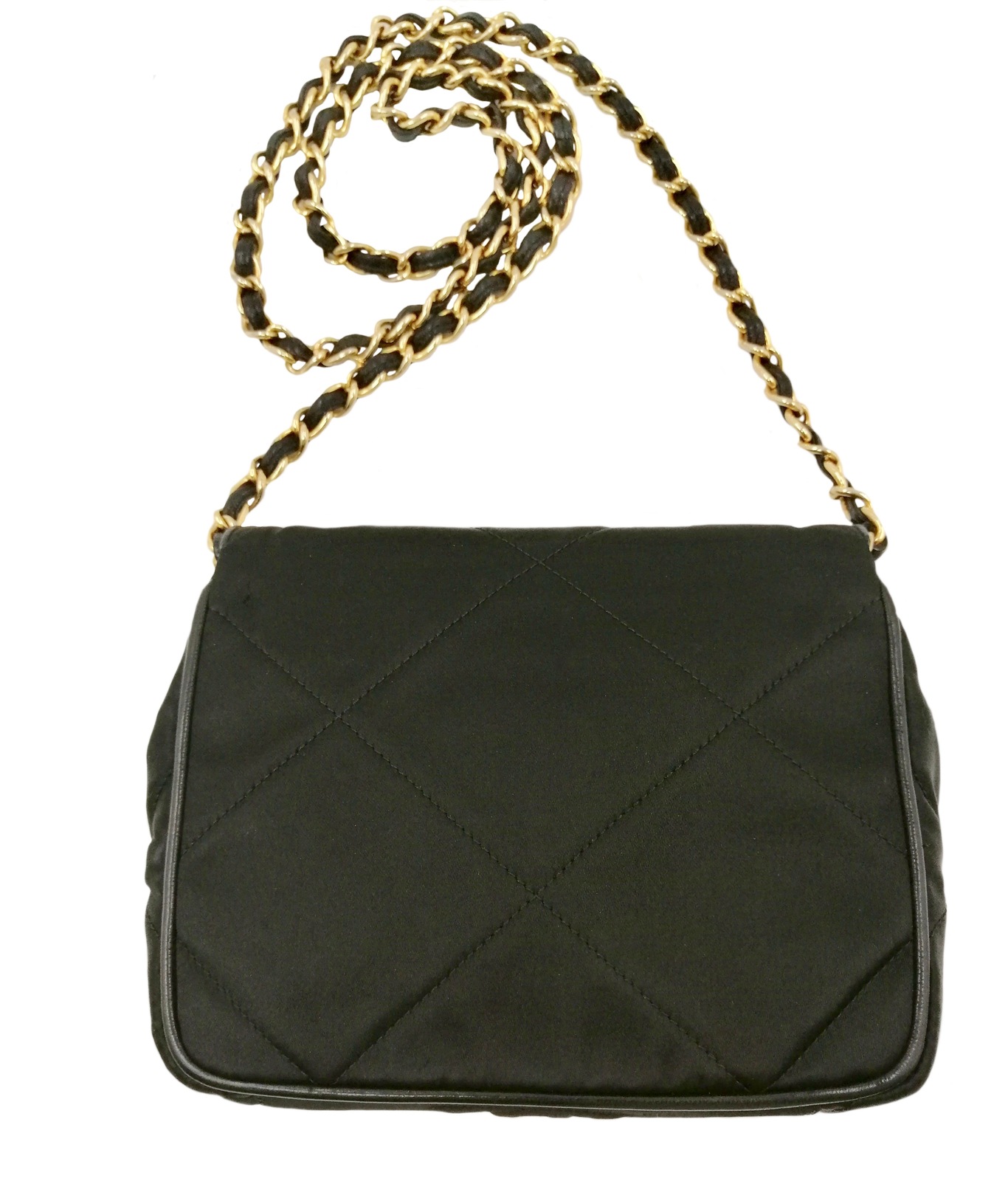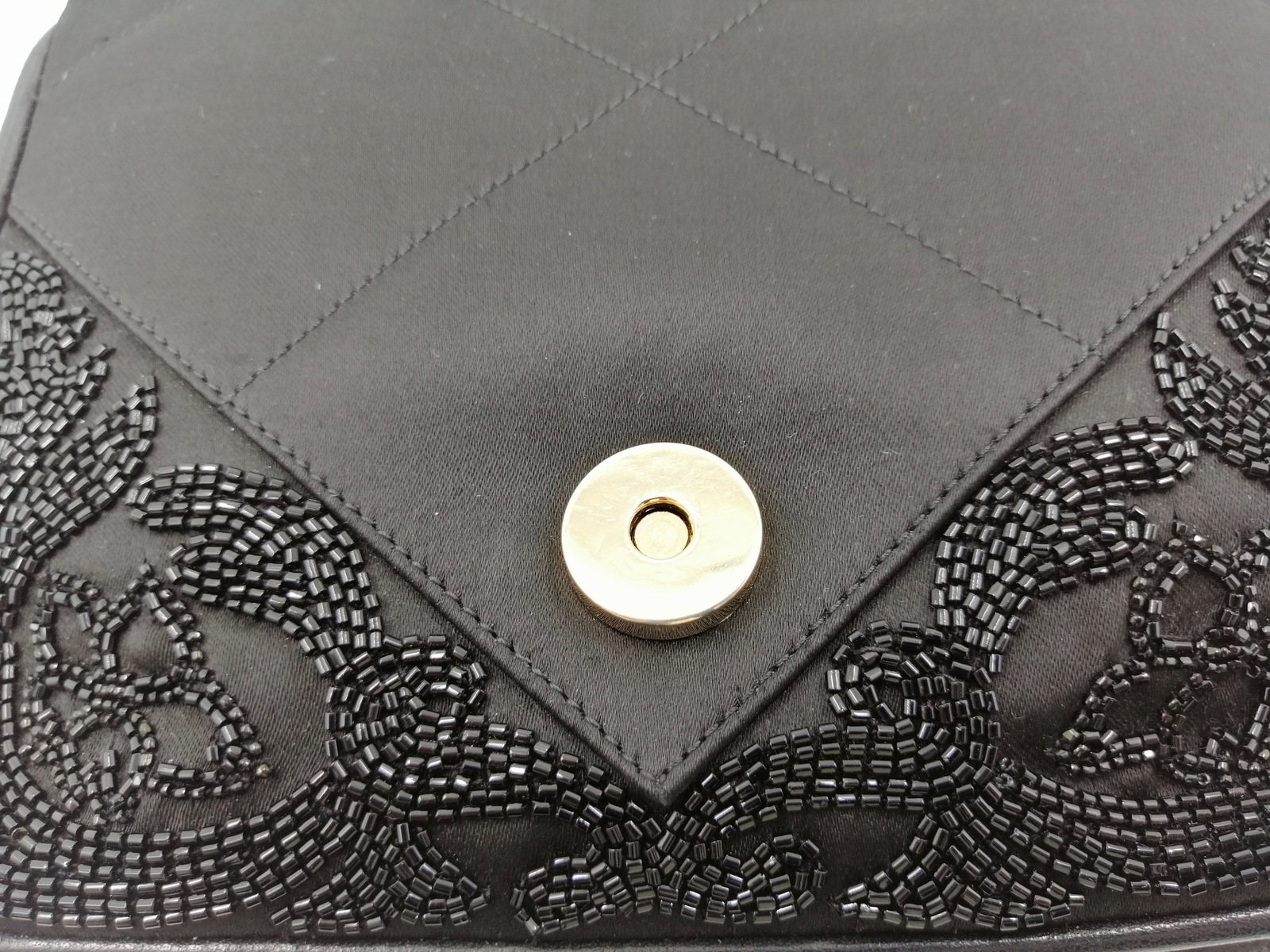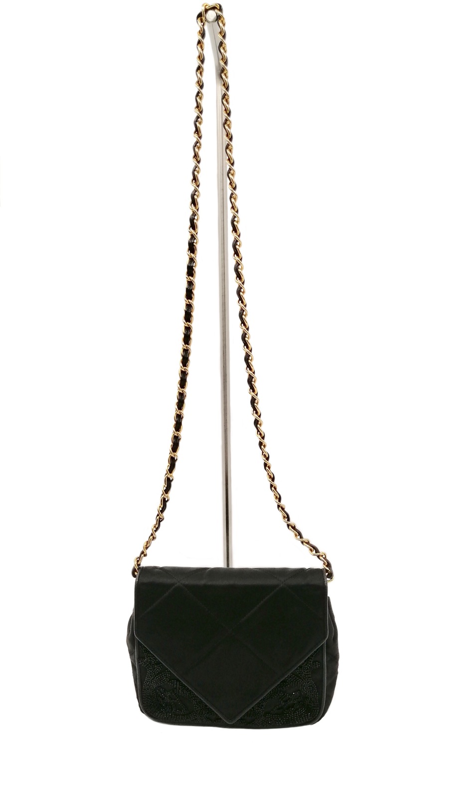 CHANEL Borsa da sera in satin nero. 1989. Satin.. Cm 17,00 x 14,00 x 4,50. Borsetta da seta Chanel vintage in satin nero matelassé con ricami perline jais neri, rifinita in pelle nera, tracollina catena dorata con pelle nera, battente triangolare con chiusura a bottone magnetico, interno in pelle rossa. Codice: 1096851- Made in Italy. Anno 1989 - 1991. Rara - Condizioni eccellenti.
