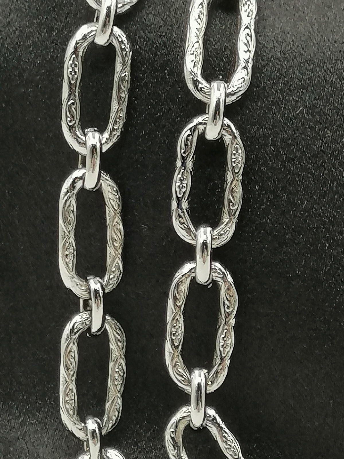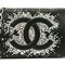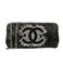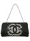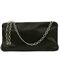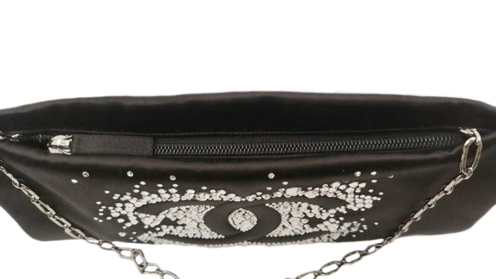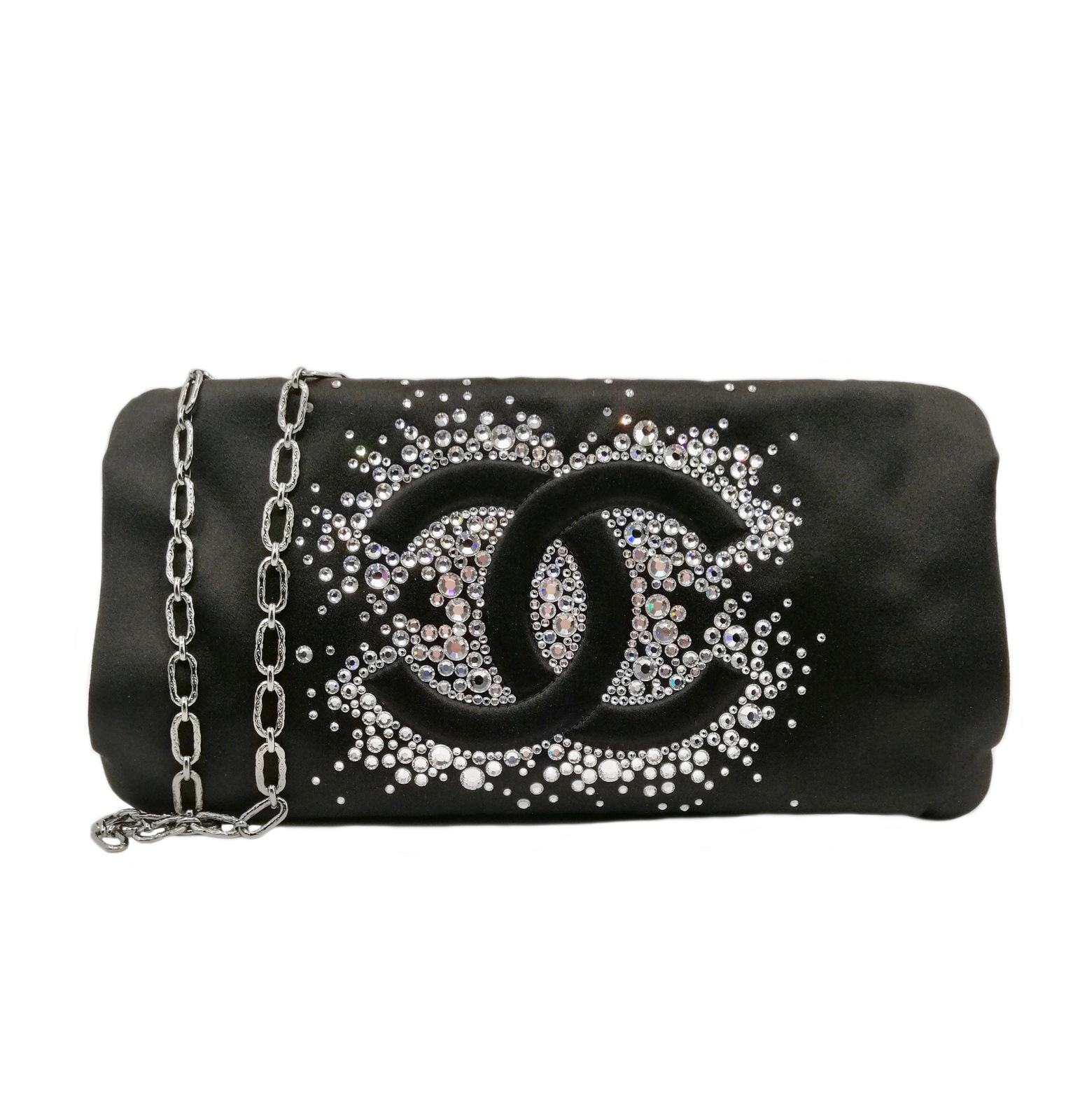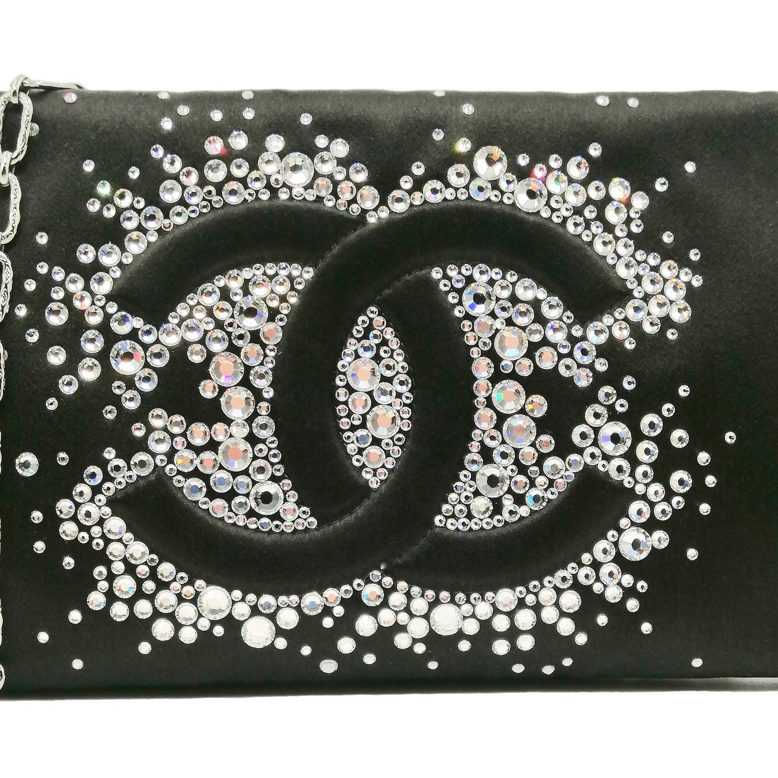 CHANEL - Pochette in satin nero con strass e catena argentata.