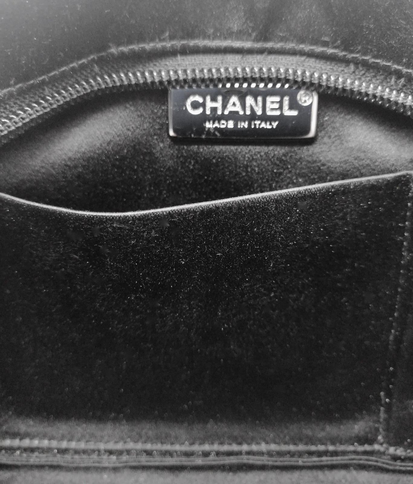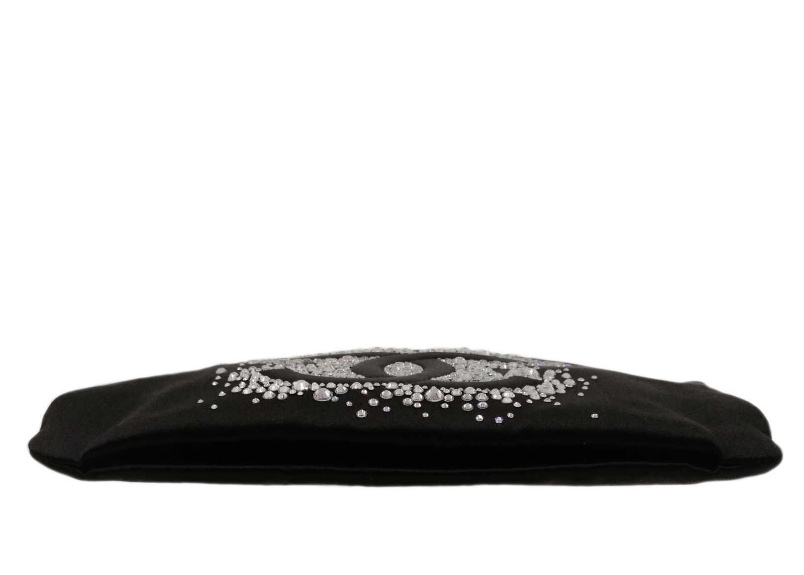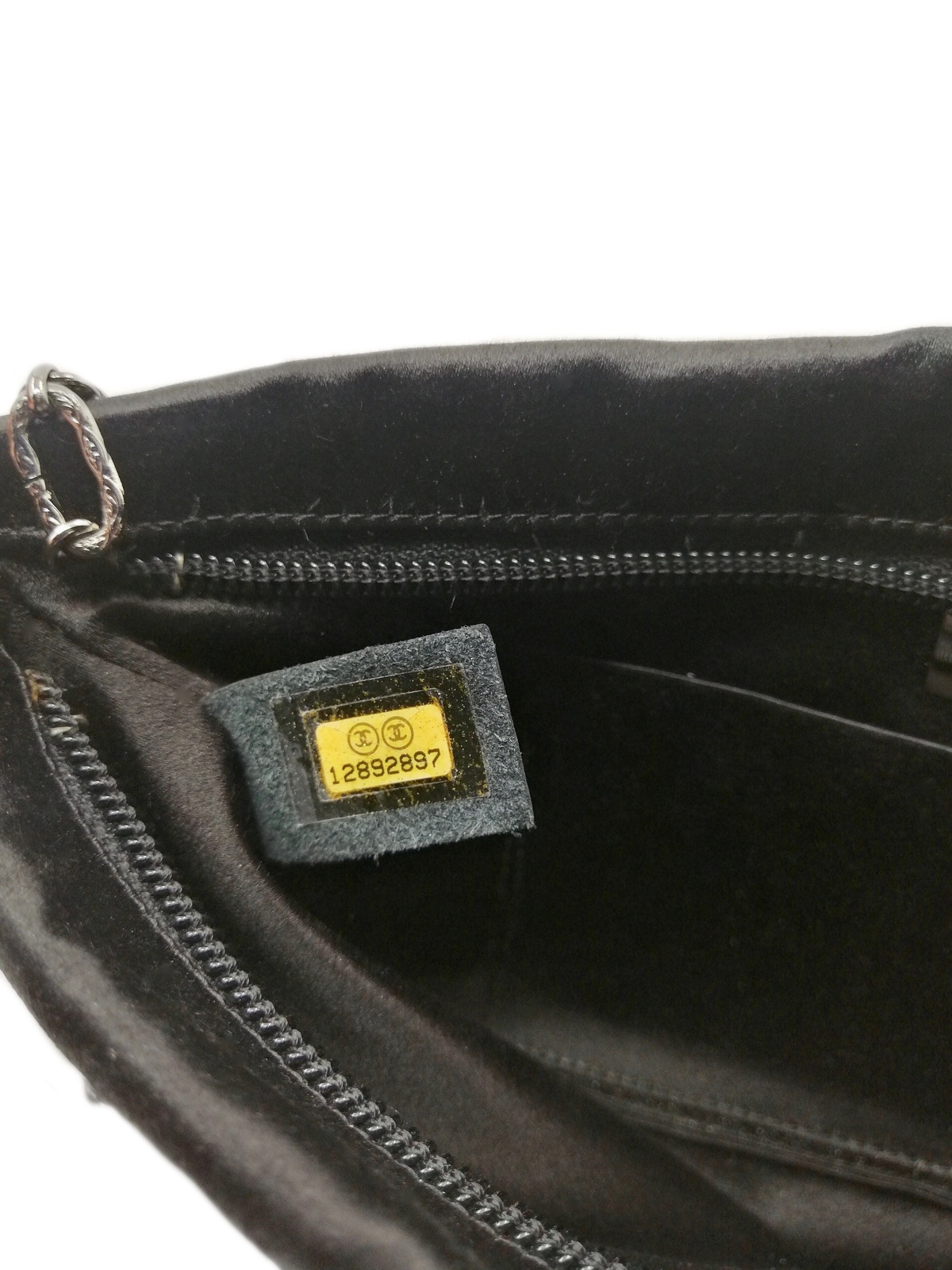 CHANEL Pochette in satin nero con strass e catena argentata. 2009. Satin.. Cm 26,00 x 14,00. Pochette da sera Chanel vintage in satin nero con logo CC, impreziosito da cristalli bianchi, catena in metallo argentato ed inciso, chiusura con zip. Interni in satin nero, una taschina interna aperta Codice interno: 12892897. Etichetta interna Chanel/ Made in Italy. Condizioni eccellenti come nuova.