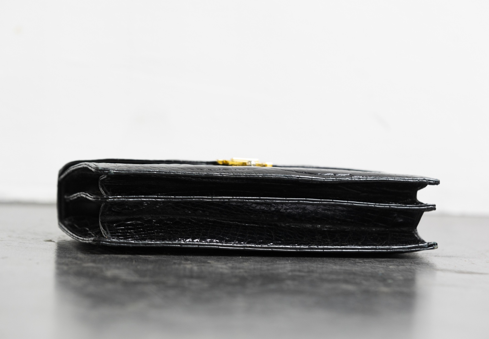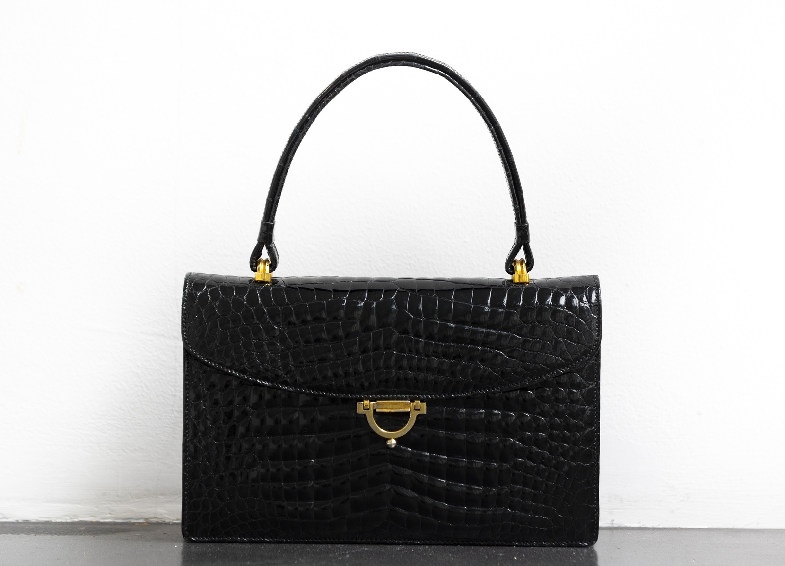 FENDI Borsa in pelle nera lucida. Pelle di coccodrillo. Cm 26,00 x 16,00 x 5,00. Elegante borsetta a mano Fendi vintage, modello rigido, in pelle stampa cocco nero lucida, manico rigido, firma Fendi stampata all'interno. Presente custodia originale.