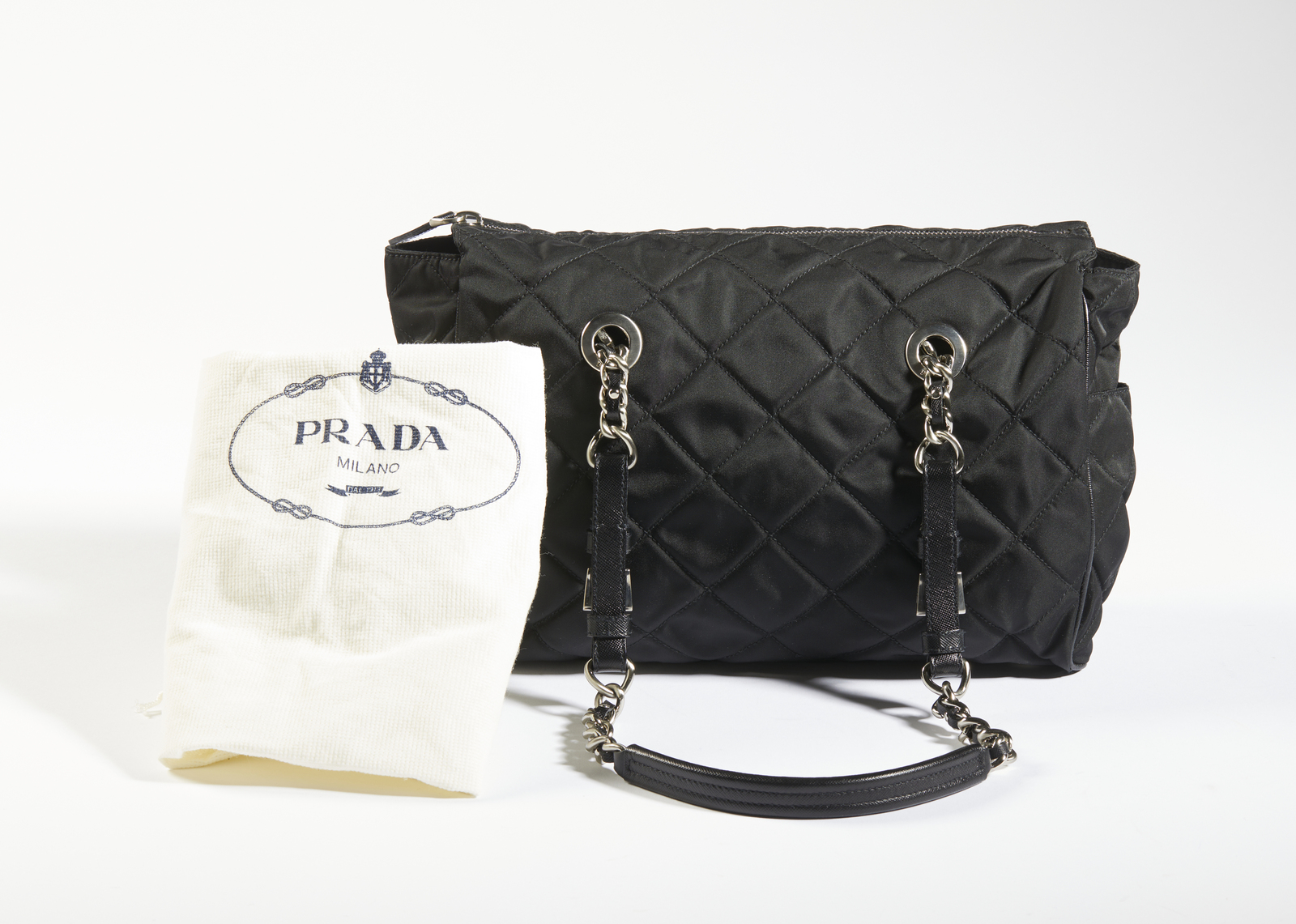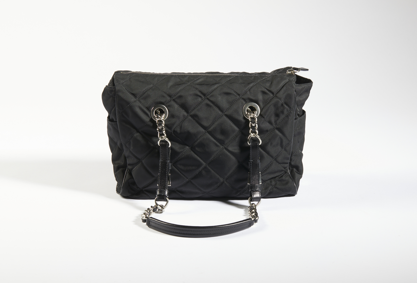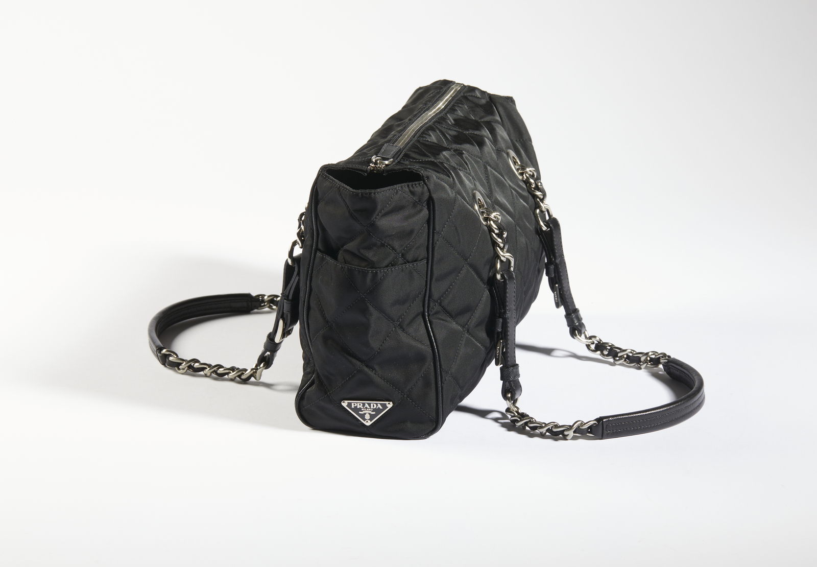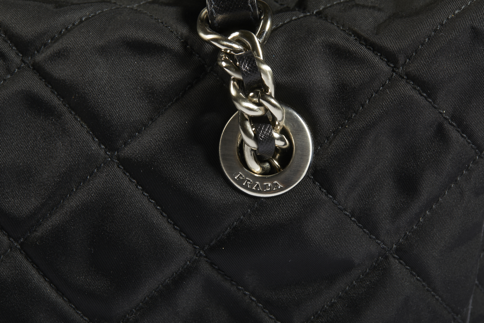 PRADA MILANO Borsa a tracolla nera. Nylon. Cm 28,00 x 25,00 x 6,50. Borsa a tracolla Prada vintage nel caratteristico tessuto di nylon trapuntato, nera, dettagli dell'hardware argentato, logo Prada/Milano triangolare su un lato, in basso, quattro piedini metallici alla base. Manici in catena intrecciata con pelle nera lavorazione Saffiano e le estremità in pelle nera Saffiano, decorate da cinghiette decorative. Interni in tessuto logo nero Prada, una tasca interna chiusa da zip, logo Prada/ Made in Italy presente. Eccellenti condizioni, inizio anni 2000. Dustbag presente.