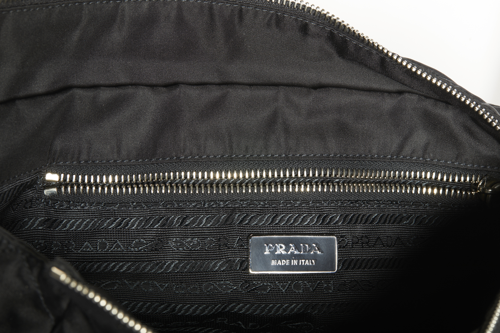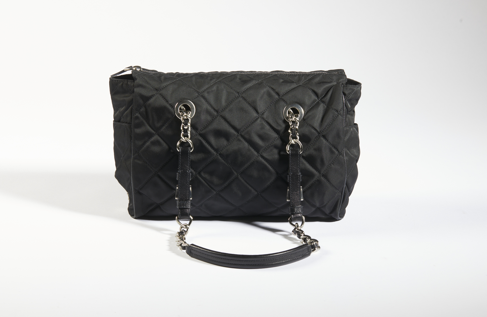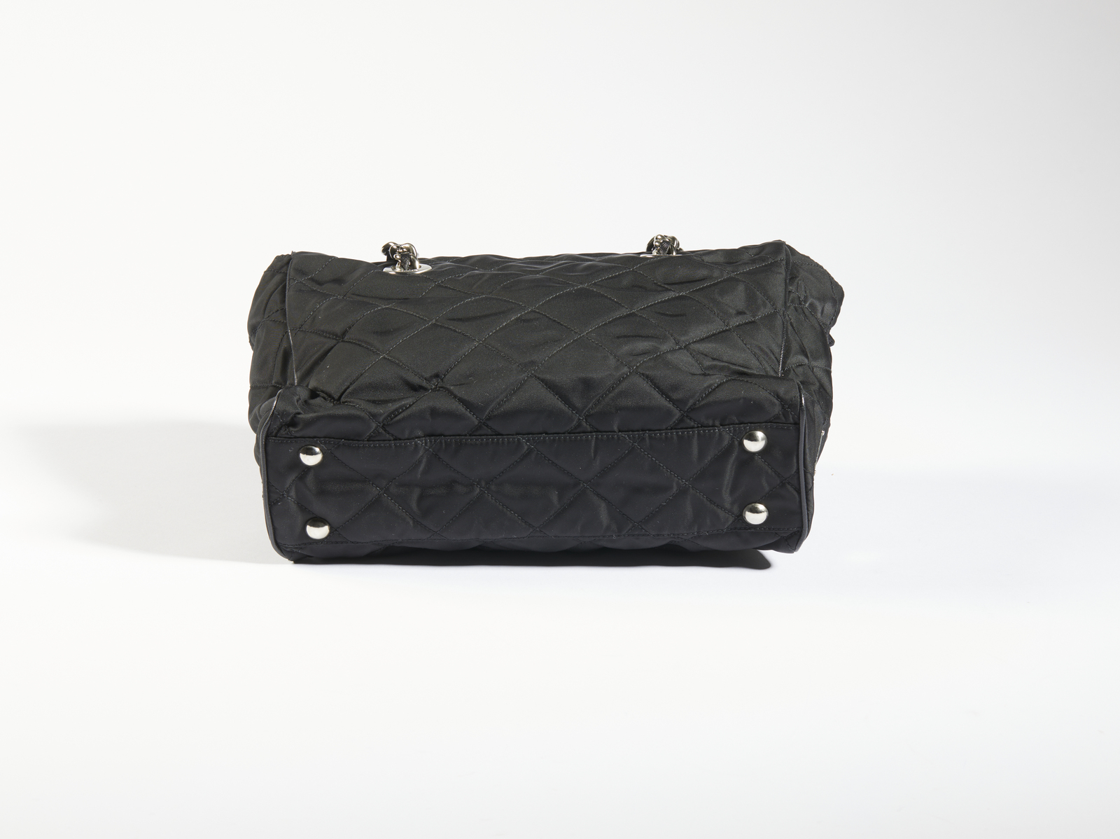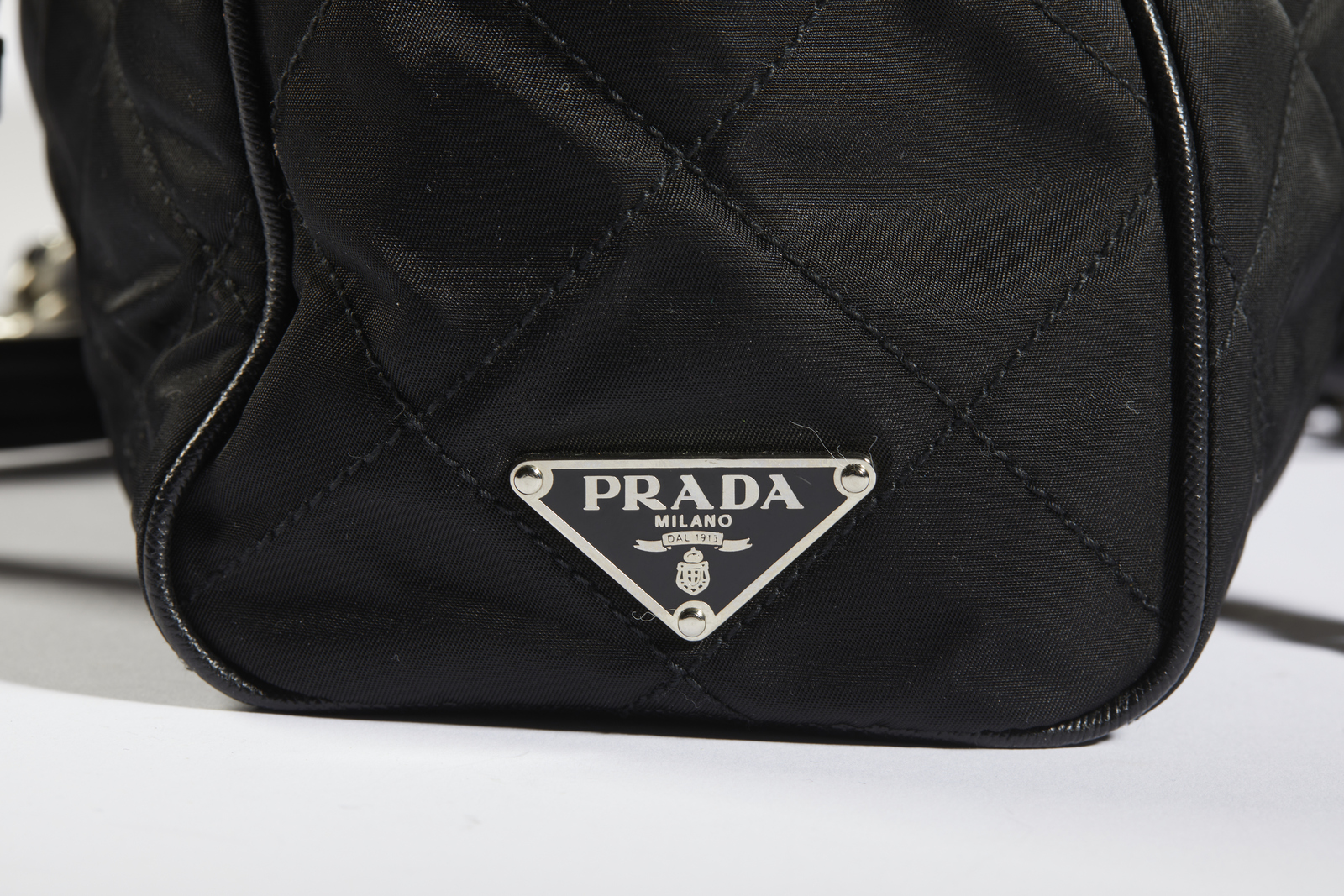 PRADA MILANO Borsa a tracolla nera. Nylon. Cm 28,00 x 25,00 x 6,50. Borsa a tracolla Prada vintage nel caratteristico tessuto di nylon trapuntato, nera, dettagli dell'hardware argentato, logo Prada/Milano triangolare su un lato, in basso, quattro piedini metallici alla base. Manici in catena intrecciata con pelle nera lavorazione Saffiano e le estremità in pelle nera Saffiano, decorate da cinghiette decorative. Interni in tessuto logo nero Prada, una tasca interna chiusa da zip, logo Prada/ Made in Italy presente. Eccellenti condizioni, inizio anni 2000. Dustbag presente.
