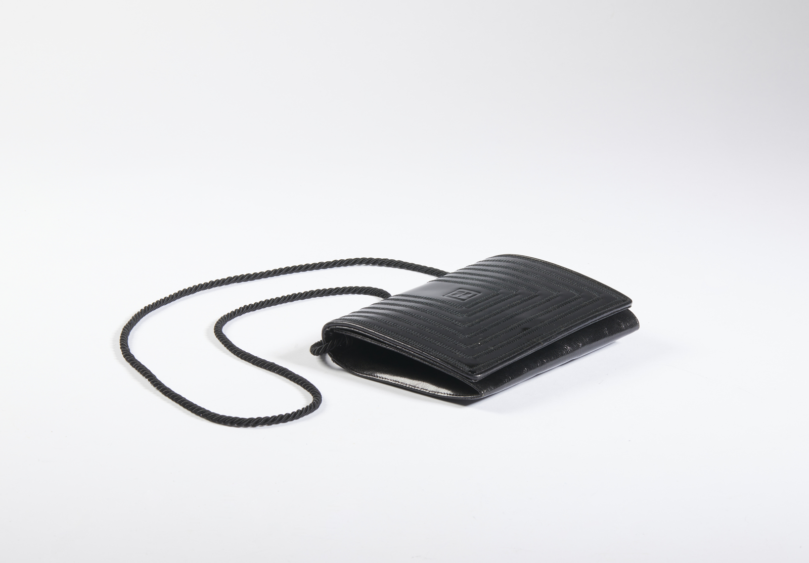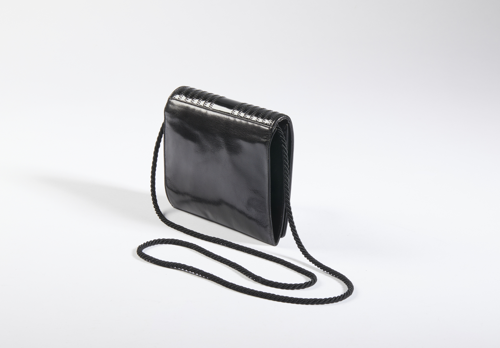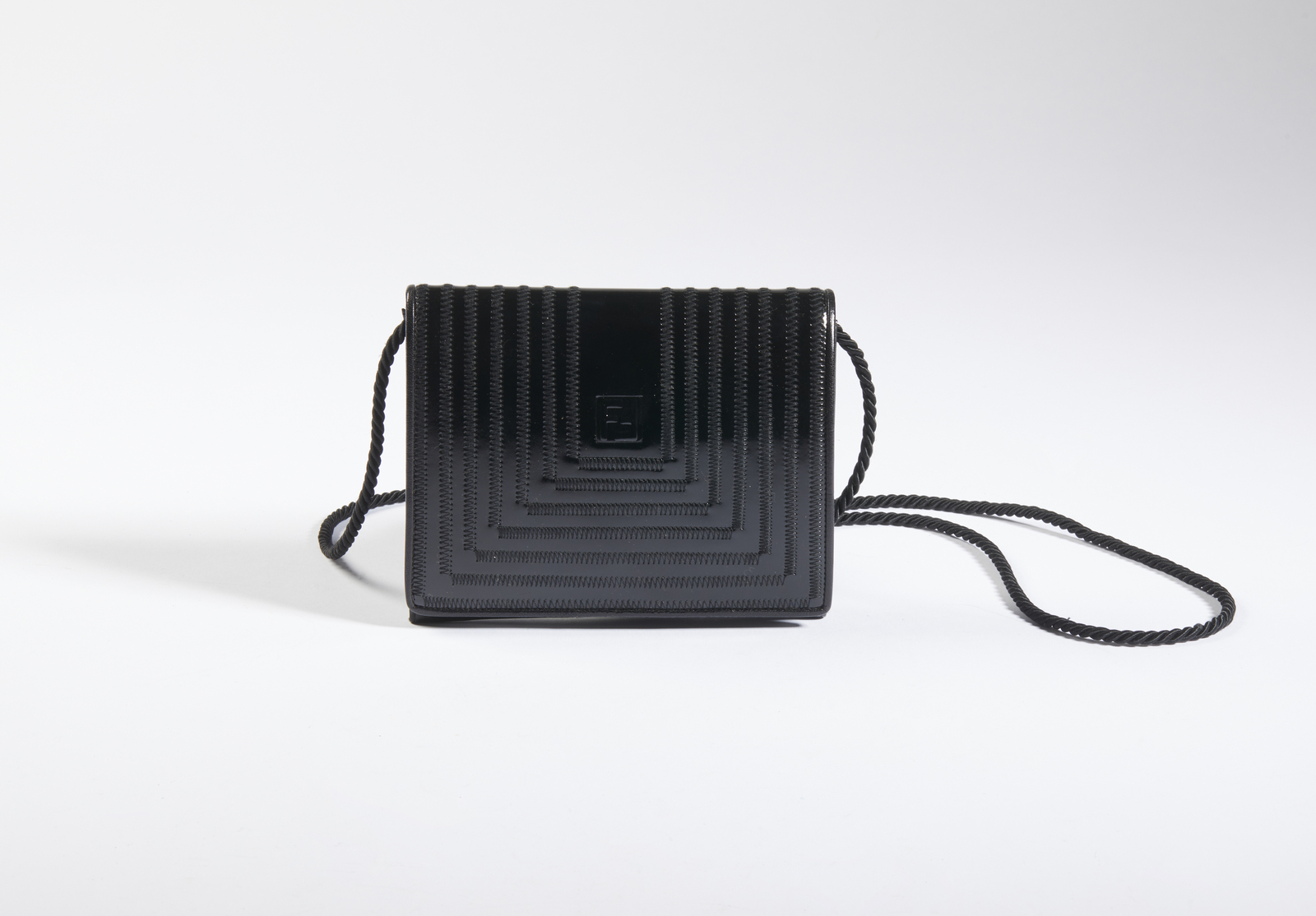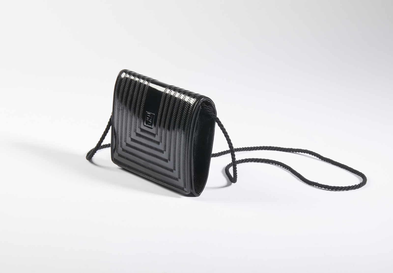 FENDI Borsetta nera a tracolla. Pelle. Cm 18,00 x 15,00 x 5,00. Borsetta da sera, a tracolla, in pelle nero lucido con impunture, con tracolla in cordoncino, lunghezza cm 60.