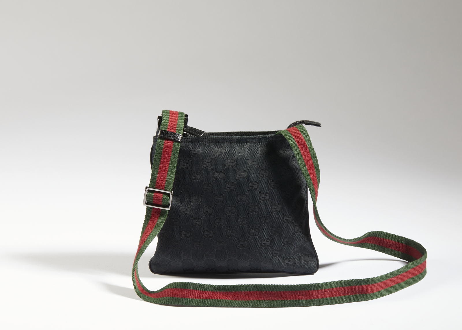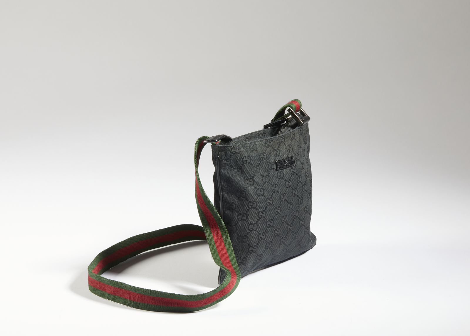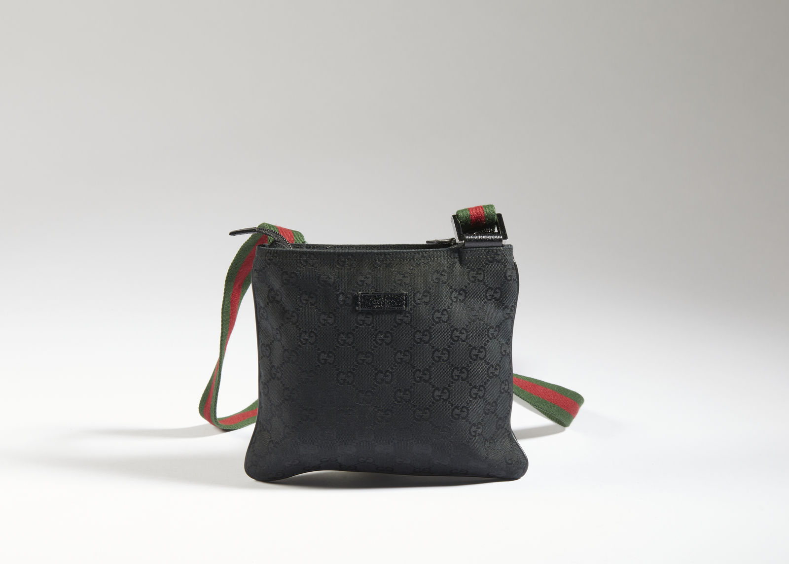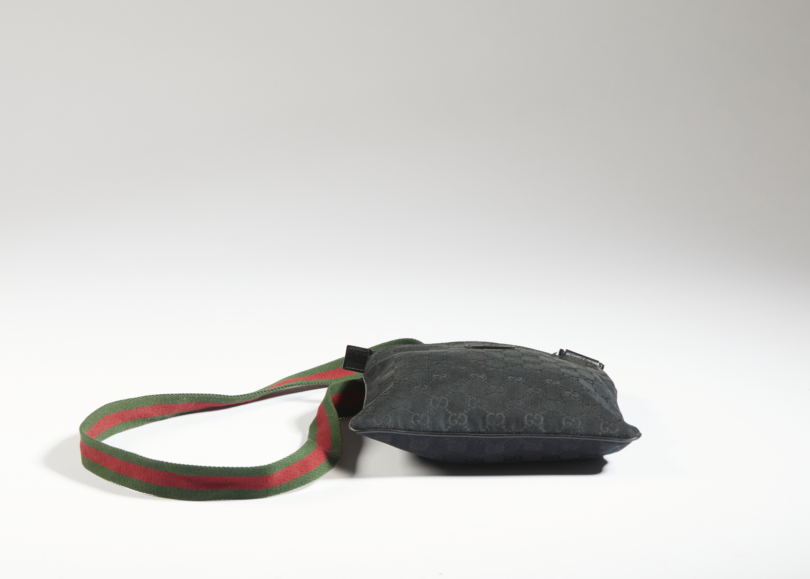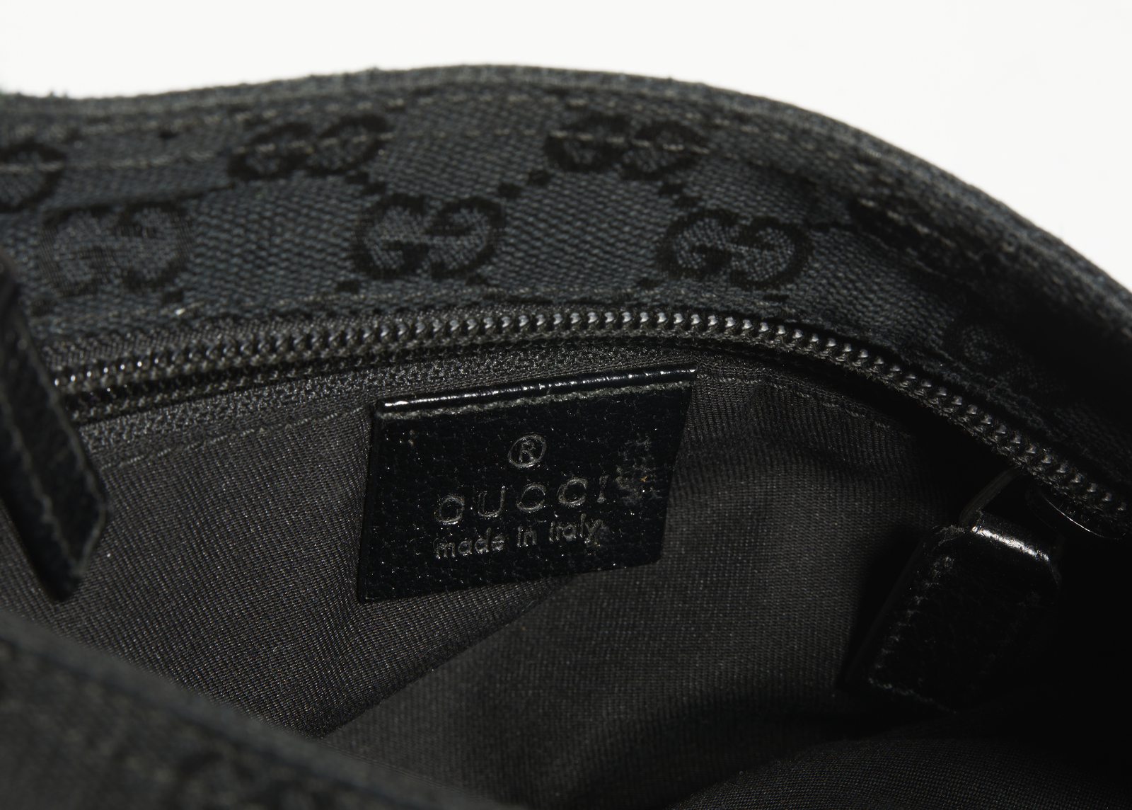 GUCCI Borsetta monogram in canvas nera con tracolla. 2000. Canvas. Cm 23,50 x 21,50 x 8,00. Borsetta Gucci vintage in tessuto canvas nero monogram Guccissima e tracolla in nastro web negli iconici colori rosso e verde. Logo Gucci /Made in Italy presente in etichetta di pelle all'esterno ed all'interno. Chiusura con zip. Ottime condizioni. Anni 2000.