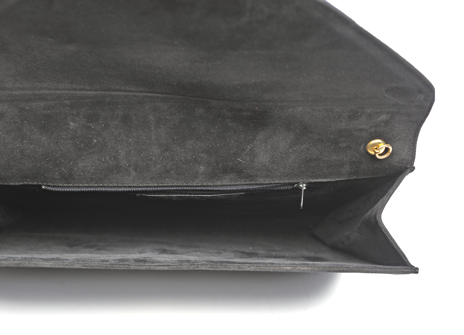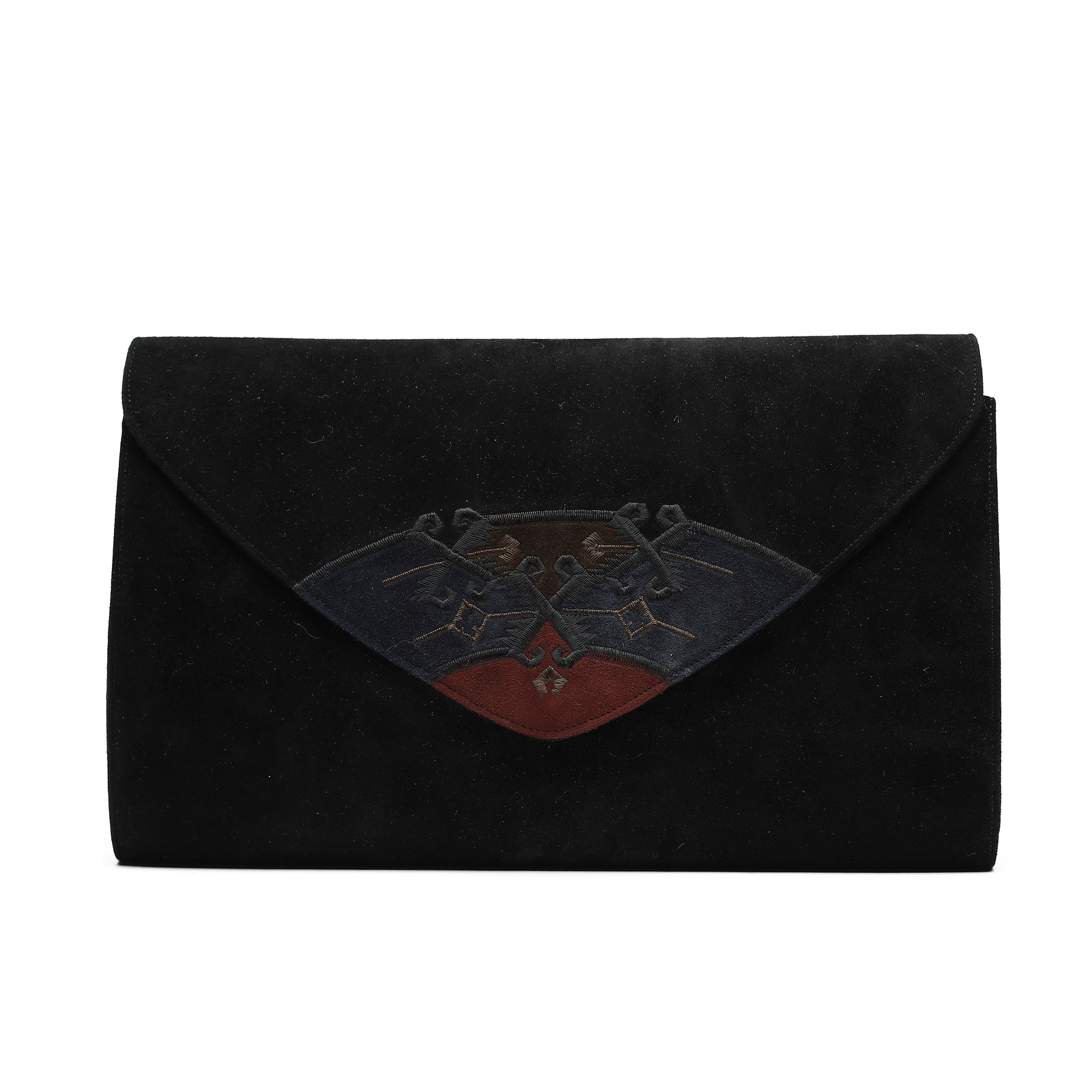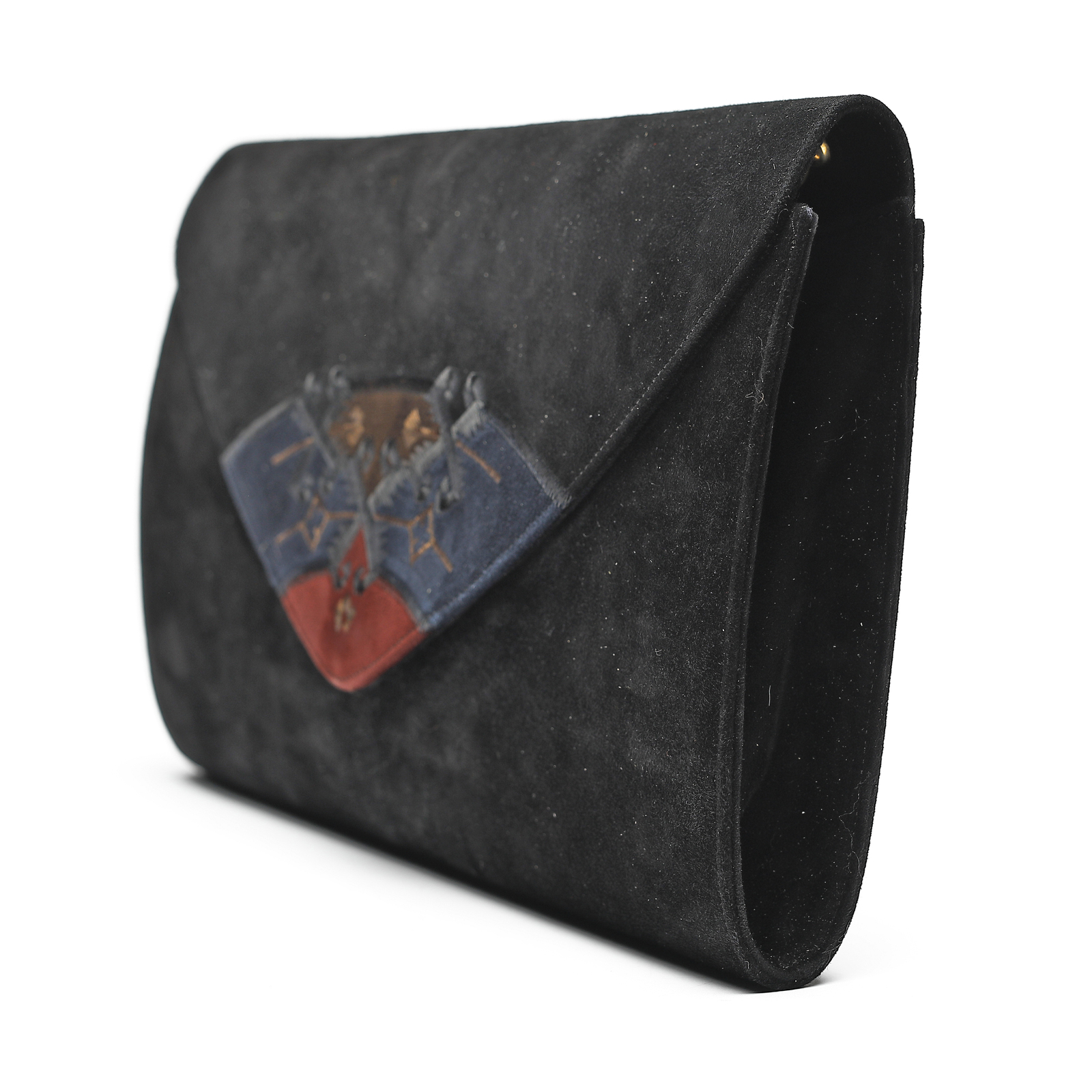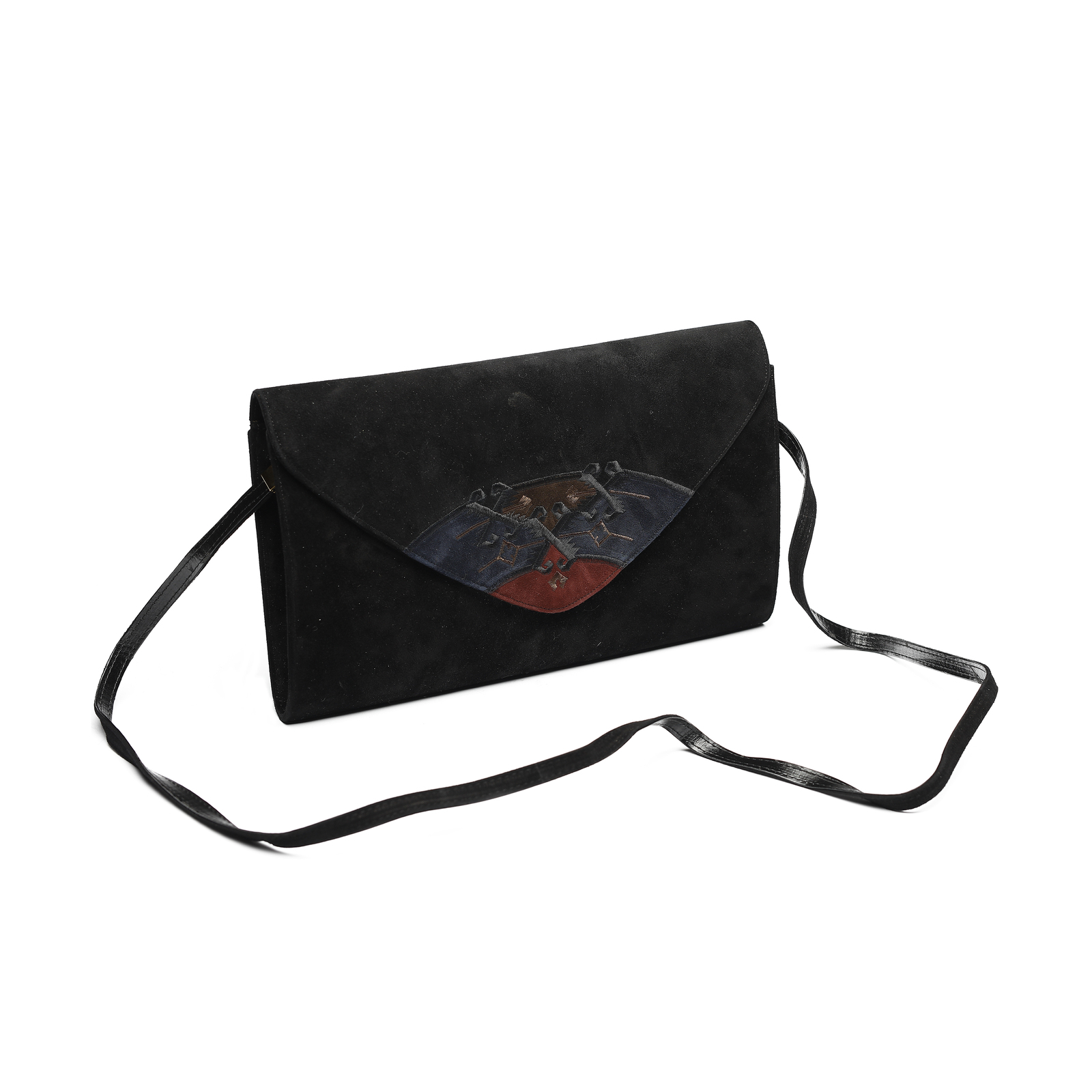 ROSSI SERGIO Pochette scamosciata in color nero con ricami. 1990. Pelle scamosciata. Cm 32,00 x 20,00 x 3,50. Borsa in camoscio nera con decoro a ricamo e inserti in camoscio a contrasto color marron bruciato, marrone e ardesia. Modello pochette trasformabile a tracolla, tracolla removibile interna. All'interno una tasca a zip. Etichetta Sergio Rossi.