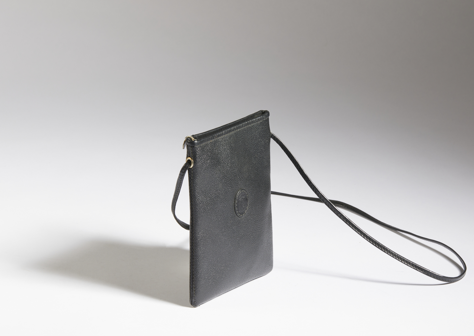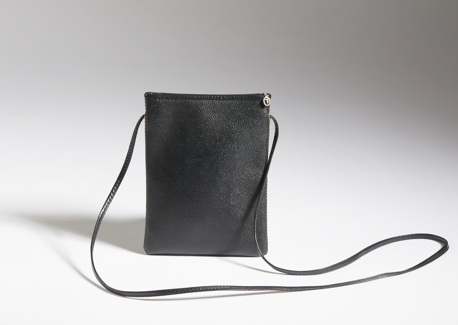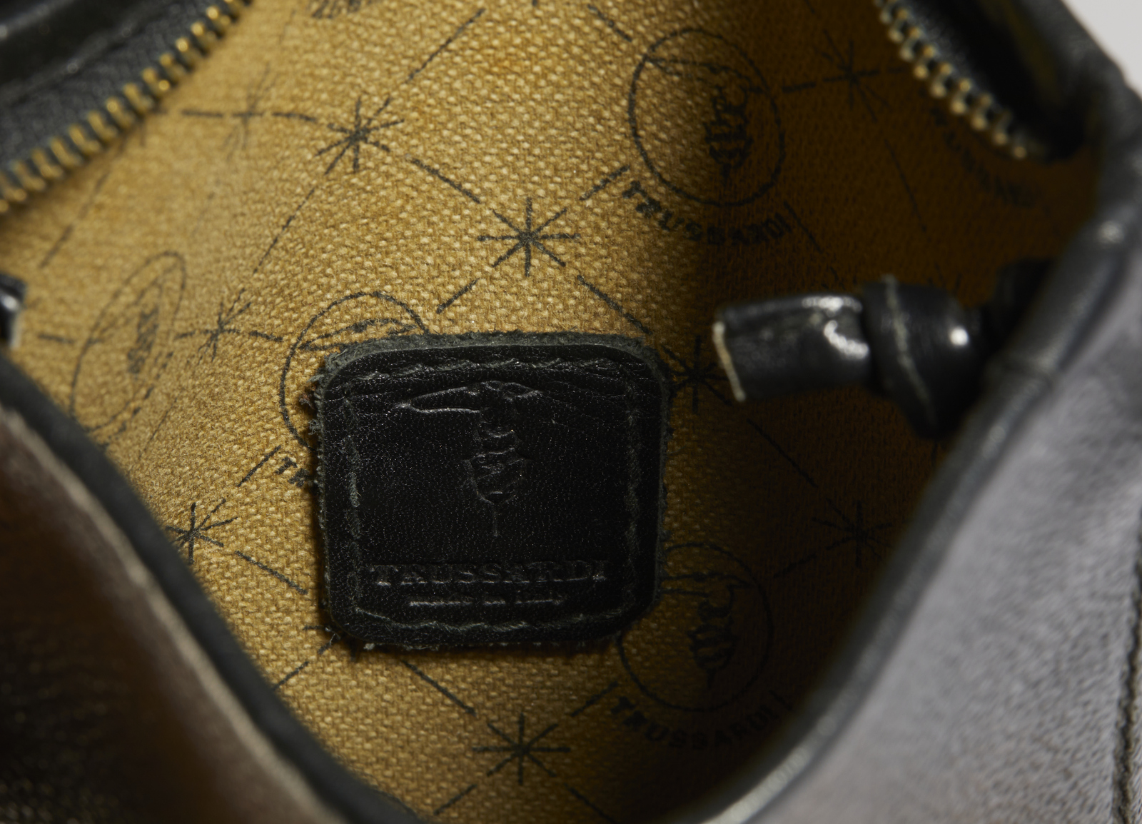 TRUSSARDI (n. 1911) Borsa a tracolla nera. Canvas. Cm 14,50 x 19,00 x 0,50. Borsetta a tracolla in canvas effetto pelle martellata nera, con profilo superiore e tracollina in pelle nera Trussardi vintage. Chiusura a zip, elemento zip con l'emblema del brand, profilo di piccolo levriero italiano. Interni in canvas logo, etichetta Trussardi all'esterno ed all'interno. Dustbag.