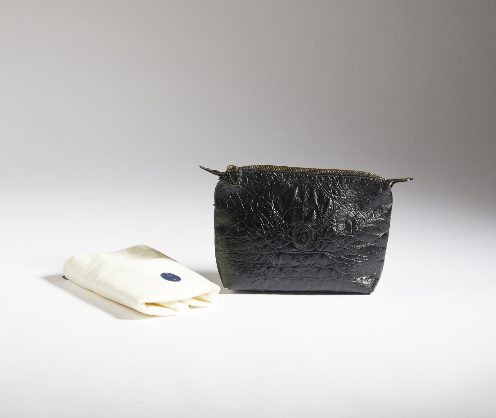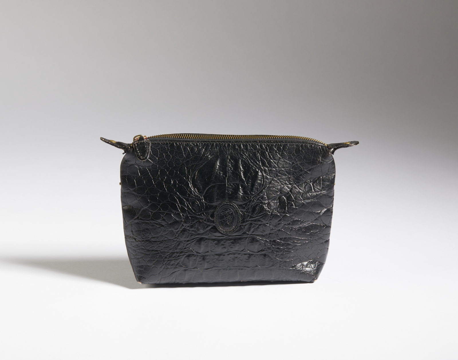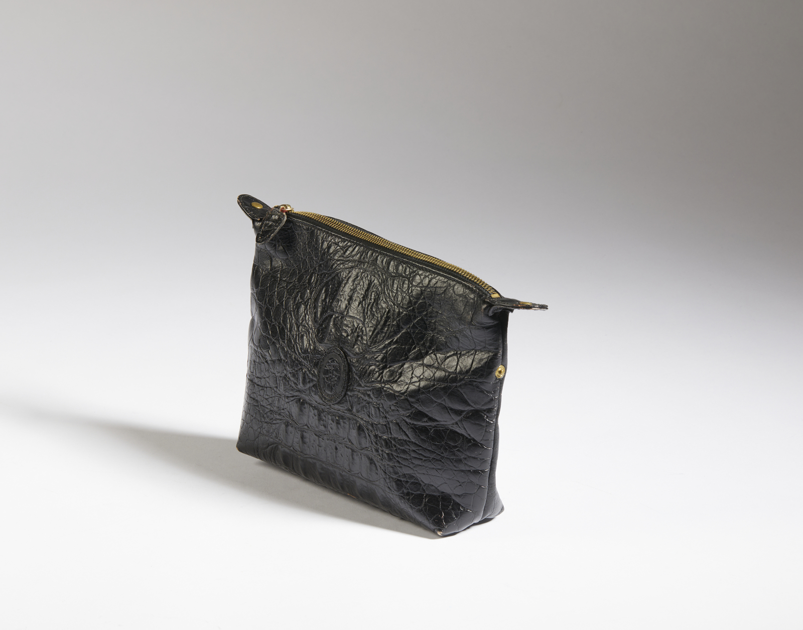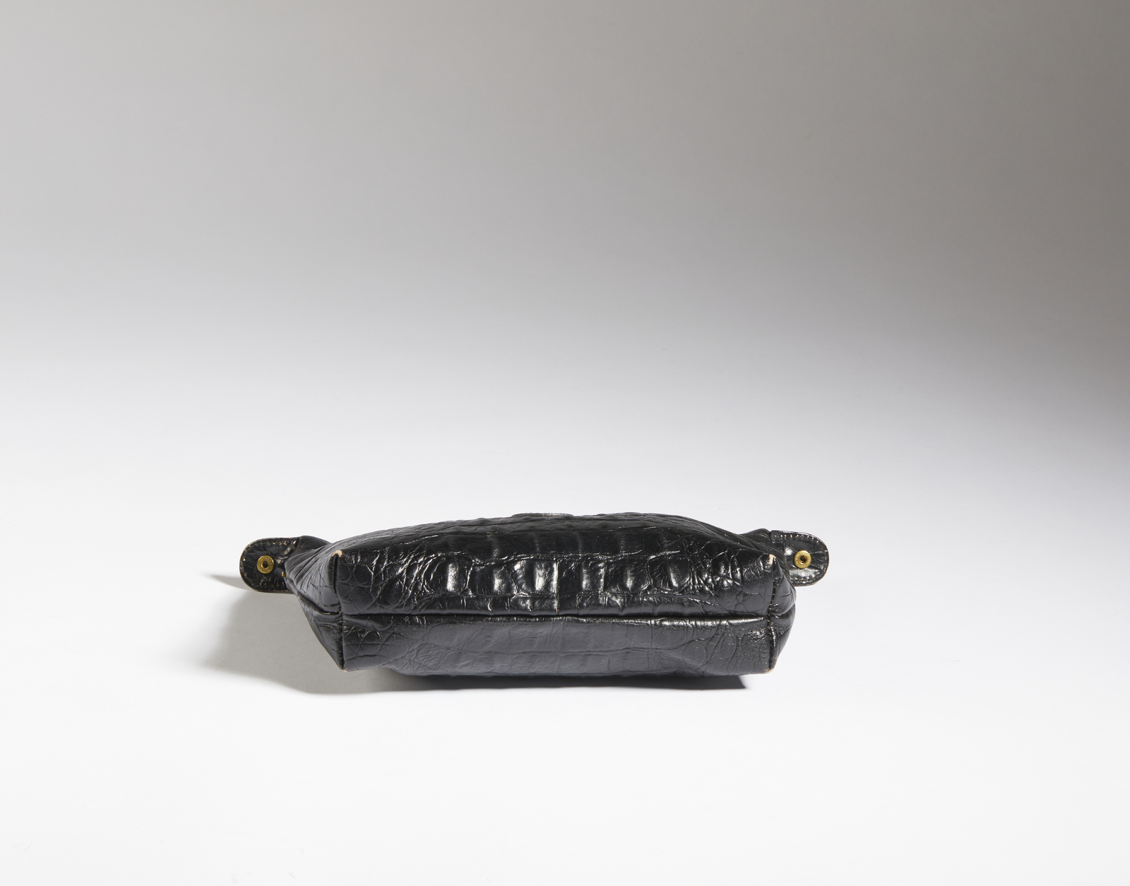 TRUSSARDI (n. 1911) Pochette nera stampa cocco. Argento 925.. Cm 26,00 x 20,00 x 5,00. Pochette in pelle nera stampata effetto coccodrillo Trussardi vintage, logo Trussardi al fronte, interni in tessuto rigato, logo Trussardi /made in Italy stampato all'interno, chiusura a zip. Piccolo difetto di scoloritura agli angoli. Dustbag.