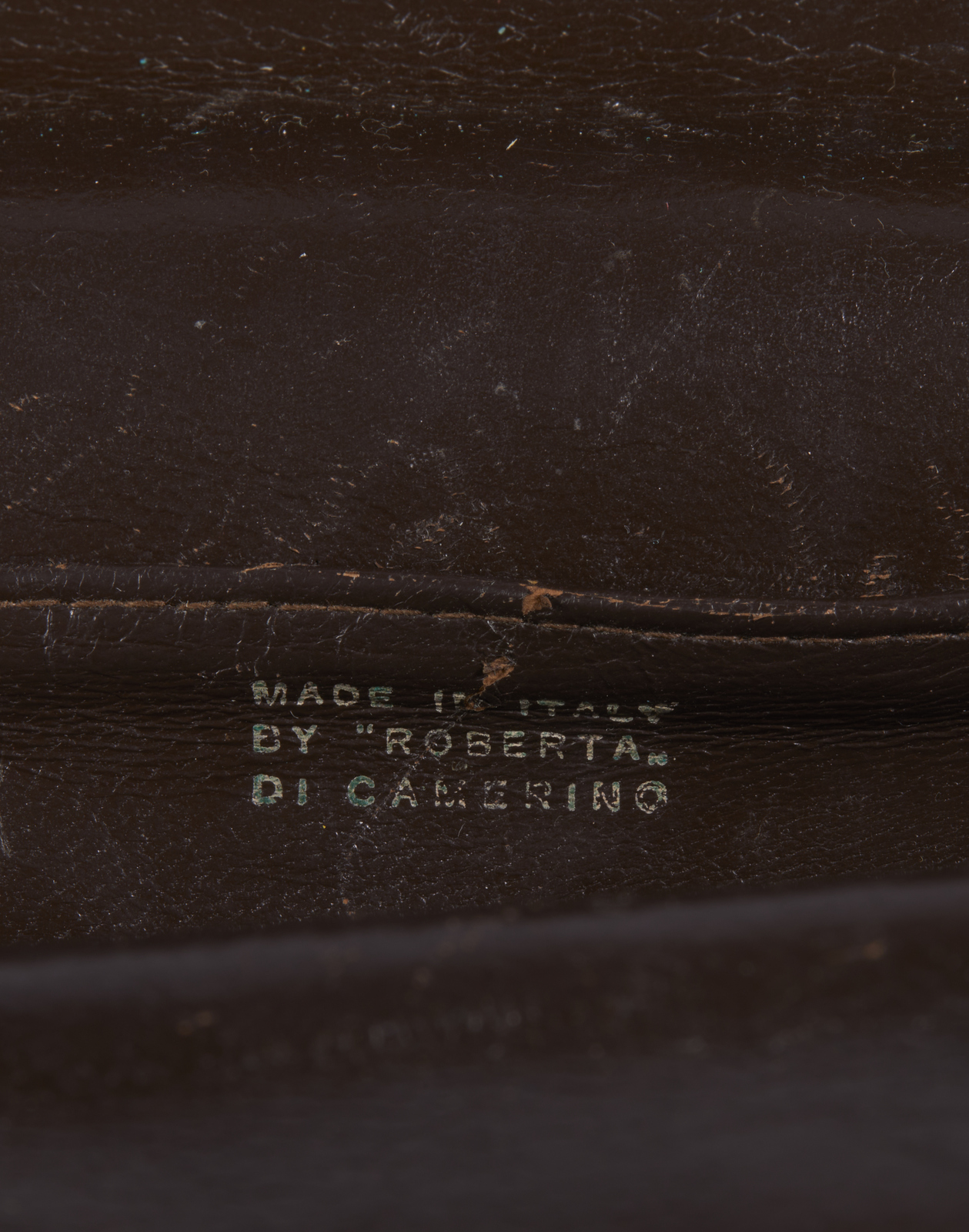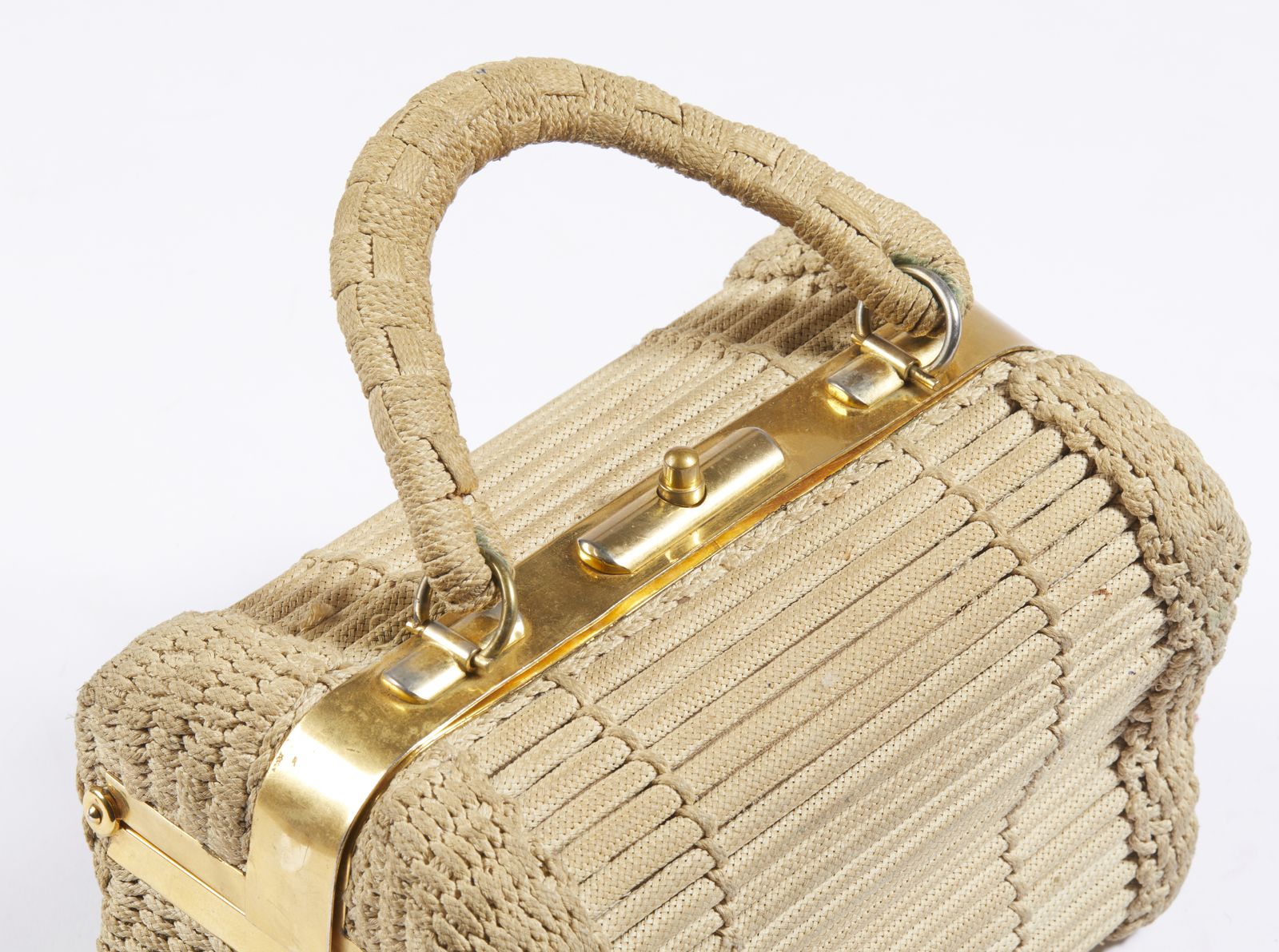 DI CAMERINO ROBERTA Borsa in rafia beige modello piccolo a mano. rafia e metallo dorato. . Borsetta a mano Roberta di Camerino vintage in rafia beige, profili in metallo dorato, manico in rafia intrecciata beige, chiusura a scatto, firma all'interno in caratteri dorati Made in Italy/ by Roberta di Camerino. Una taschina interna aperta, interni in pelle marrone,