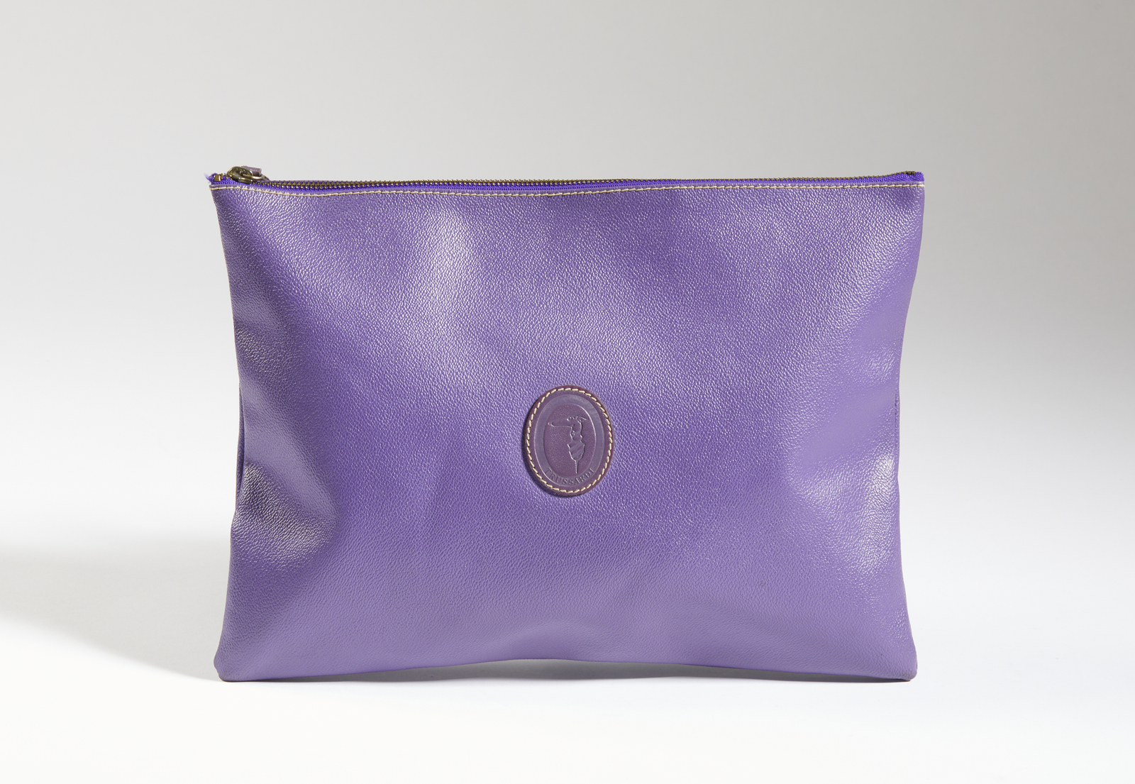 TRUSSARDI (n. 1911) Pochette viola. Canvas. Cm 35,00 x 26,00 x 0,50. Grande pochette, da utilizzare anche come porta documenti o custodia di computer portatile, in canvas viola effetto pelle martellata Trussardi vintage. Chiusura a zip, Logo Trussardi all'esterno sul fronte ed all'interno in pelle viola, interni in canvas logo Trussardi. Condizioni eccellenti.