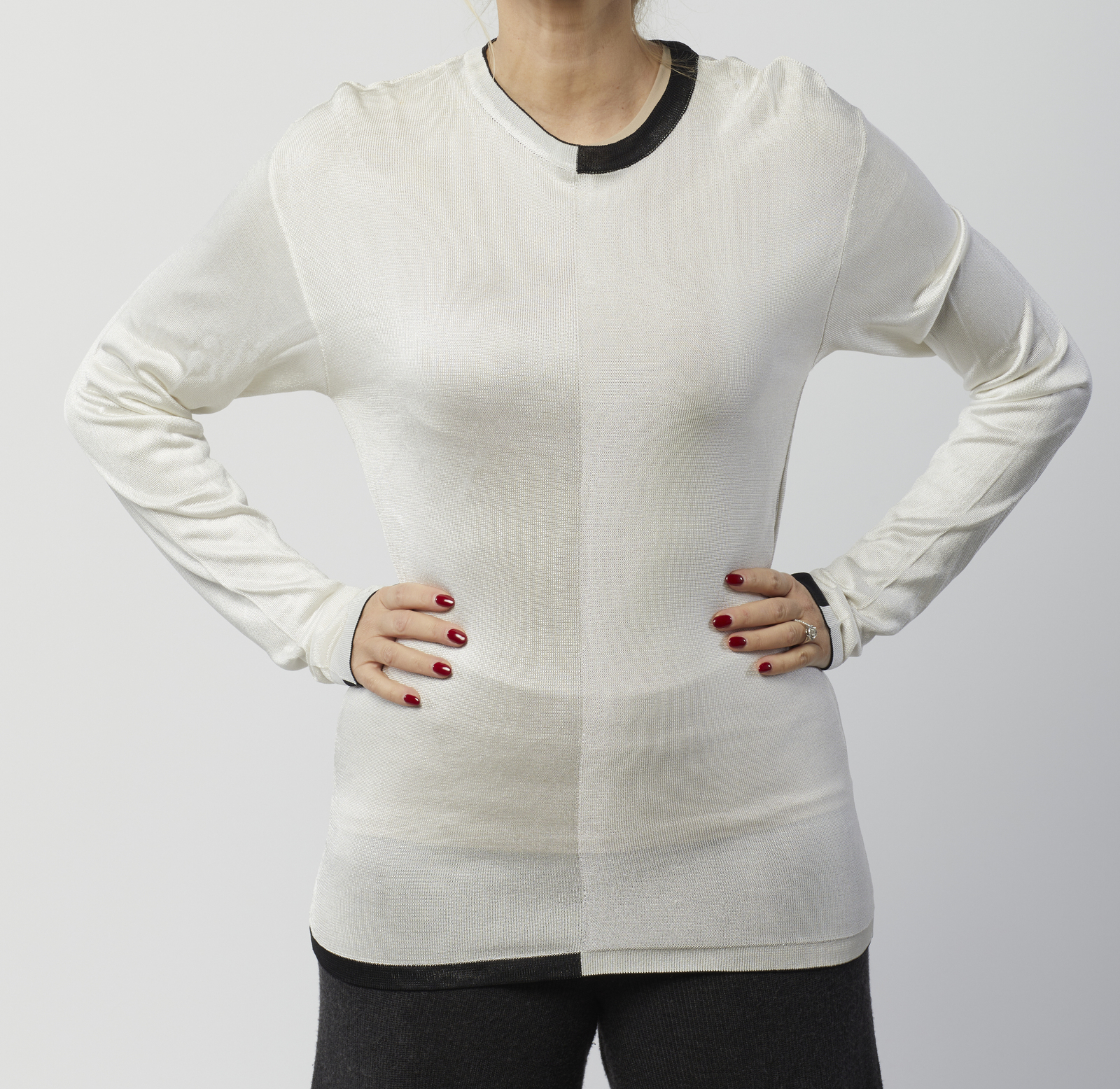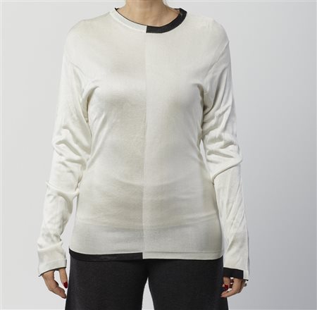 SCHON MILA Maglia in viscosa bianca con profili bianchi e neri a contrasto. Viscosa e seta. . Maglia Mila Schon vintage in maglia di viscosa bianca con profili bianchi e neri a contrasto al collo, il bordo inferiore ed i polsini. Taglia S indicativa.