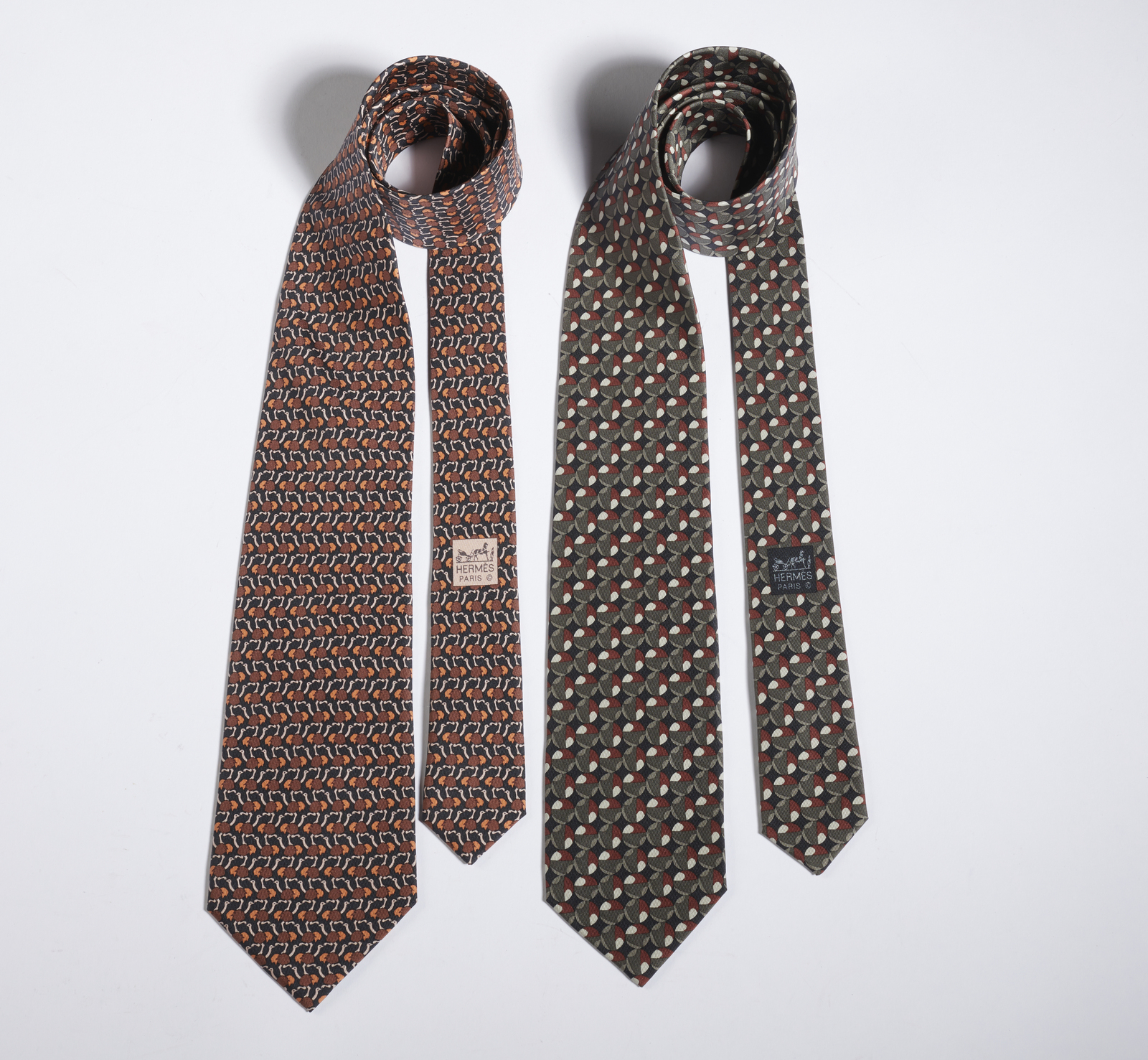 HERMES Lotto composto da due cravatte. Seta. . Lotto composto da due cravatte vintage Hermès fantasia. Una cravatta a fondo nero, fantasia di struzzi in due toni di marrone; una cravatta con fantasia geometrica con elementi circolari verde militare, terra di siena e bianchi su fondo nero. Entrambe presentano la firma Hermès al retro.