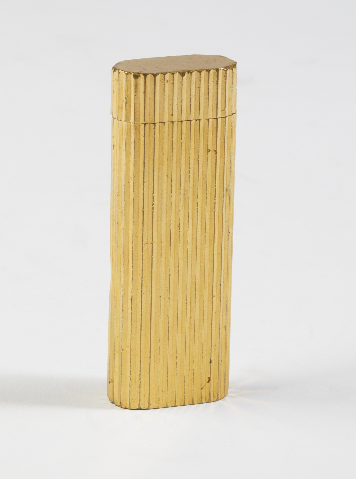 CARTIER Accendino placcato oro. Metallo dorato. Cm 2,80 x 7,00. Accendino da tasca Cartier in metallo placcato oro, forma rettangolare, rigato, firma incisa alla base.
