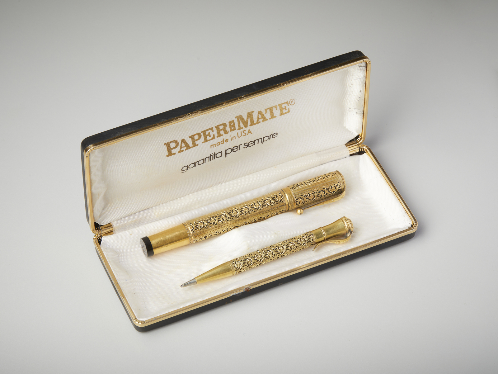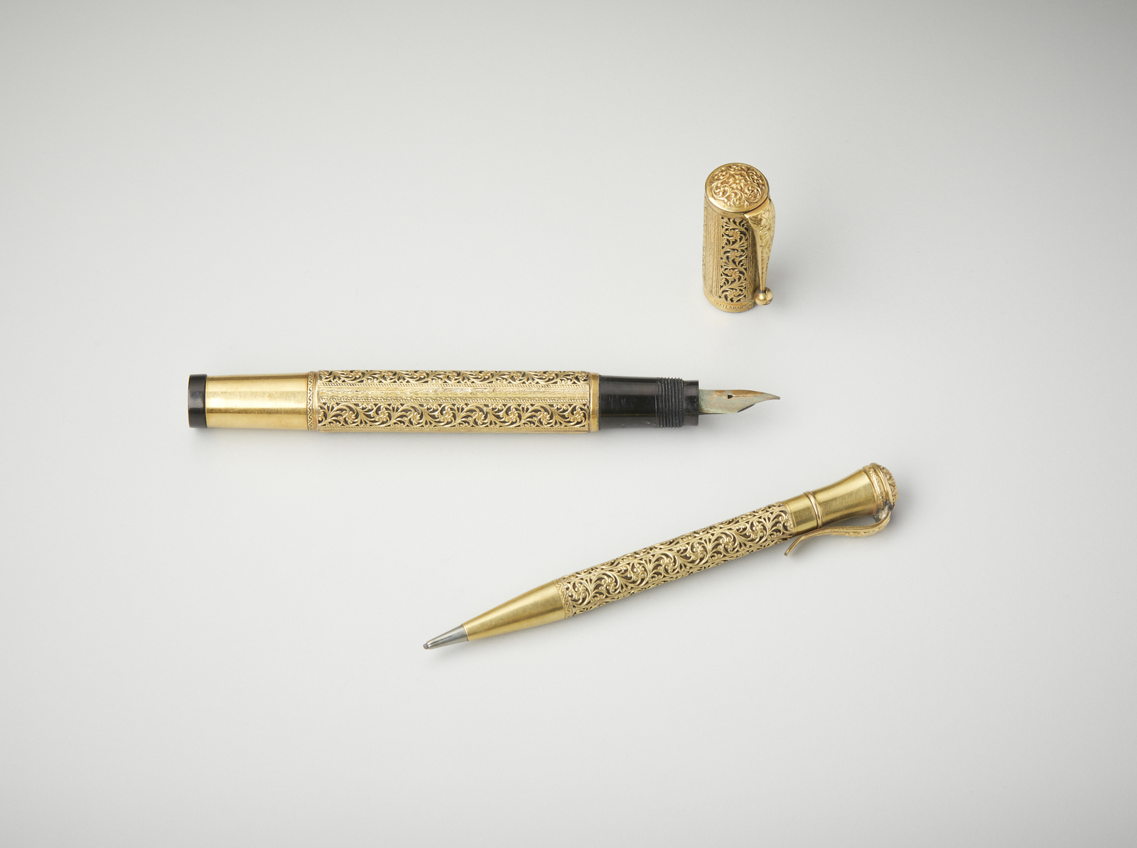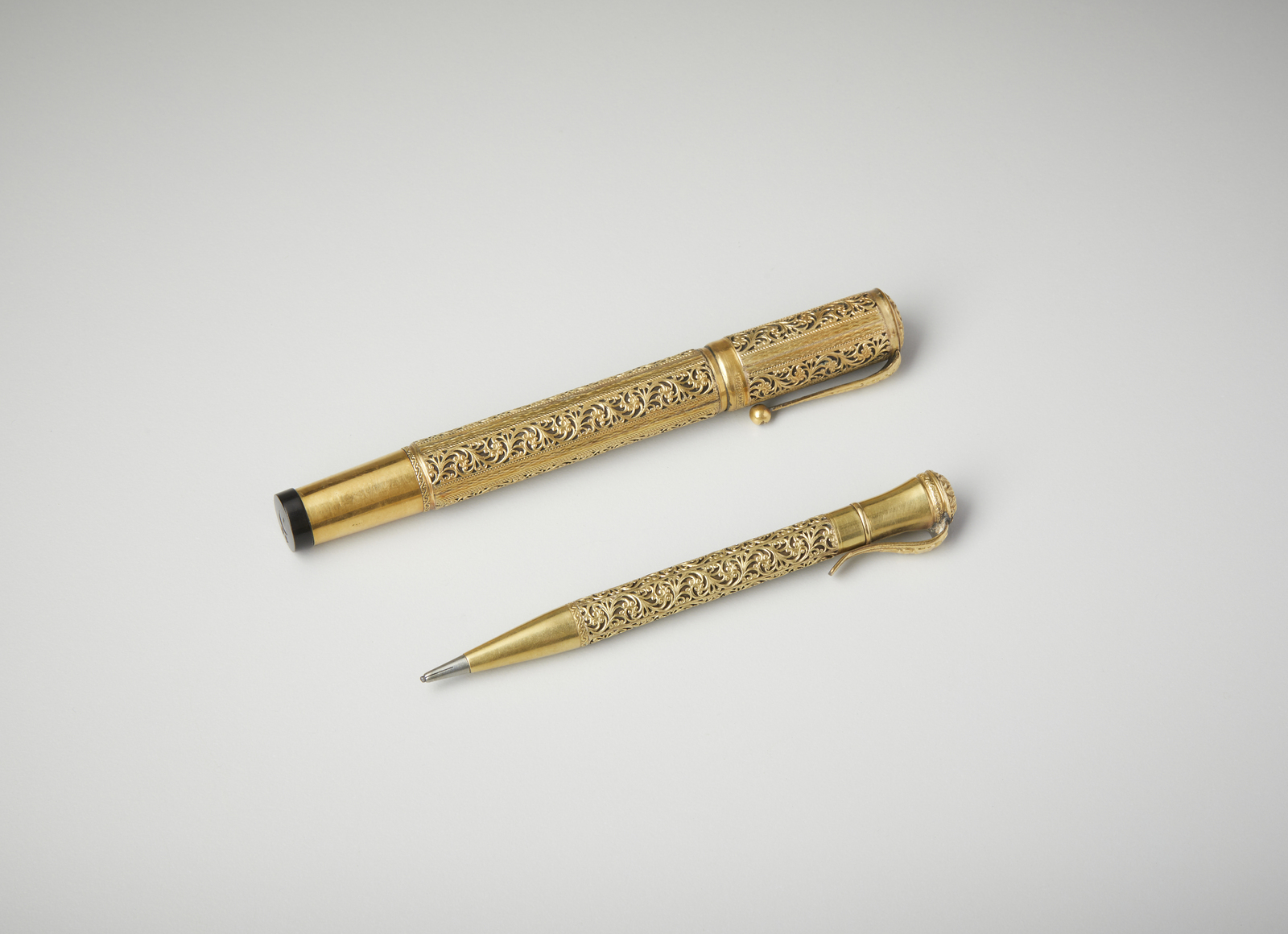 . Penna stilografica e matita . . . Penna stilografica e matita con incisioni floreali "Watermann" in lamina d'oro giallo 18 carati.