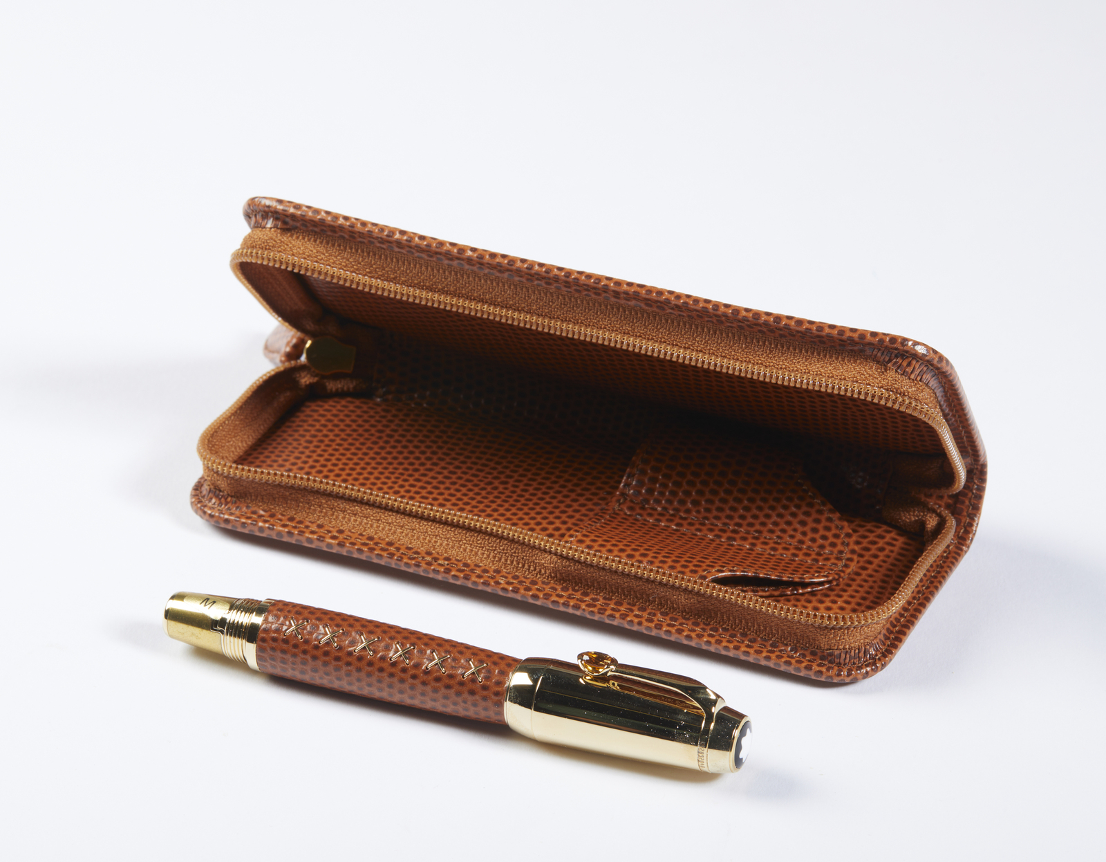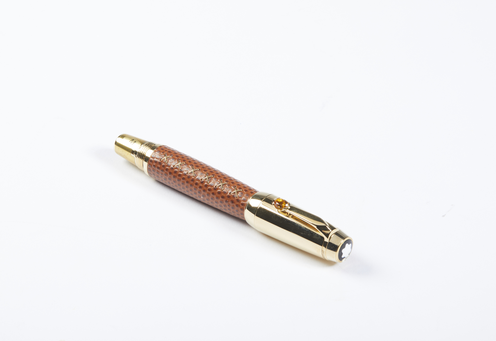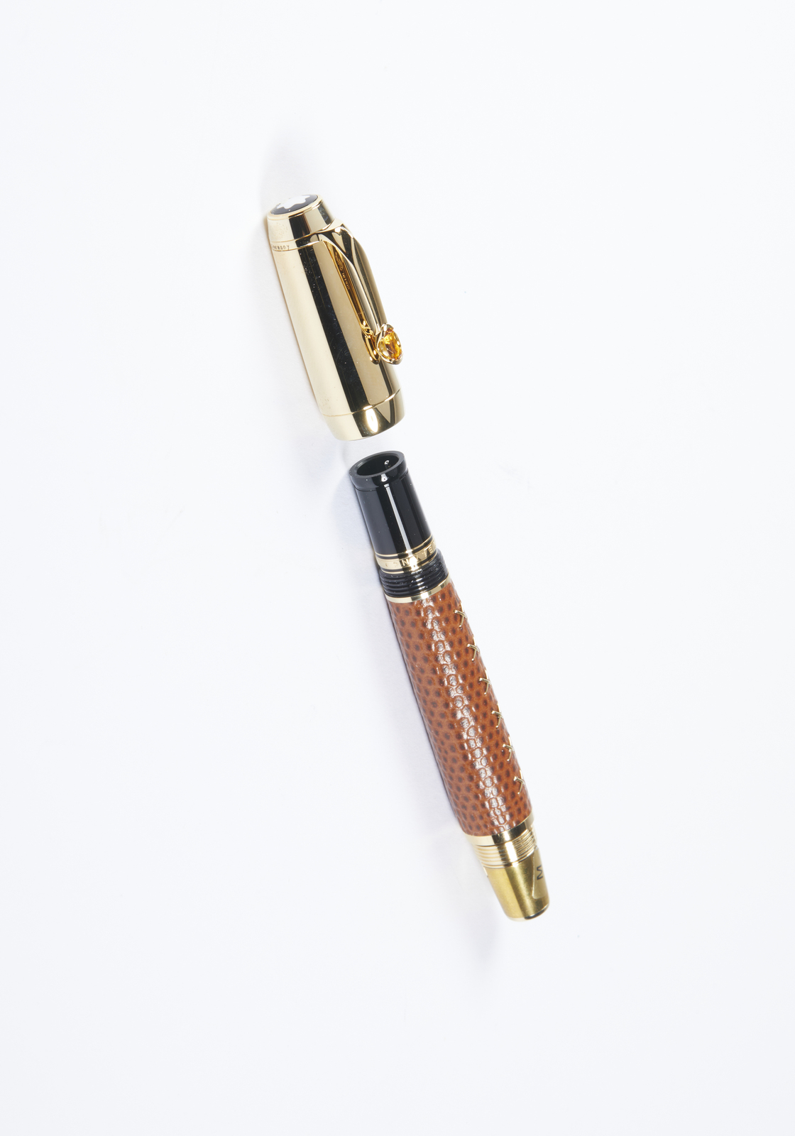MONT BLANC Penna collezione Boheme Jewels Citrino e astuccio coordinato. Pelle e acciaio. . Penna MontBlanc in acciaio laminata oro, con finiture laminate in oro giallo, un citrino a decorazione della clip. la struttura della penna rivestita in pelle effetto rettile color caramello, un elegante astuccio in pelle effetto rettile color caramello coordinato, scatole, sovrascatole e libretti.
