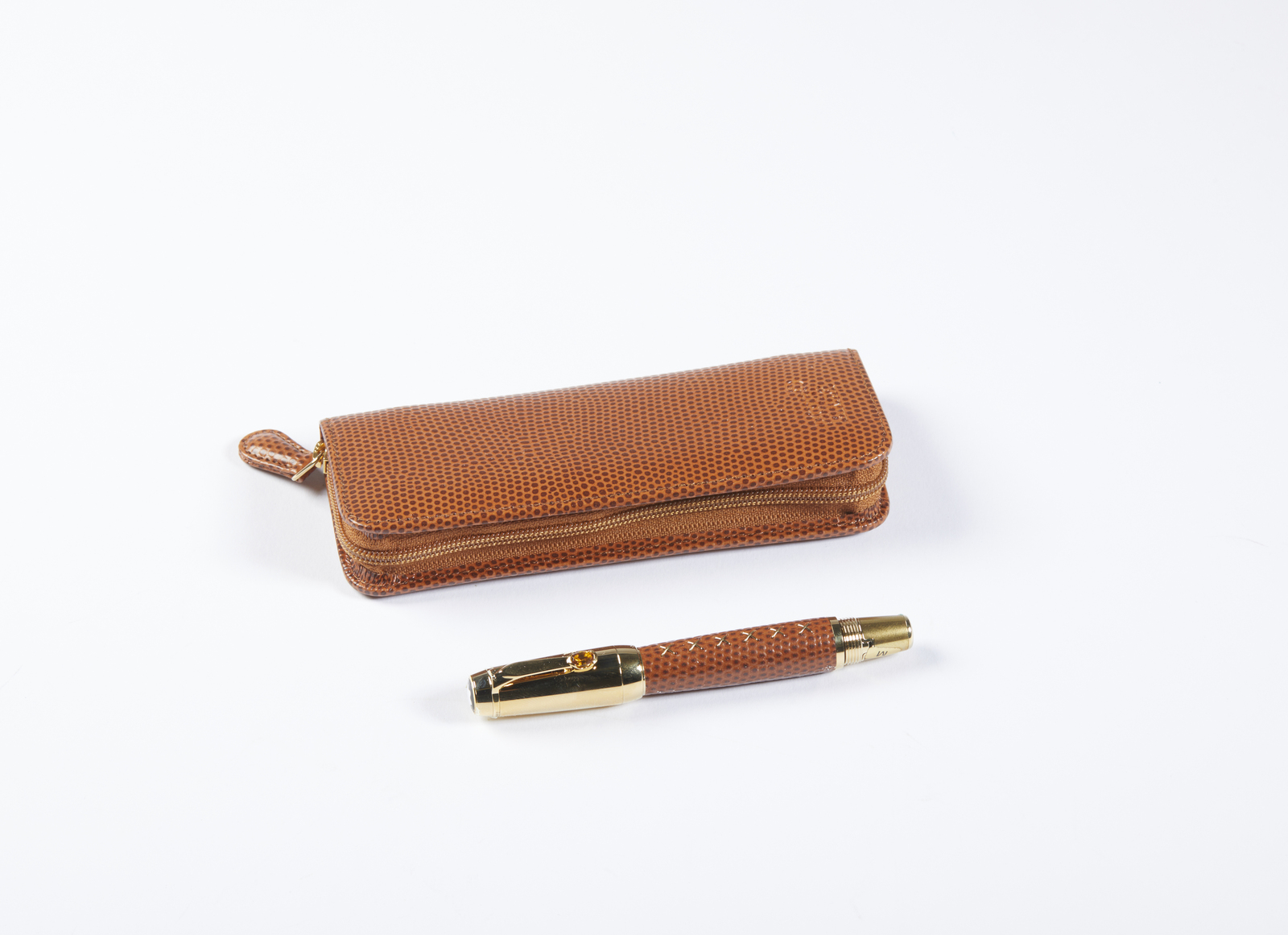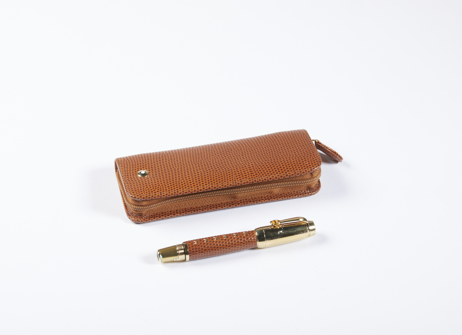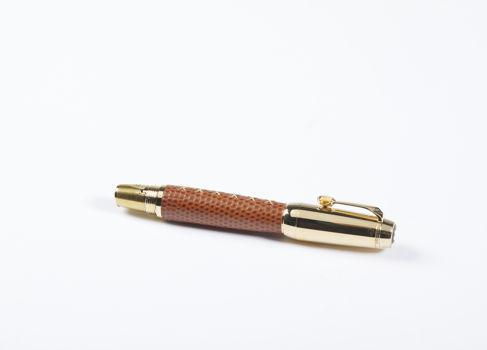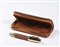 MONT BLANC Penna collezione Boheme Jewels Citrino e astuccio coordinato. Pelle e acciaio. . Penna MontBlanc in acciaio laminata oro, con finiture laminate in oro giallo, un citrino a decorazione della clip. la struttura della penna rivestita in pelle effetto rettile color caramello, un elegante astuccio in pelle effetto rettile color caramello coordinato, scatole, sovrascatole e libretti.