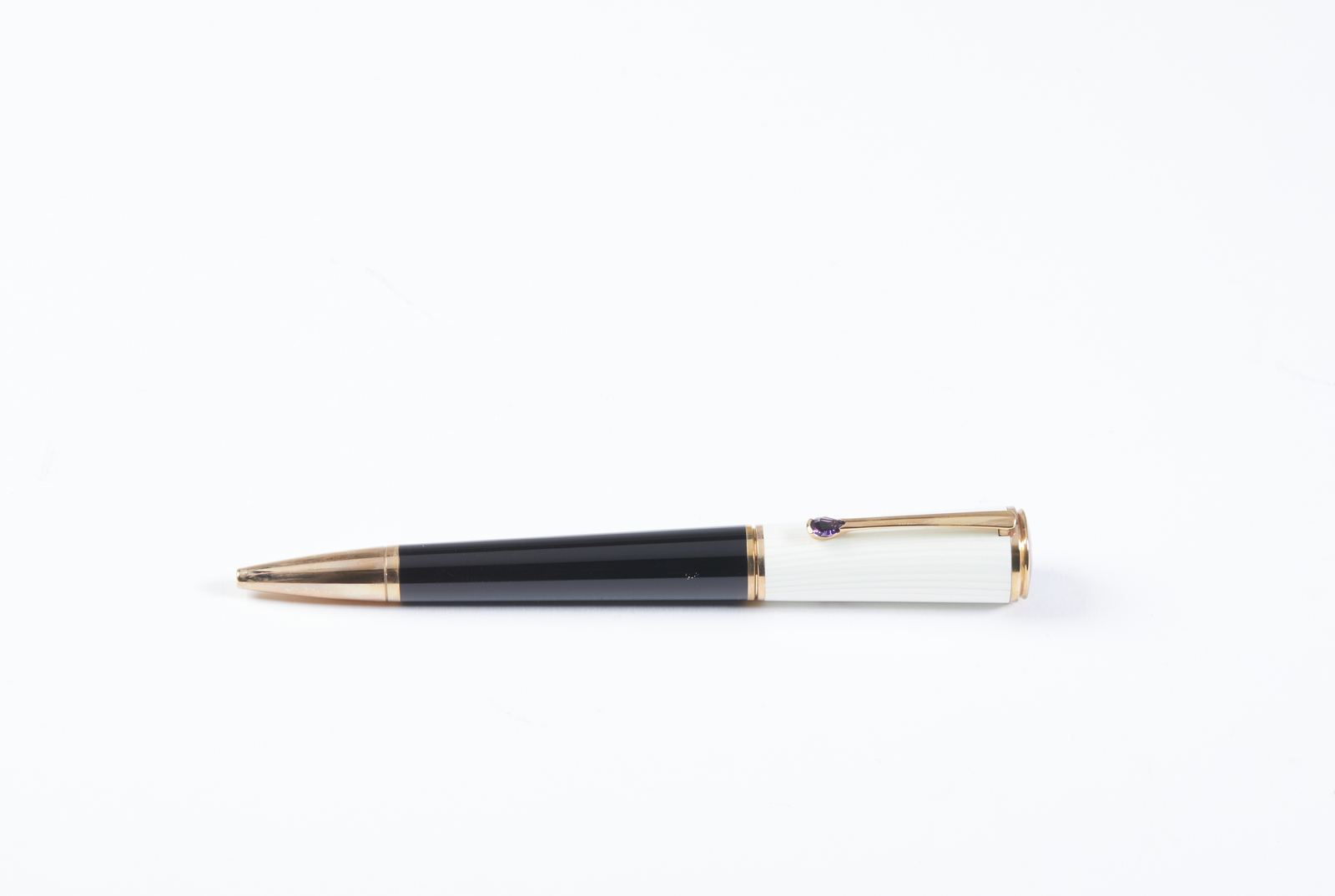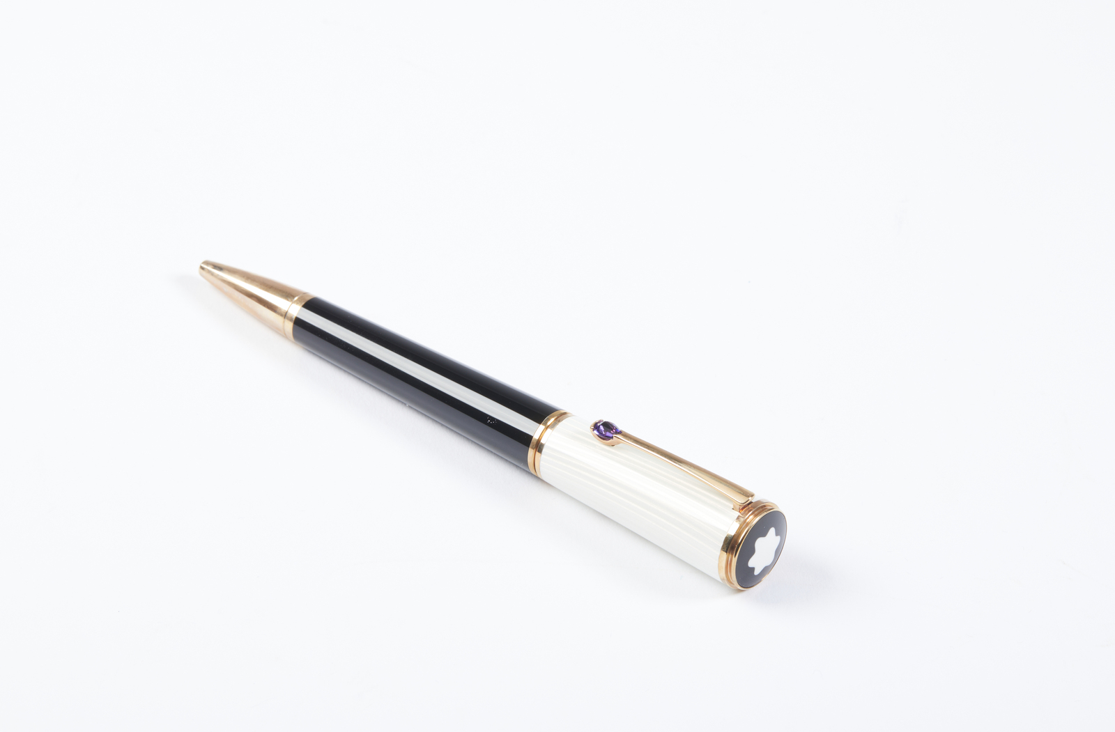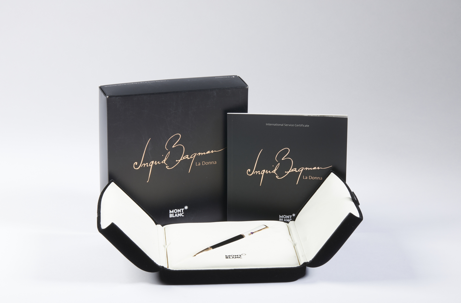 MONT BLANC Mont Blanc Diva Line Ingrid Bergman, penna a sfera,. Resina. . Elegante penna a sfera Mont Blanc, Diva Line, Ingrid Bergman, edizione limitata.ispirata alla raffinata eleganza che caratterizza la fine degli anni '40, dal design sobrio e seducente, dalla silhouette d'altri tempi in resina nera, decorazioni e finiture in oro rosa, un cappuccio laccato impreziosito da un gioco d'iridescenze madreperlacee. Edizione del 2009, presenta inoltre un'ametista a goccia sulla clip, l'autografo della diva inciso sul cappuccio ed una parte finale della penna a sfera placcato oro. Scatola originale in velluto foderato di bianco, con sovrascatola in cartone con il logo dell'edizione speciale.