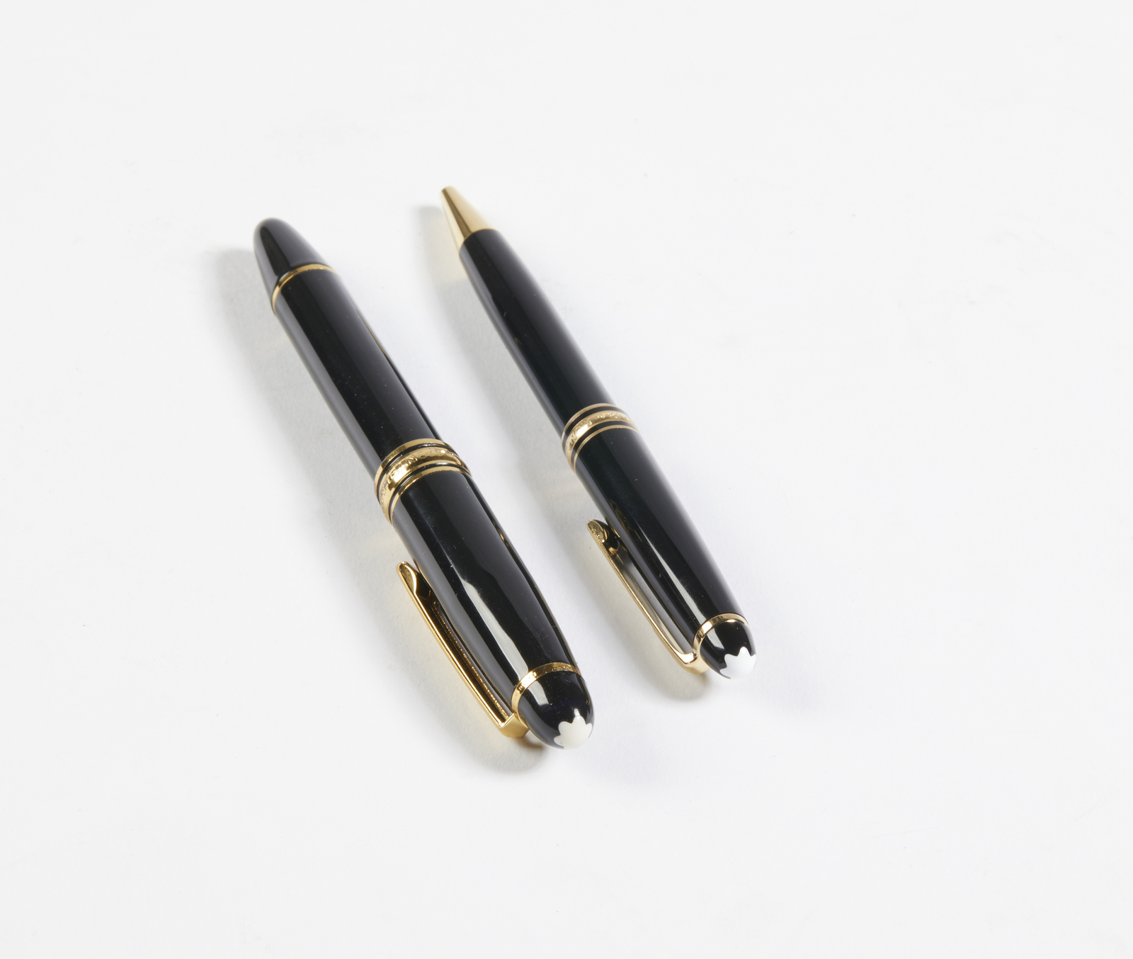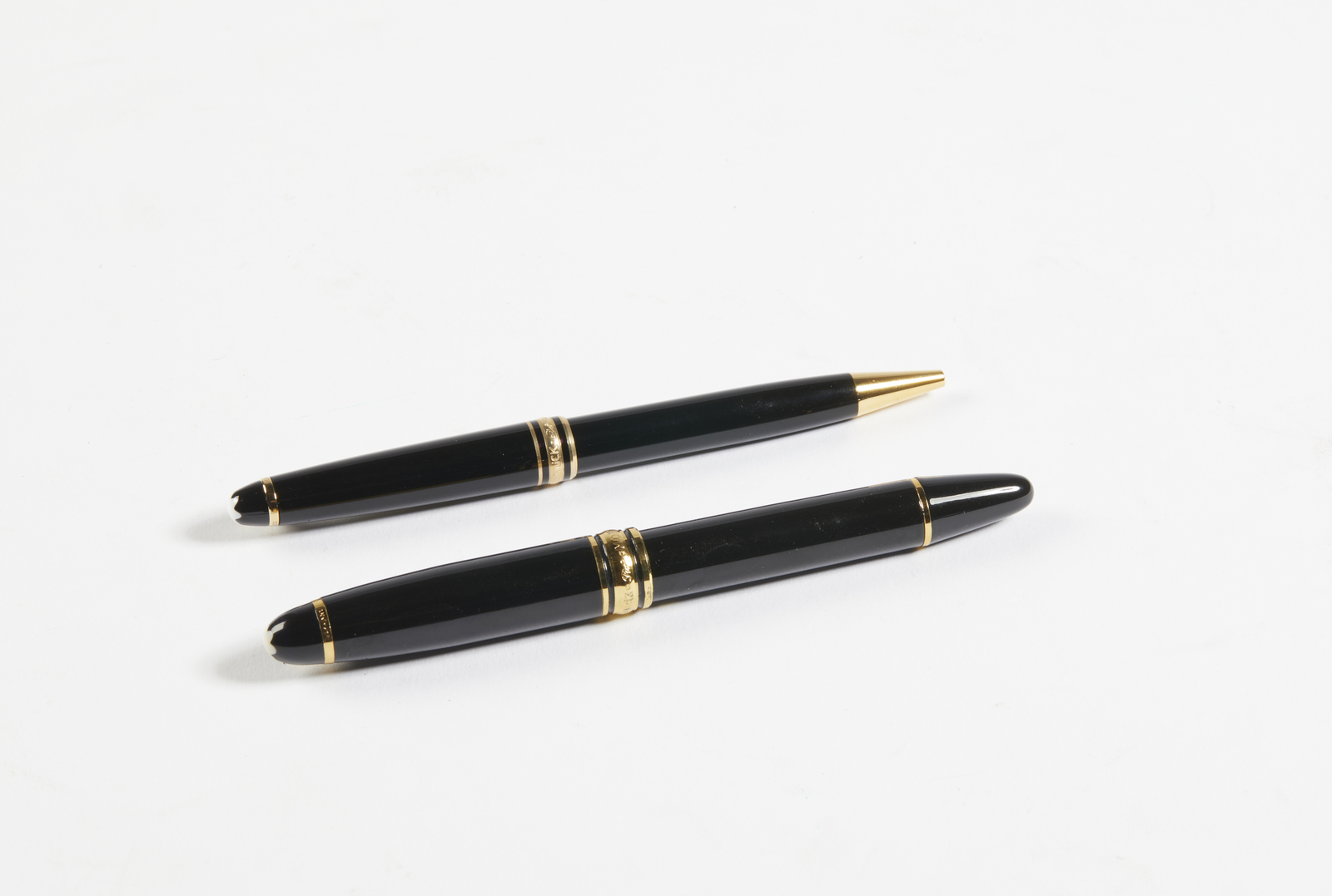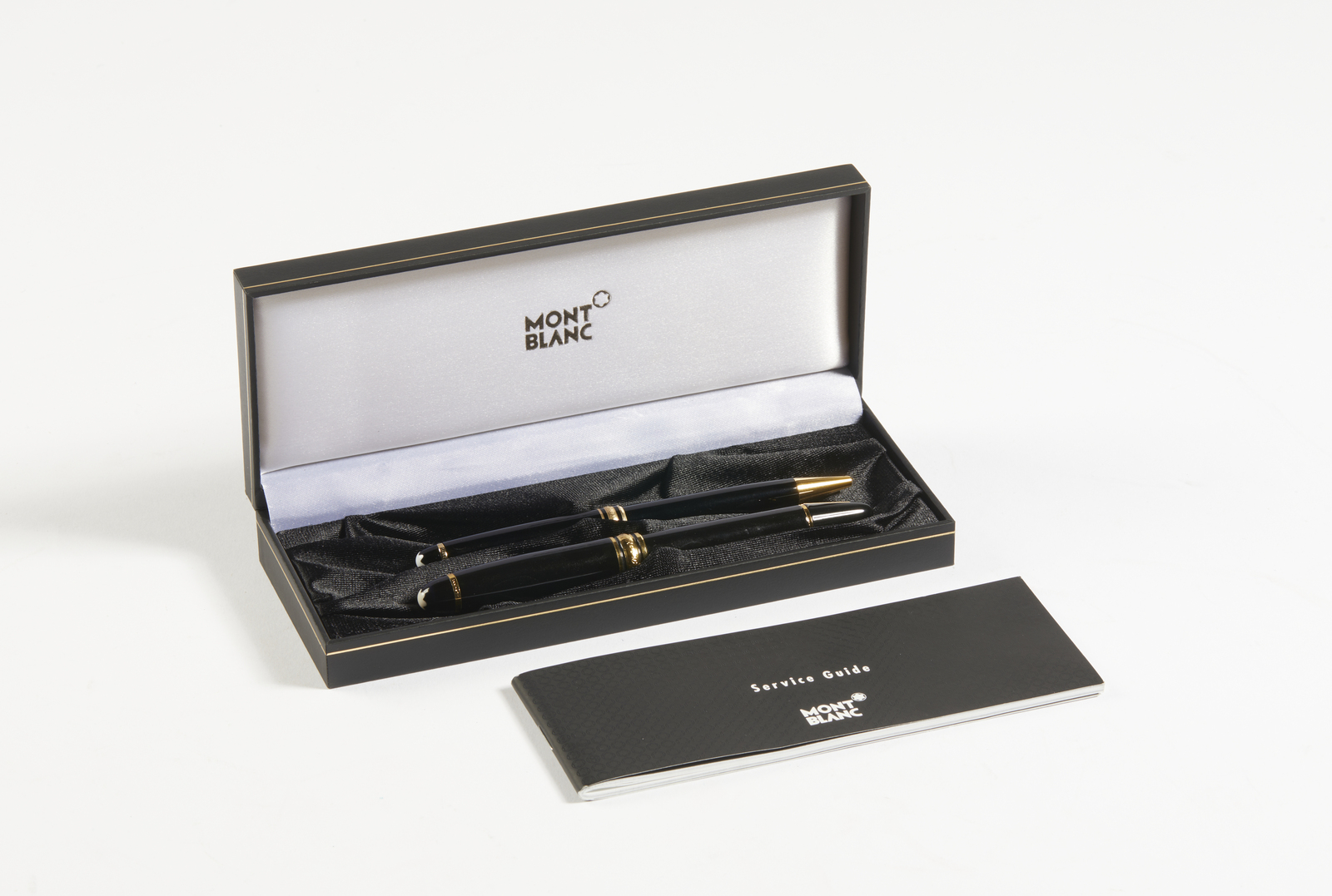 MONT BLANC Penna a sfera e penna stilografica. Acciaio cromato e plastica. . Lotto composto da una penna a sfera Meisterstuck gold e una penna stilografica. Scatola presente.