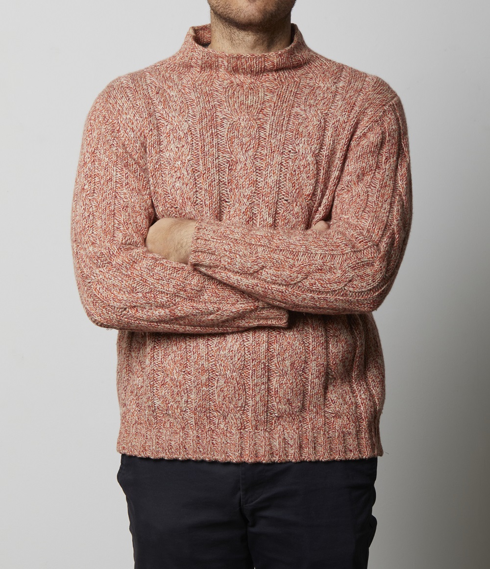 MALO Maglione multicolore a collo alto. Seta. . Maglione in filato melange rosso e bianco, motivo intrecciato, collo alto, capo classico ed immediatamente riconoscibile dell'estetica di Malo. Il modello è alto 190cm e indossa abitualmente una taglia 52IT
