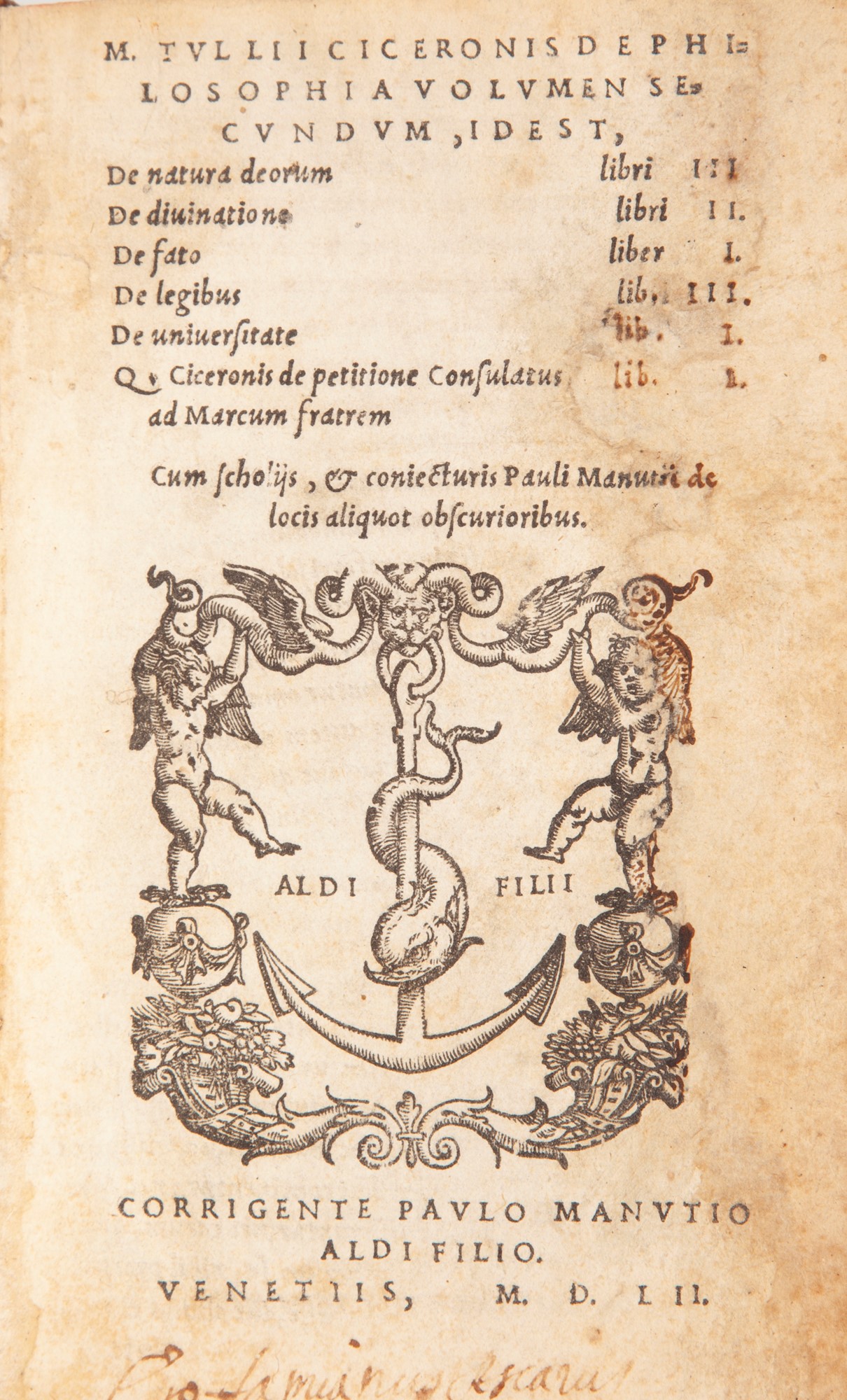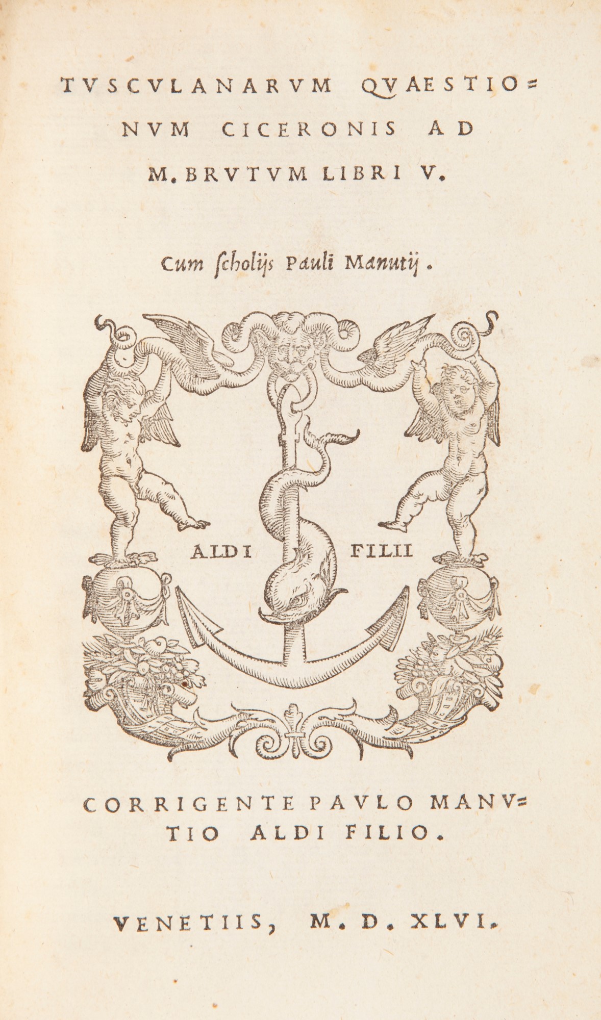 (Aldina) M. Tullii Ciceronis De philosophia, prima pars, id est, academicarum quaestionum editionis primae liber secundus, editionis secundae liber primus, De finibus bonorum & malorum libri V. Tusculanarum quaestionum libri V. Cum scholijs, & coniecturis Paulij Manutij Volumen secundum, id est, De natura deorum lib. III. De divinatione lib. II. De fato lib. I. De legibus lib. III. De universitate lib. I. Q. Ciceronis de Petitione consulatus ad Marcum fratrem lib. I In 8° Due parti con frontespizi autonomi (mancante il primo della prima parte), con le Tuscolane che editorialmente sono parte integrante della prima parte anch'esse munite di autonomo frontespizio. Ancore aldine ai frontespizi e in fine. Non comune riedizione delle opere di Cicerone già stampate nel 1546. Legatura del XIX secolo in mezza pelle con titolo in oro al dorso. Paolo Manuzio, Venezia 1546/52 cm 15,5x10