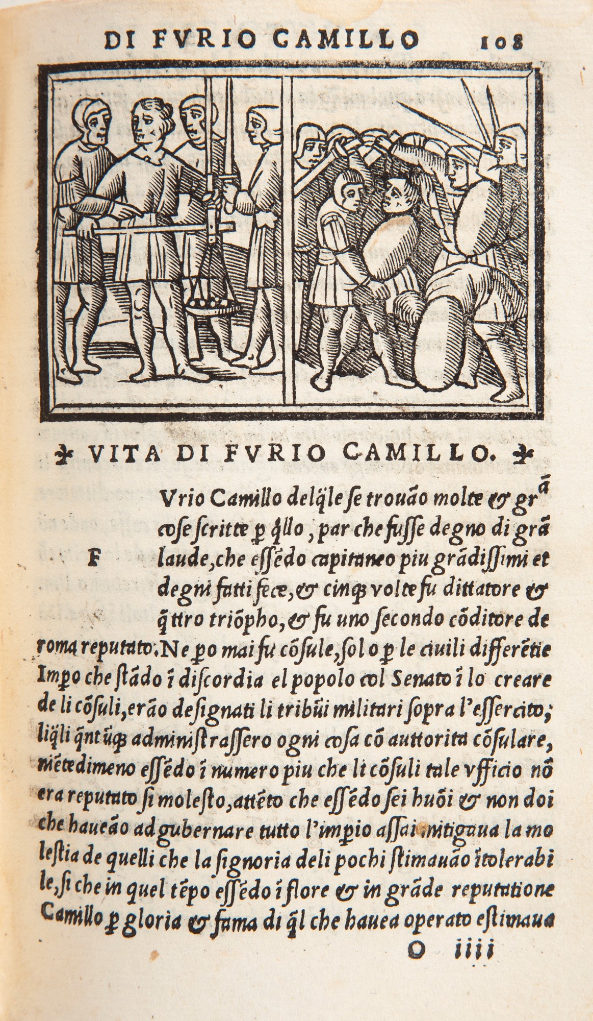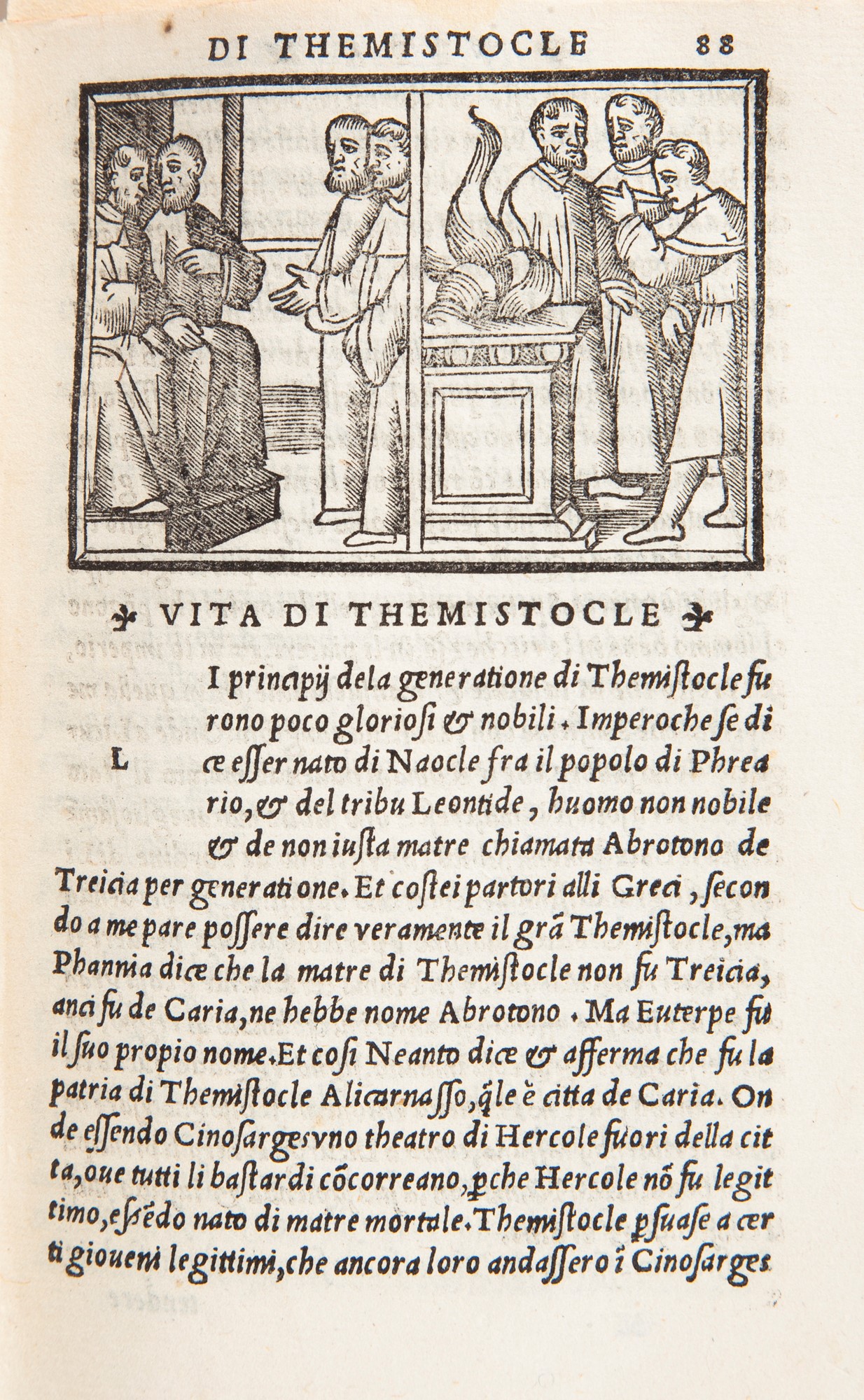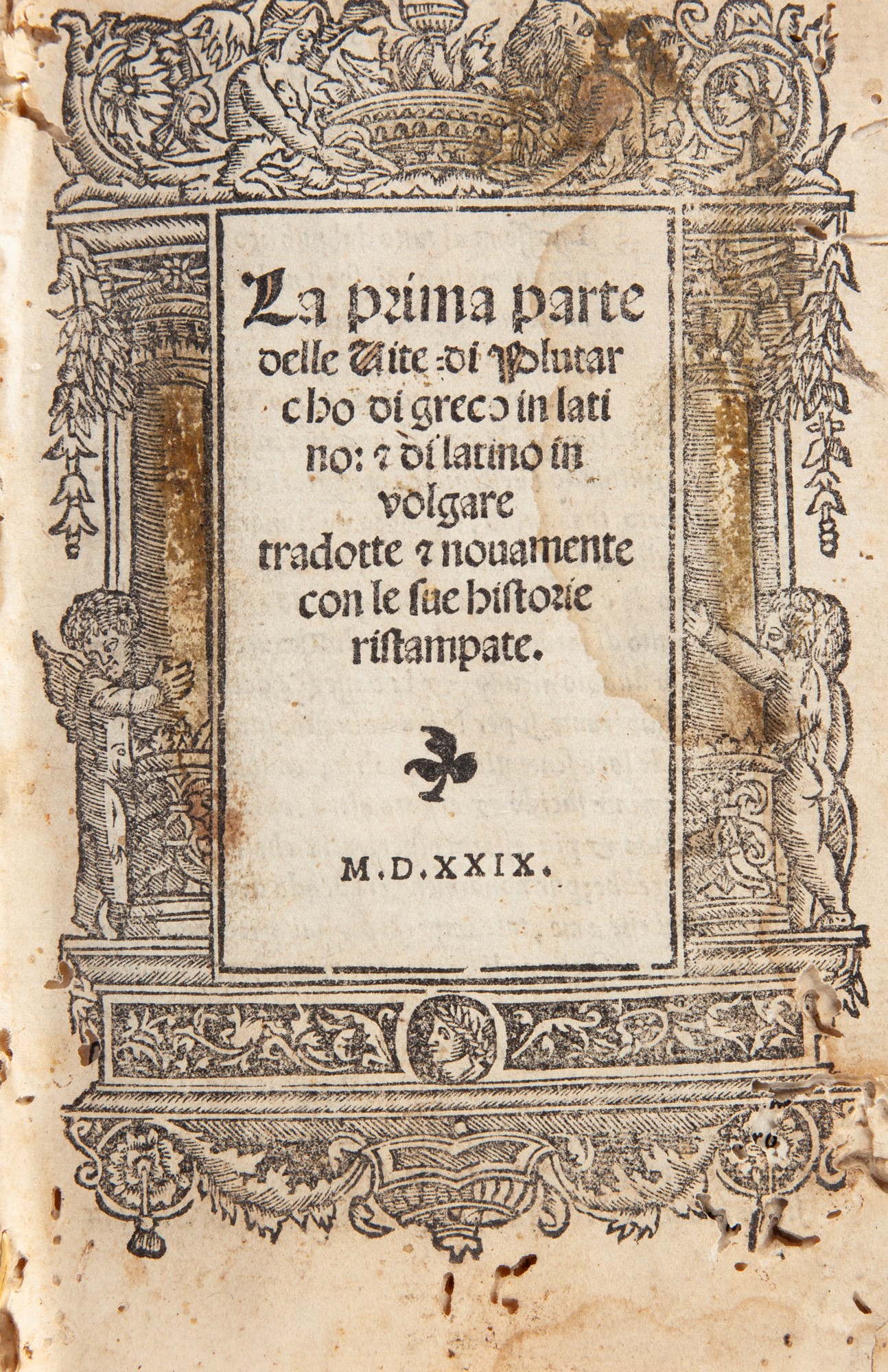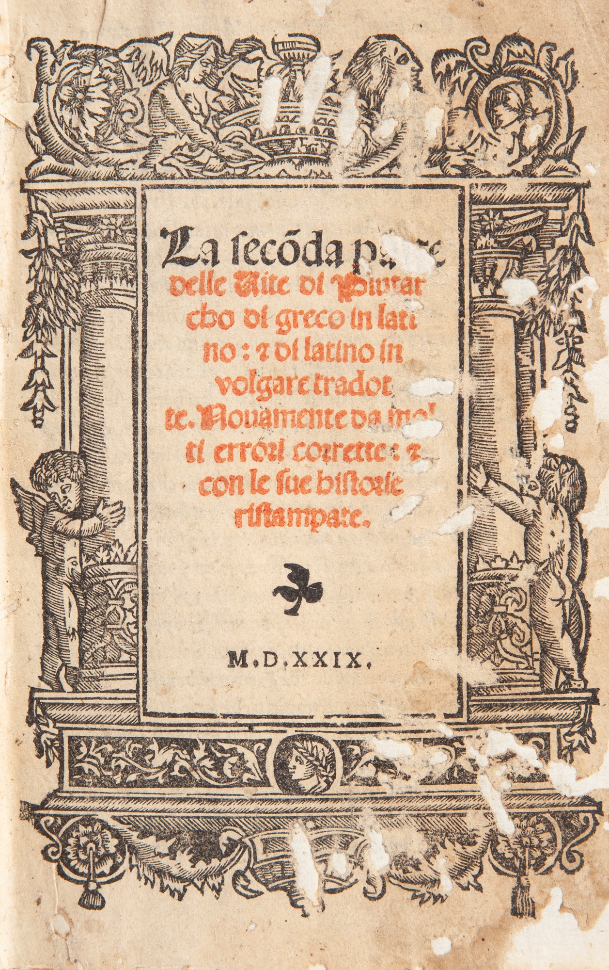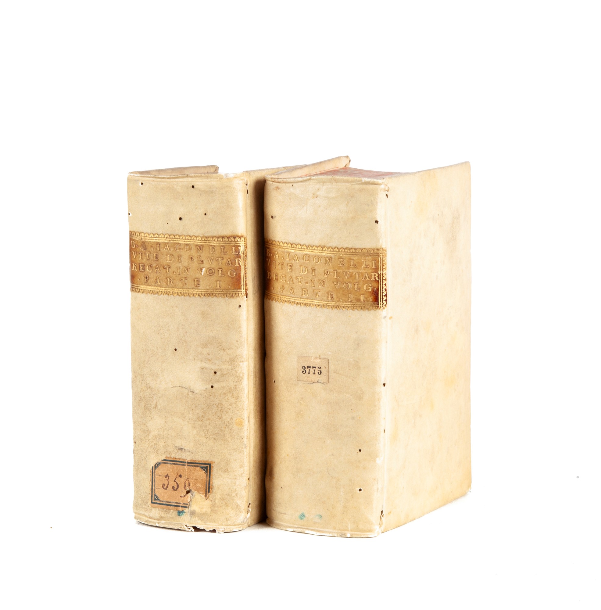 La prima [e La seconda] parte delle vite di Plutarcho di greco in latino: & di latino in volgare tradotte & novamente con le sue historie ristampate 2 volumi in 8°. Illustrato con vignette all'inizio di ogni vita raccontata. Rara edizione in volgare delle Vite, pubblicate per la prima volta nel 1482. Questa traduzione venne realizzata dal mercante di lana reatino Battista Alessandro Iaconelli, ed ebbe grande influenza sulle traduzioni successive. Terminò solo circa la metà del corpus traducendo dalle versioni latine di Filelfo, Bruni, Guarini, Barbaro, ecc... La seconda parte fu invece tradotta da Giulio Bordone ed allegata alla traduzione di Iaconelli dopo il 1525. Legatura in pergamena del XVII secolo con tasselli con titoli in oro ai dorsi. Fori di tarlo che interessano ambedue i frontespizi ed alcune pagine seguenti, con riparazioni novecentesche. Francesco Bindoni & Maffeo Pasini, Venezia 1529 cm 16x11