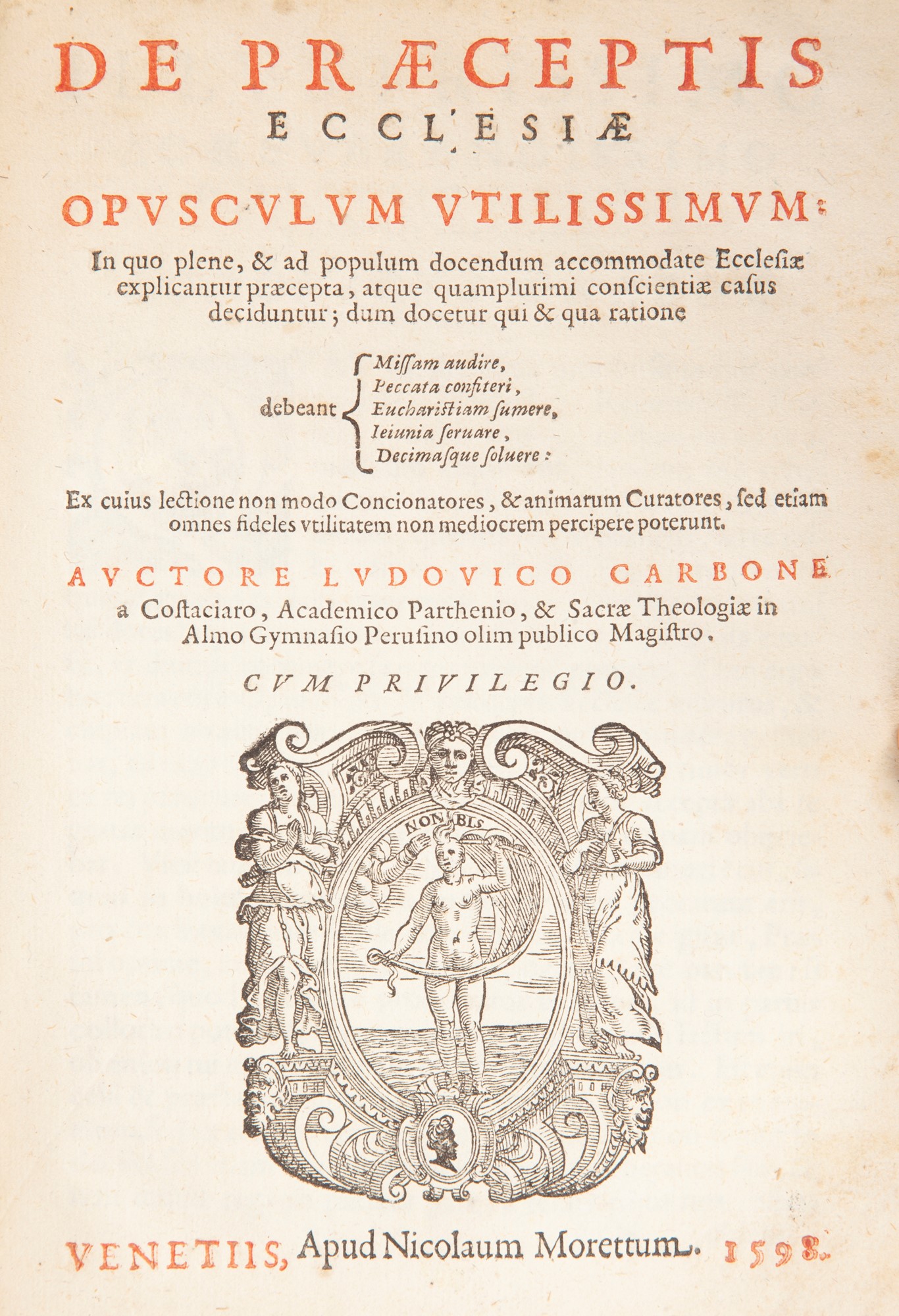Martino Alfonso Vivaldo - Candelabrum aureum Pars Prima - Pars Secunda In 4° Importante opera tardo cinquecentesca di diritto canonico del frate domenicano spagnolo Martin Alfonso Vivaldo (1545 - 1605), pubblicata con una certa frequenza tra la fine del XVI e gli inizi del XVII secolo, qui in una delle prime edizioni veneziane. Legatura in piena pergamena del XVIII secolo con titolo in oro al dorso e con fregi a secco sui piatti. Tagli marmorizzati. Lavori di tarlo evidenti alla fine della Prima parte, all'inizio della Seconda (compreso il frontespizio) ed alla fine. Venezia 1598 cm21x15,5