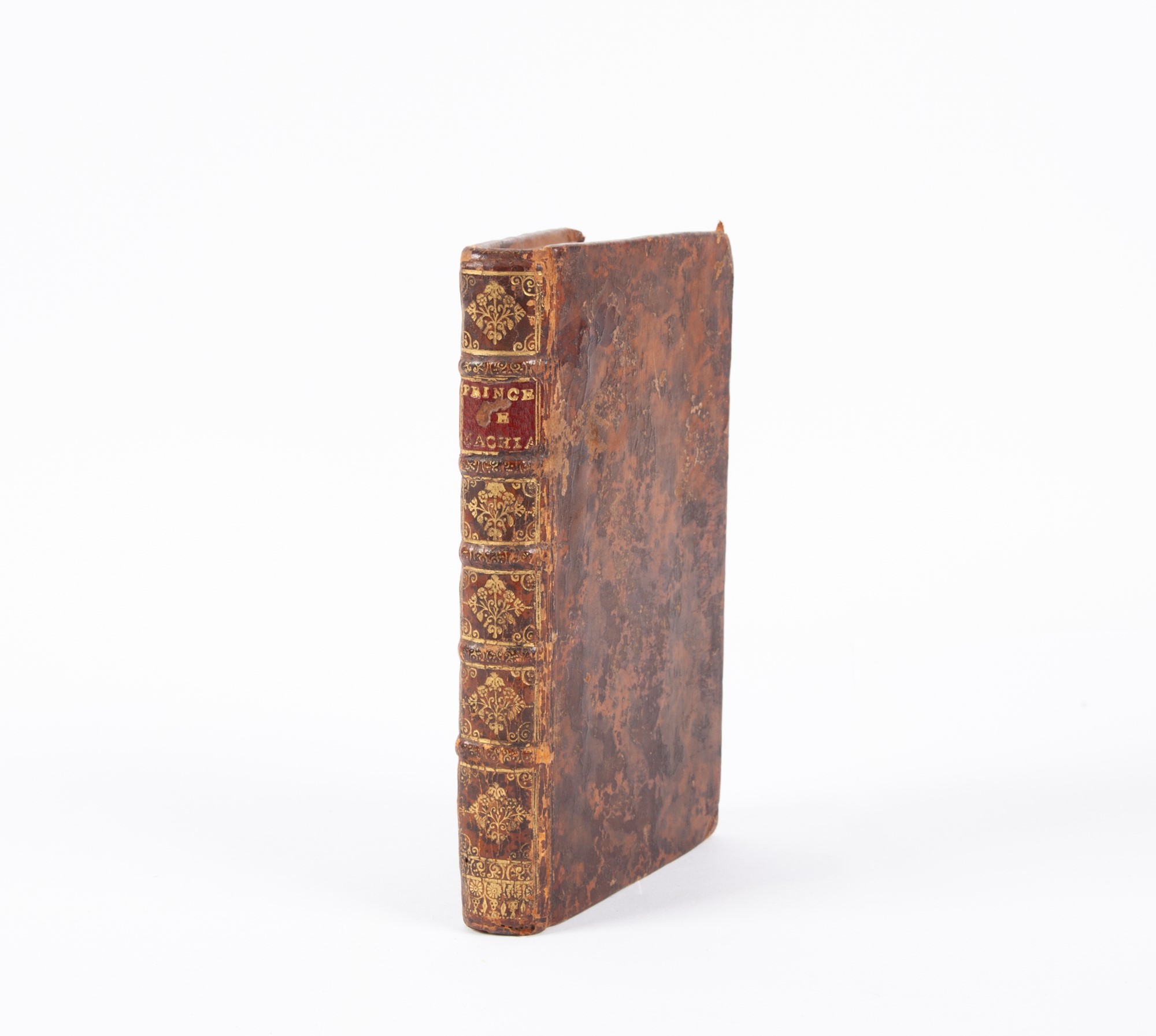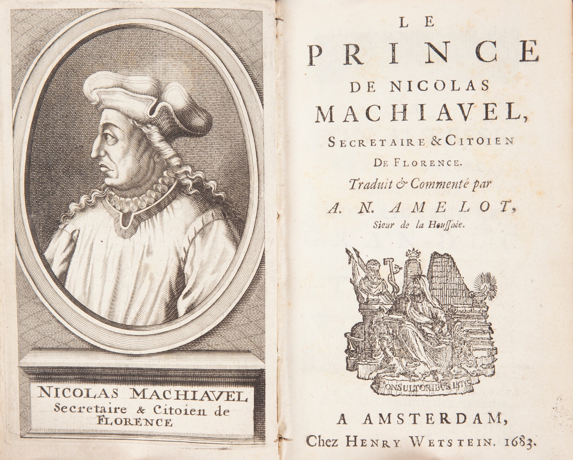 Le Prince de Nicolas Machiavel Secretaire & citoien de Florence Traduit & Commenté par A.N. Amelot In 8° piccolo. Ritratto inciso in antiporta. Rara prima edizione di questa traduzione del "Principe" di Amelot de la Houssaye (1634-1706), allora segretario d'ambasciata a Venezia, che Voltaire fece studiare a Cristina di Svezia e a Federico di Prussia. Legatura coeva in vitello spruzzato con titolo e fregi in oro al dorso. Tagli rubricati. Henry Wetstein, Amsterdam 1683 cm 16,5x10,5