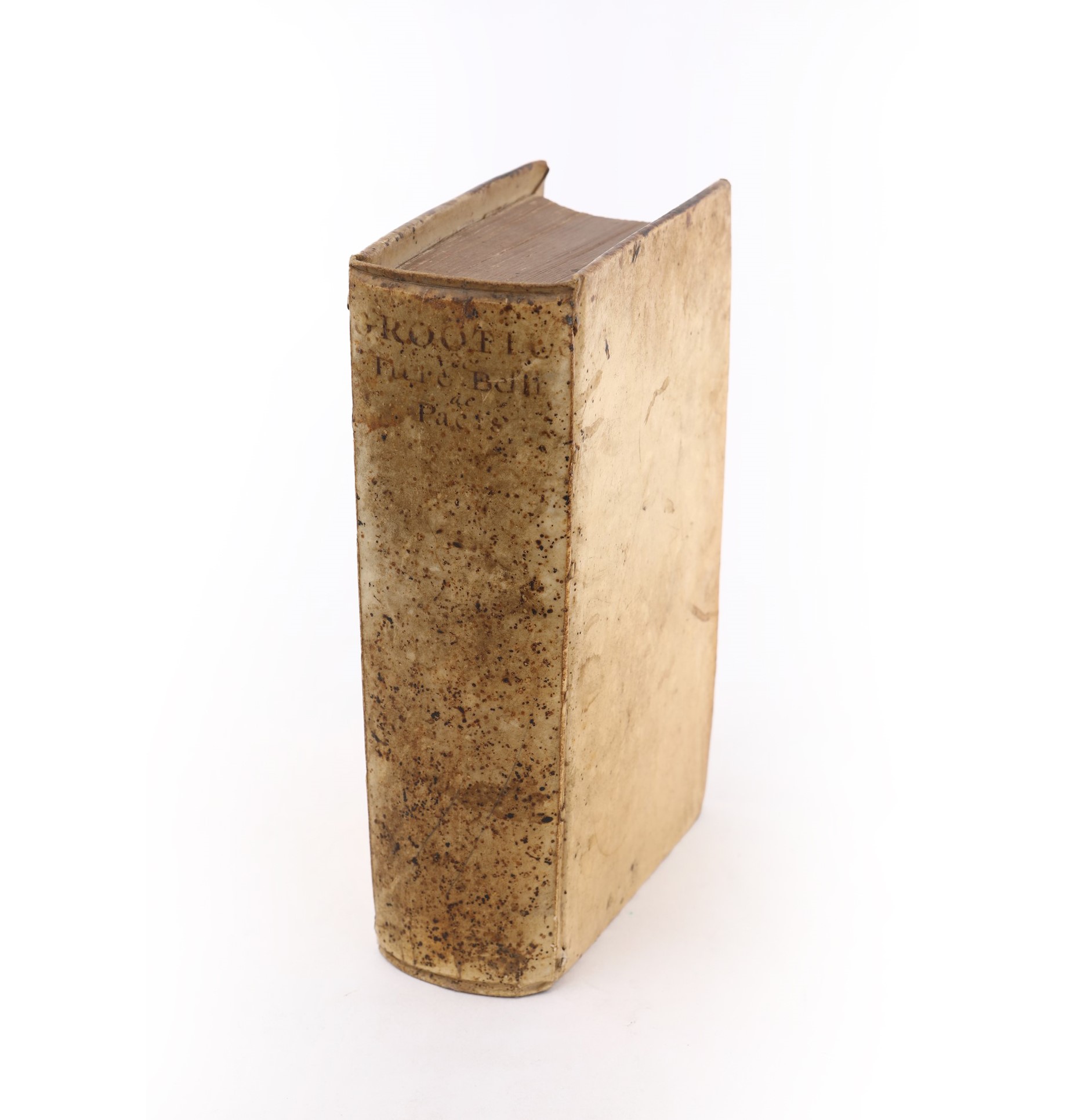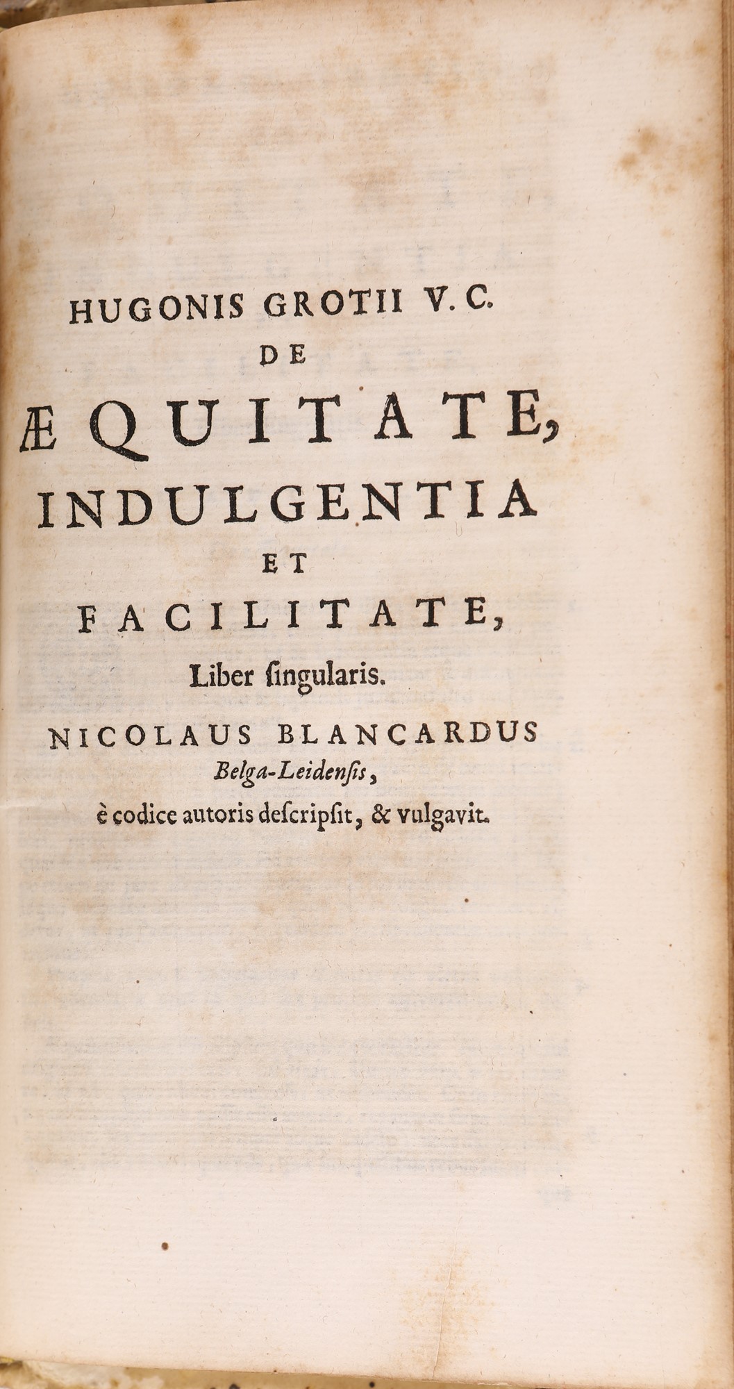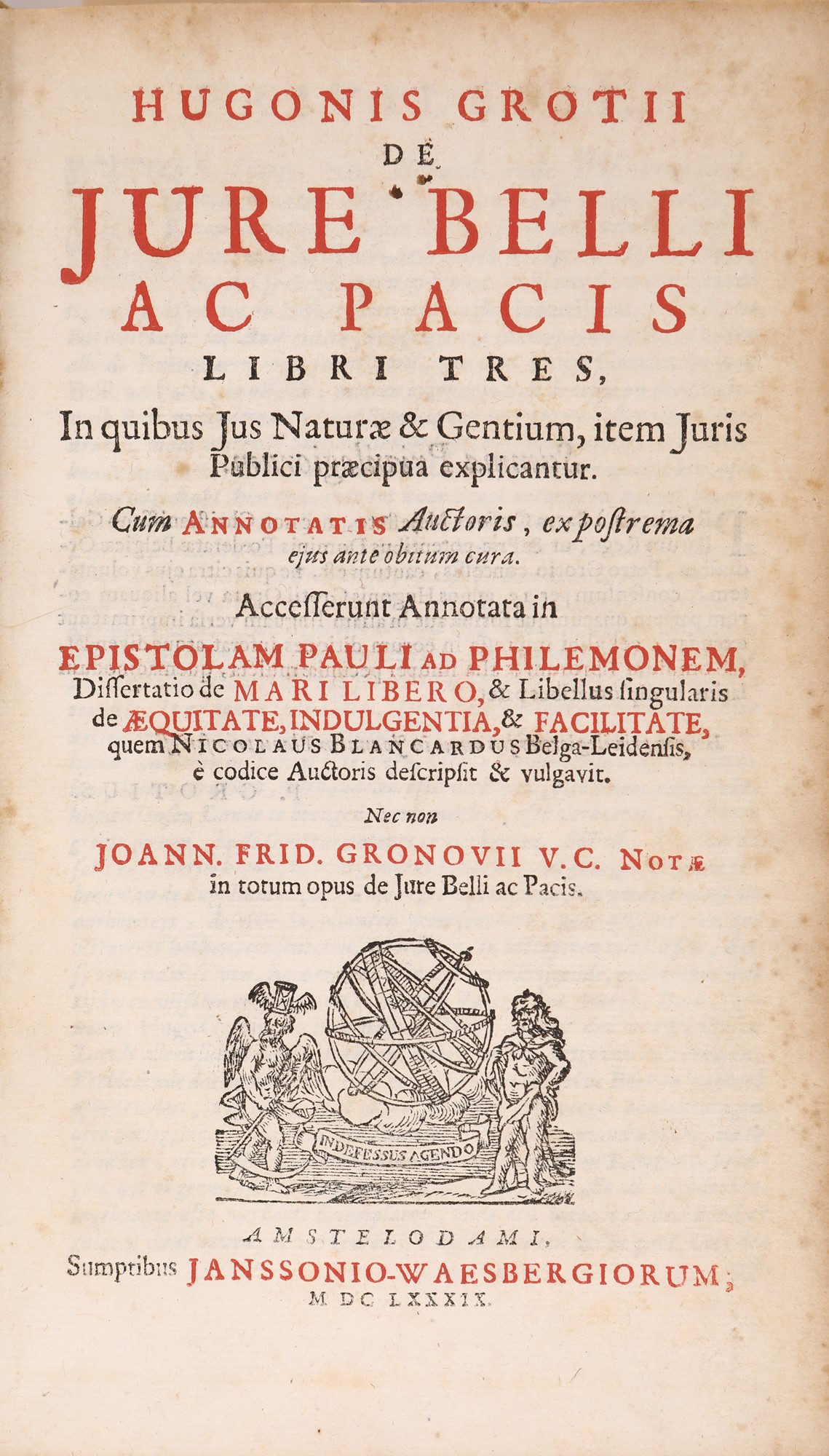 Hugonis Grotii (Hugo Grotius / Ugo Grozio) - De Jure belli ac pacis libri tres. In quibus Jus Naturae & Gentium, item Juris Publici praecipua explicantur In 8° Ritratto del Grozio in antiporta e frontespizio inciso con figurazioni allegoriche. Bella ristampa di Amsterdam (la prima Parigi 1625) del capolavoro del giurista e filosofo olandese, opera fondante del giusnaturalismo moderno in una serrata indagine sui fondamenti dell'autorità statale, do si confutano le basi teologiche della stessa e si cerca di porla su principi razionali e naturali. Edizione annotata da Johannes Fredericus Gronovius; seguita dal "Commentatio in Epistolam Pauli Apostoli ad Philemonem", "De Mari Libero", "De Aequitate, Indulgentia, et Facilitate, Liber singularis" (trattato dato alla luce da Nicolas Blankaart). Legatura in piena pergamena coeva con titolo manoscritto al dorso. Janssonio-Waesbergiorum, Amsterdam 1689 cm 21x13