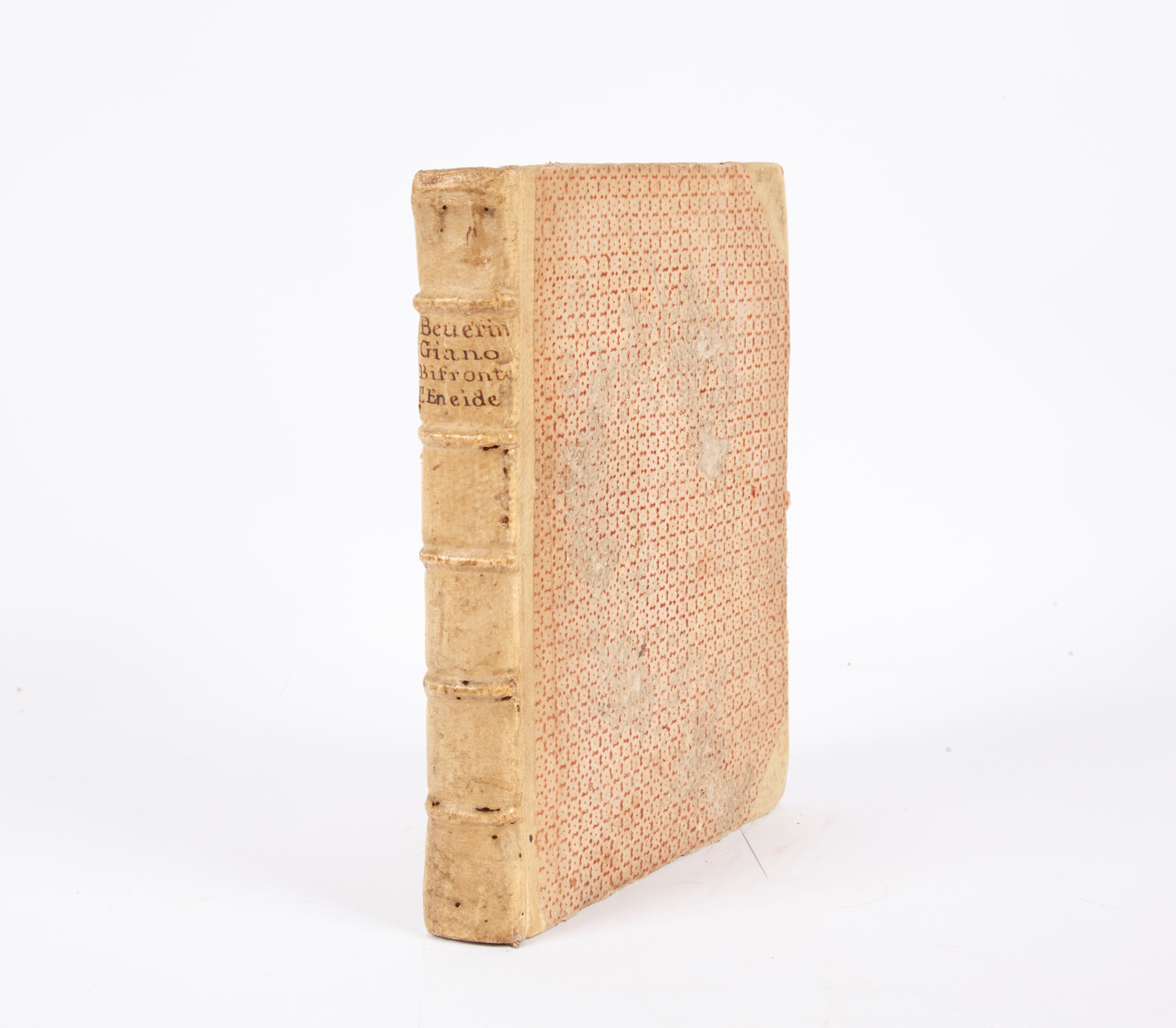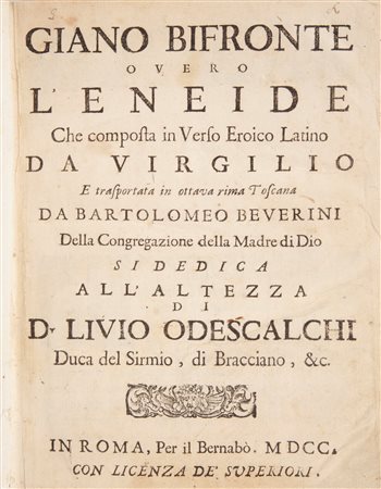 Giano bifronte overo l'Eneide che composta in Verso Eroico Latino da Virgilio e trasportata in ottava rima toscana da Bartolomeo Beverini In 4° Testo su due colonne. Questa traduzione in volgare uscì per la prima volta a Lucca nel 1680, la presente edizione ''è fatta con molto decoro e data fuori dal padre Alessandro del Poggio, col testo latino a fronte, Gli Argomenti in ottava rima sono di Donato Ant. Leonardi.'' Assai stimata dal Redi e dal Gravina che la ritenne superiore a tutte per la piacevolezza dell'armonia. Legatura coeva in mezza pergamena a 5 nervi, con angoli in pergamena e titolo manoscritto al dorso. Bernabò, Roma 1700 cm 24x18,5