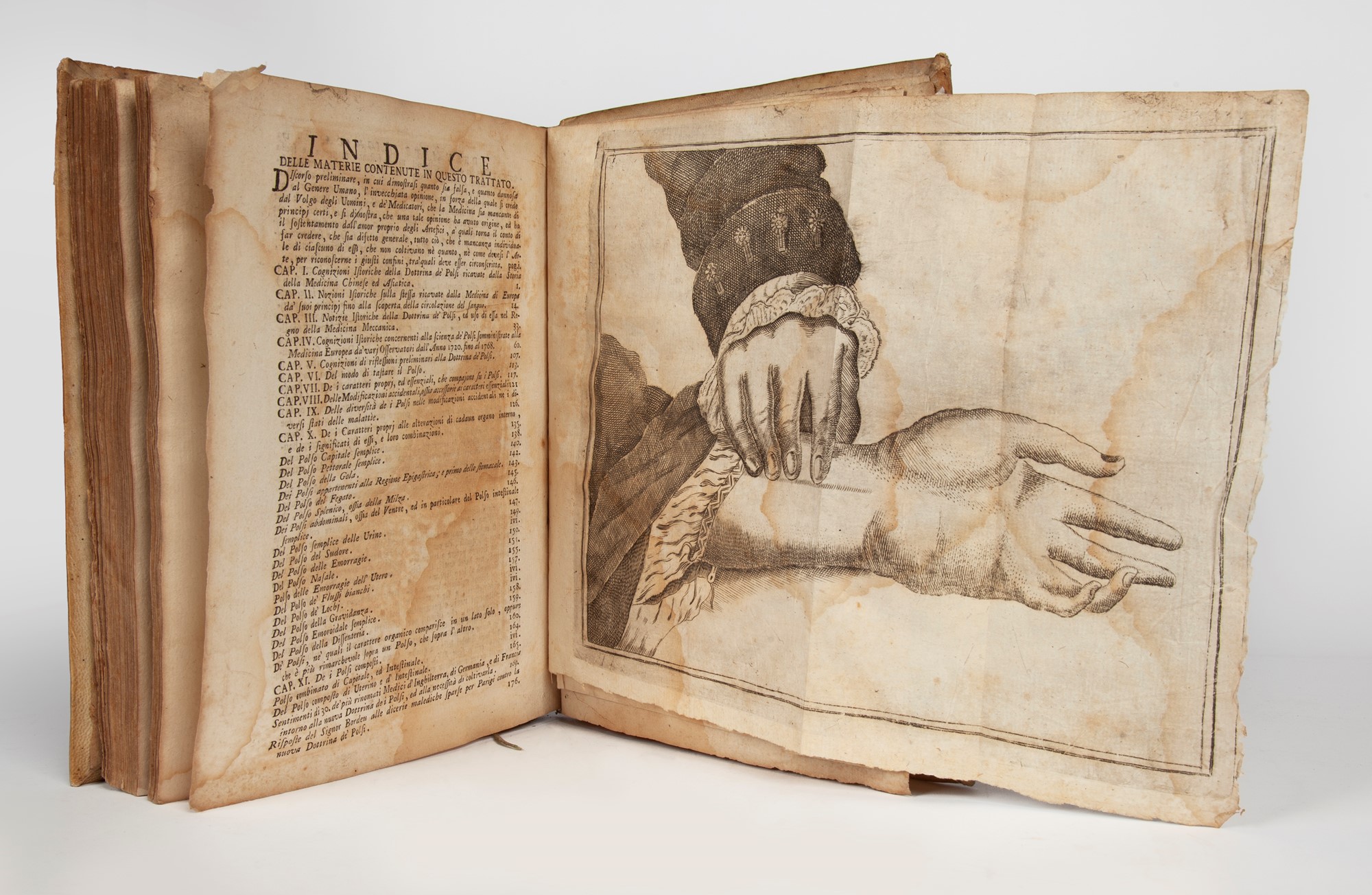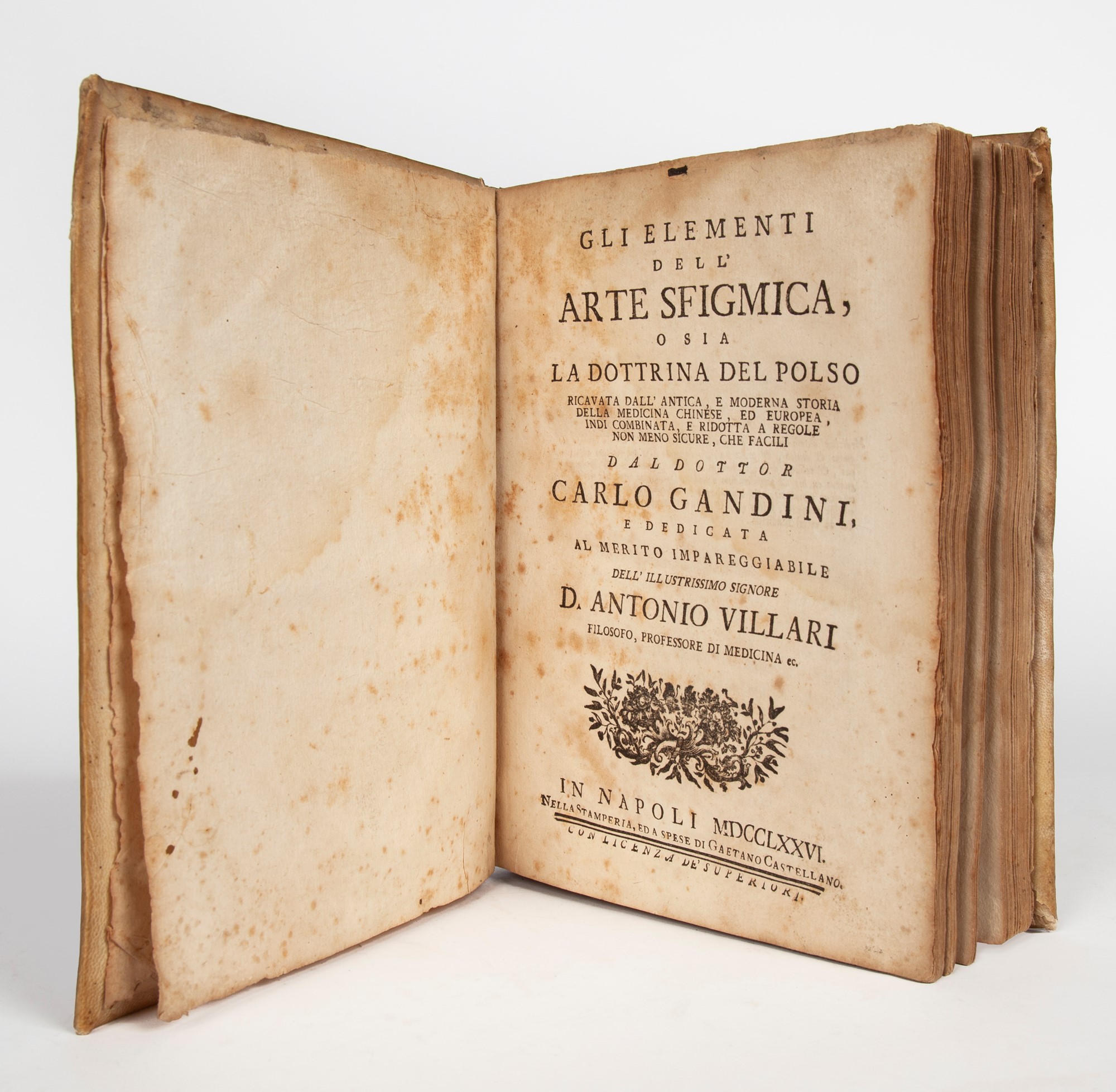 Carlo Gandini - Gli elementi dell'arte sfigmica o sia la dottrina del polso Ricavata dall'antica e moderna storia della medicina chinese ed europea, indi combinata, e ridotta a regole non meno sicure, che facili. In 4°. (4),XX,179,(1) pagine, testo su 2 colonne con note in calce. Con 2 tavole raffiguranti la presa del polso per la verifica della pulsazione e la tipologia di vene del polso. Edizione napoletana successiva alla prima genovese del 1769 con un'ampia disquisizione del celebre medico veronese sulla dottrina dei polsi con richiami alla medicina cinese ed asiatica ad alla scuola europea. Come tecnica ermeneutica, il metodo polsistico da lui adottato si avvicinava a quello illustrato dal Bordeu. Assumeva un valore altamente formativo per i giovani medici che potevano così osservare le variazioni fisiologiche normali e la comparsa di stati patologici, apprendendo a discernere i segni della malattia con l'esame dei metodi diagnostici e le caratteristiche delle alterazioni di ciascun organo interno. Legatura coeva in piena pergamena (difetti) con titolo in oro al dorso. Gaetano Castellano, Napoli 1776 cm 23,5x18,5