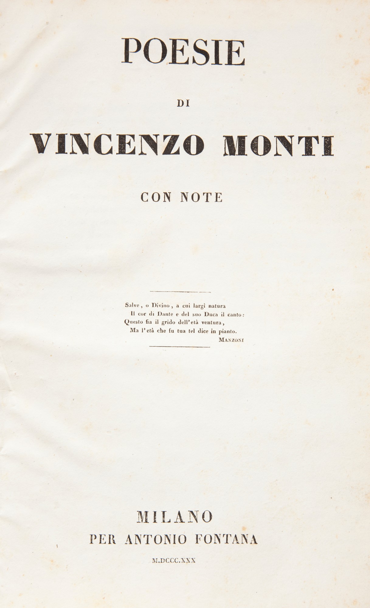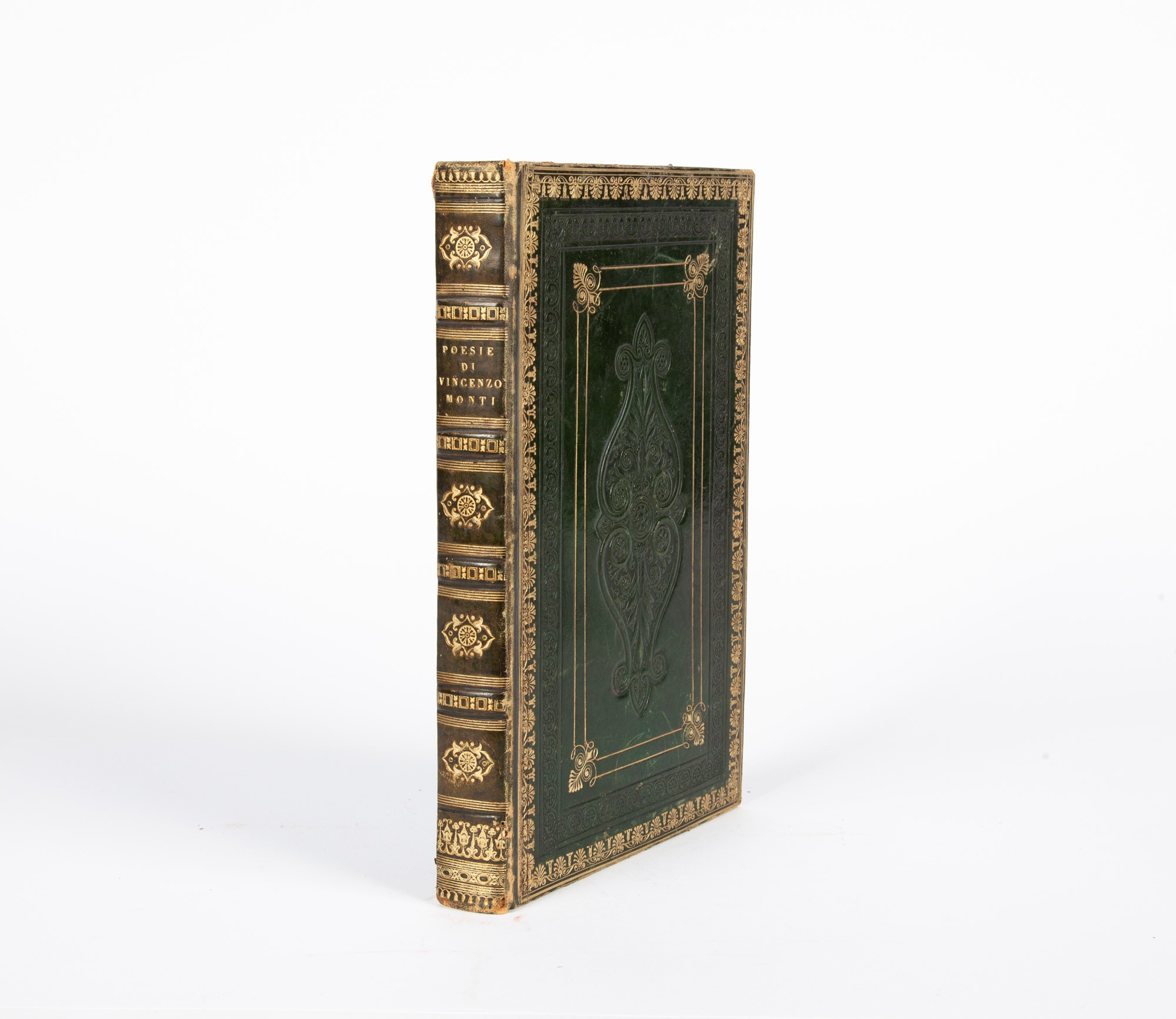 Poesie di Vincenzo Monti con note In 8° Testo su due colonne. L'apparato delle note è al fine, contiene la traduzione dell'Iliade di Omero, In morte di Ugo Bassville, le Elegie, Canzoni per le nozze, le Tragedie ed altre poesie minori. Splendida legatura in marocchino verde con fregi incisi a secco e in oro ai piatti e titoli e fregi in oro al dorso. Tagli spruzzati. Antonio Fontana, Milano 1830 cm 23x15