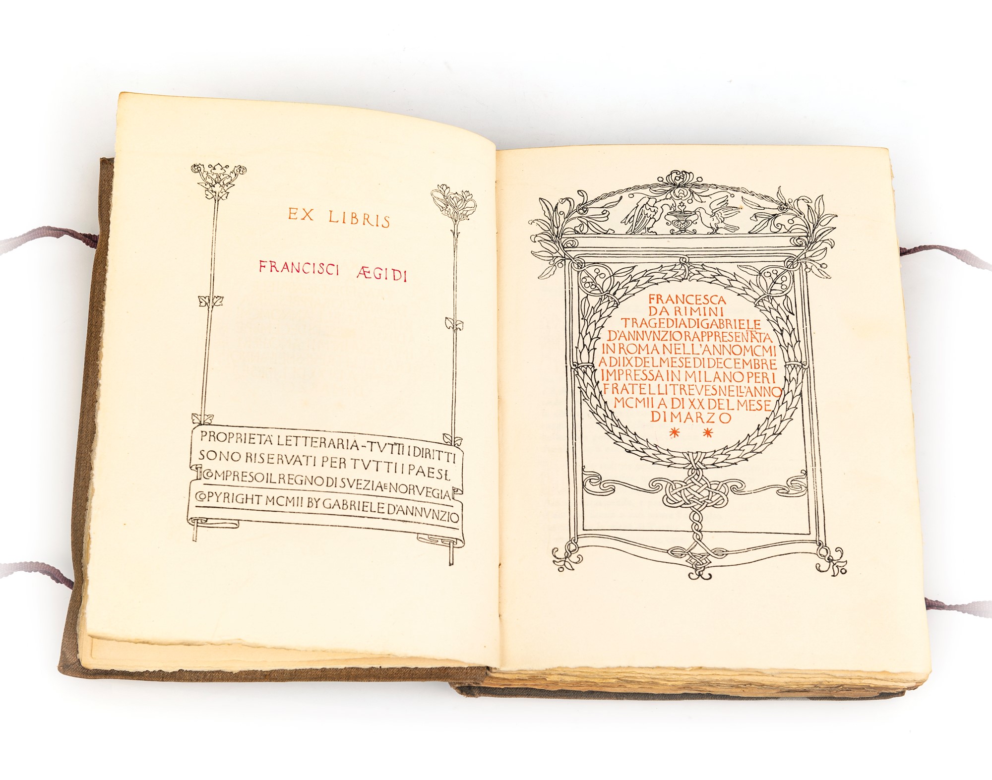 Gabriele D'Annunzio - Francesca da Rimini Tragedia Rappresentata in Roma nell'anno MCMII al dì IX del mese di dicembre Provenienza: Collezione Eredi Ettore Modigliani - Milano. Considerata un capolavoro dell'editoria italiana primo-novecentesca, l'opera vide l'esordio di Adolfo De Carolis come illustratore dannunziano per eccellenza. Il volume con le sue caratteristiche editoriali rappresenta a pieno titolo un esempio del revival del gusto antiquario per gli incunaboli. Edizione in barbe. Legatura editoriale in piena tela grezza flessibile con legacci integri in stoffa verde Al piatto anteriore impressa in oro una corona d'alloro con al centro un libro trafitto da una spada e la citazione dantesca "Noi leggevamo", titoli in oro al dorso. Fratelli Treves, Milano 1902 cm 24,5x19