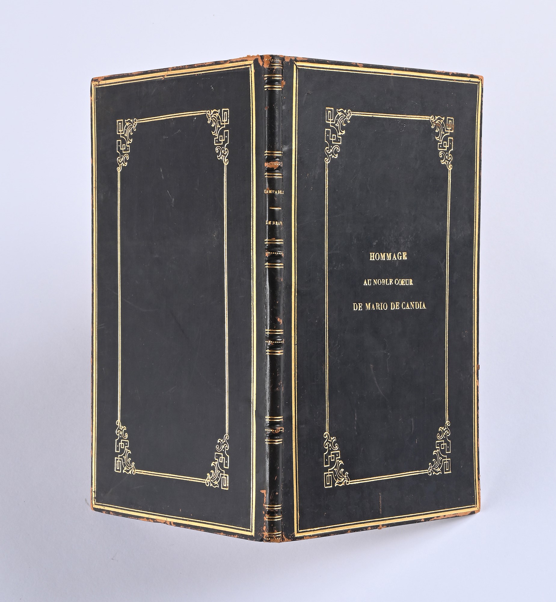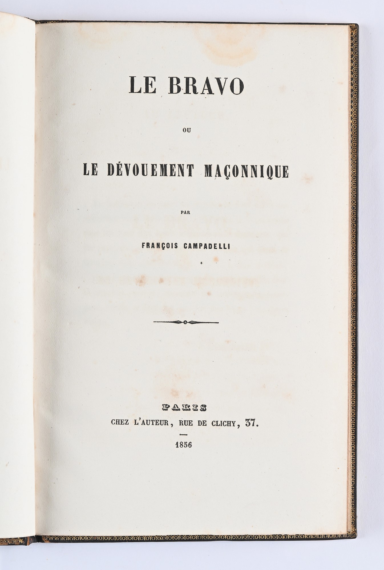 Francesco Campadelli - Le Bravo Ou le Dévouement maçonnique In 8° Interessante pubblicazione ottocentesca contenente l'Ode alla Frammassoneria. Bella legatura in vitello marrone coeva a 4 nervi con titoli e fregi in oro al dorso e ai piatti, e tagli dorati, omaggio a Mario De Candia, tenore e patriota italiano, considerato uno dei più famosi cantanti italiani dell'Ottocento. Chez l'Auteur, Parigi 1856 cm 21,5x14